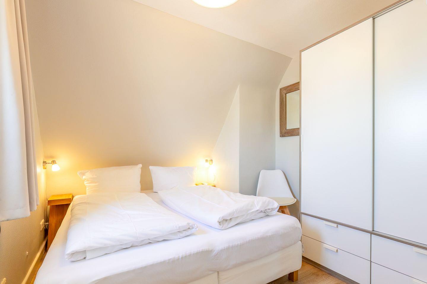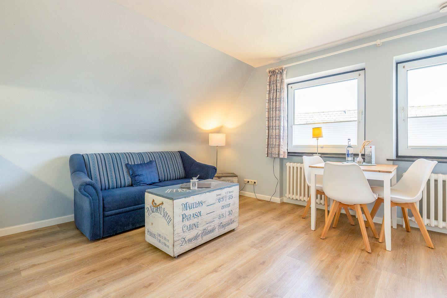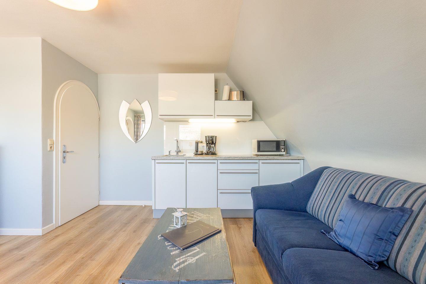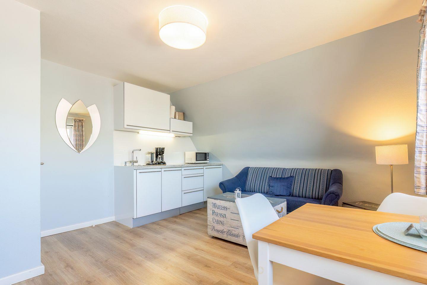 Hier lässt es sich perfekt blau machen: das ganz in Wasserfarben und Weiß gehaltene Wohnzimmer wirkt aufgeräumt und dennoch gemütlich. Die moderne Küchenzeile schmiegt sich elegant an die Wand und der kleine Esstisch bietet einen Blick aus dem Fenster. Auch das angrenzende Schlafzimmer ist dank seiner warmen Farben und des komfortablen Doppelbetts ein entspannter Rückzugsort.