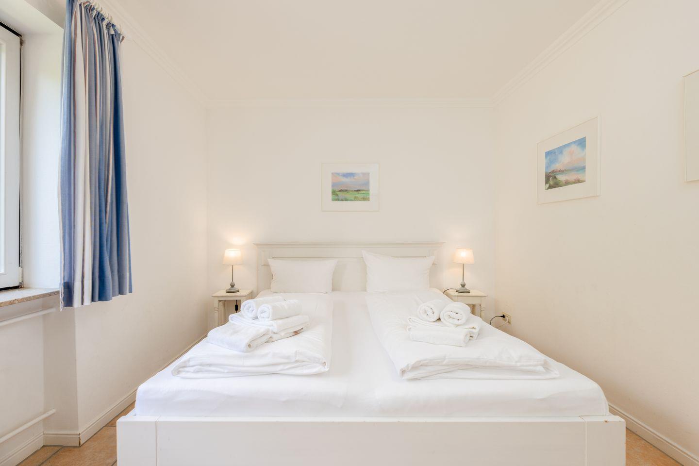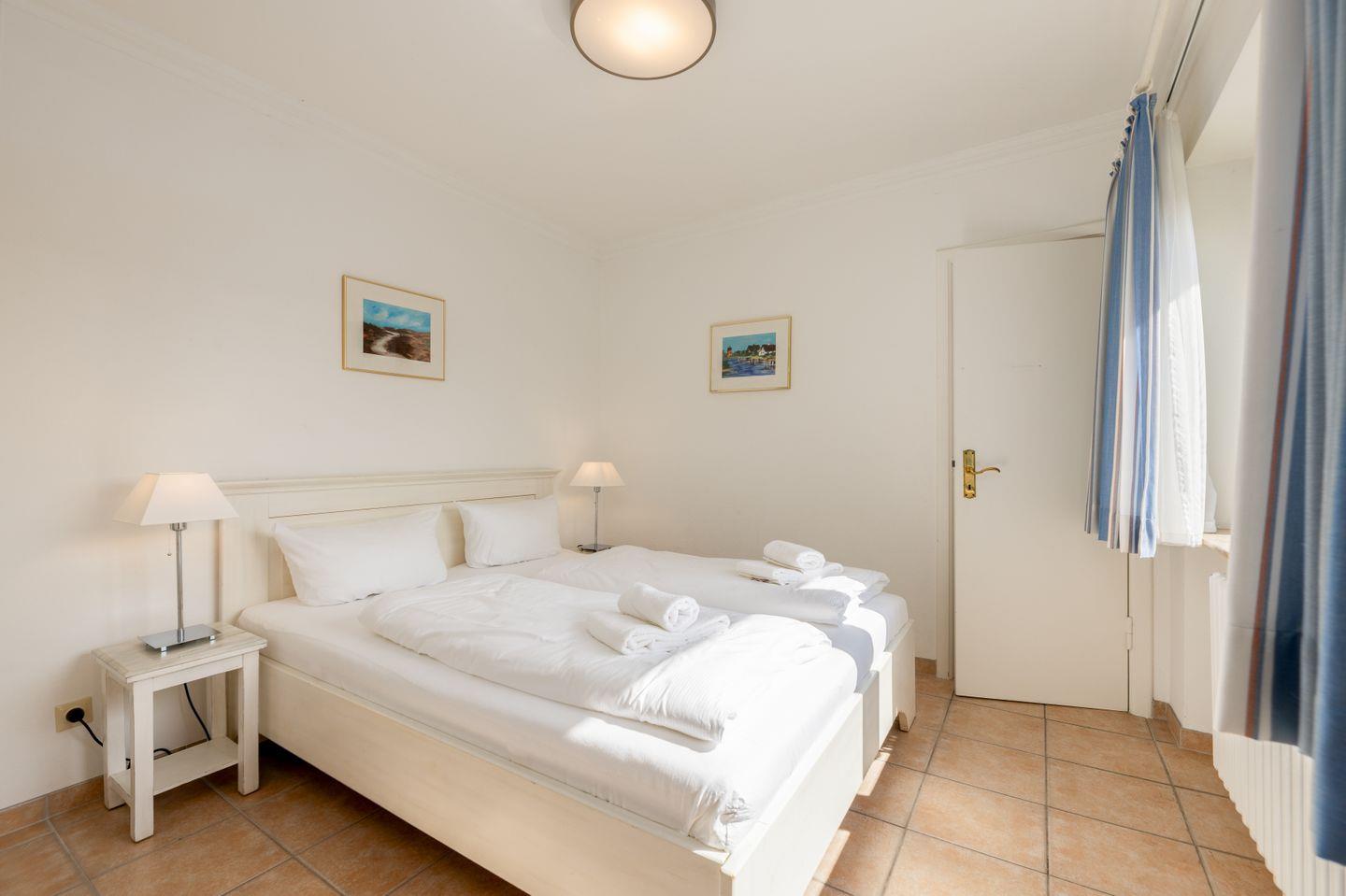 Der gut geschnittene Wohnbereich umfasst eine gemütliche Couch, einen Esstisch sowie eine Küchenzeile. Die beiden Schlafzimmer sind ganz in Weiß gehalten und verfügen über komfortable Doppelbetten. Eins der Schlafzimmer hat ein Gäste-WC en Suite und zusätzlich gibt es noch ein kleines Duschbad.