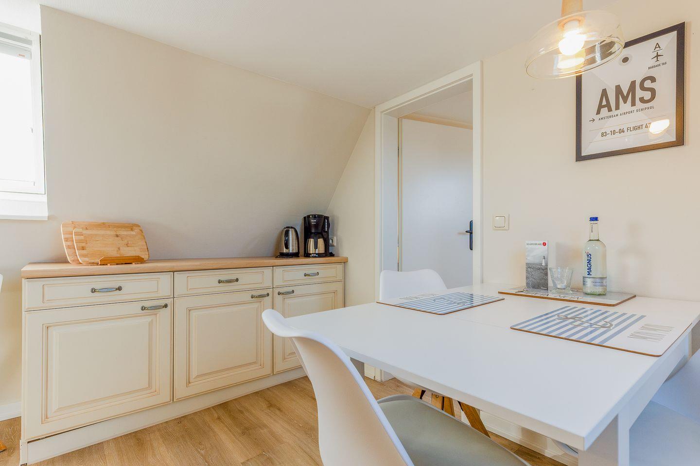 Der Schnitt des Appartements ist ungewöhnlich und kreativ wie die niederländische Hauptstadt: Das Schlafzimmer mit seinem komfortablen Polsterbett befindet sich in der 1. Etage und punktet mit viel maritimer Gemütlichkeit. Eine (etwas steile) Treppe höher führt ein langer Flur durch die Küche mit Essbereich in das helle und einladende Wohnzimmer. Auf der anderen Seite des Flurs wartet ein weiteres Schlafzimmer mit zwei Einzelbetten sowie ein modernes, helles Bad mit Walk-in Dusche (aufgrund der etwas niedrigeren Deckenhöhe für größere Menschen nicht geeignet).