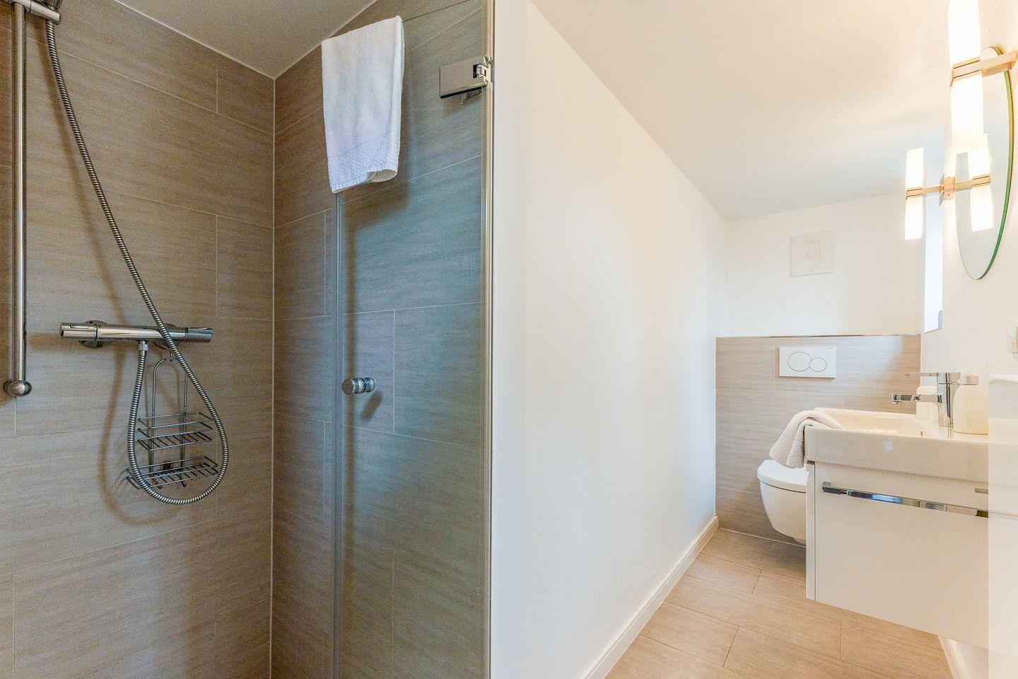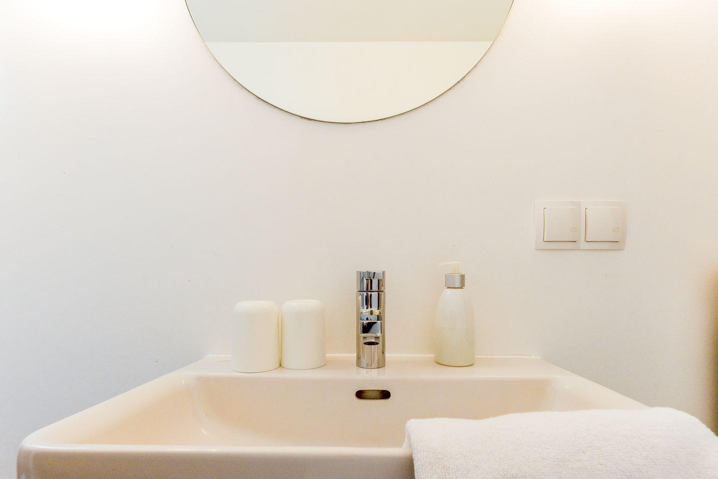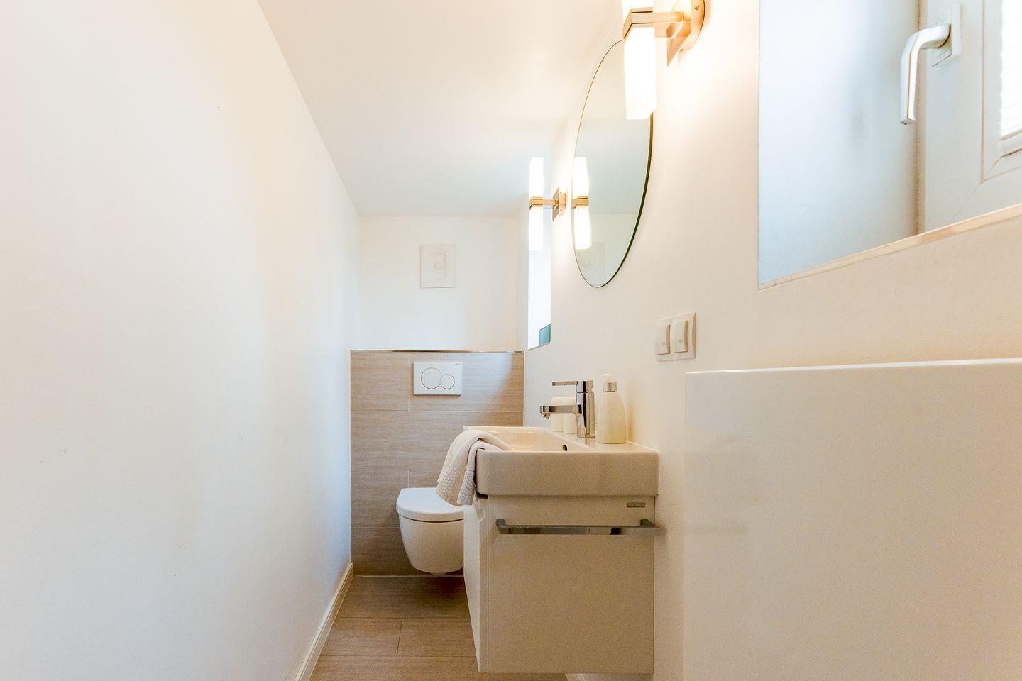 Das stylische Duschbad macht mit seinen sandfarbenen Fliesen und den goldenen Accessoires schon beim Aufwachen Lust auf einen sonnigen Strandtag.