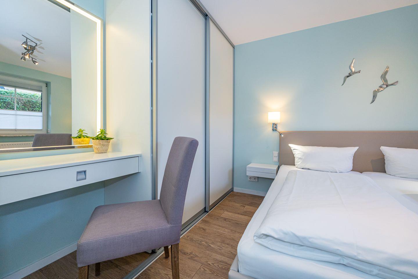 Der großzügig geschnittene Wohnbereich besteht aus einer kleinen Chillout-Ecke mit Schlafcouch sowie einem Esstisch nebst hochwertig ausgestatteter Küchenzeile. Die bodentiefen Fenster sind zugleich der Austritt auf die Terrasse (Westlage), auf der es sich im Sommer perfekt im Strandkorb relaxen lässt. Nebenan im Schlafzimmer steht ein hochwertiges Boxspringbett und - zur Freude der Damen - gibt es hier sogar einen kleinen Schminktisch.