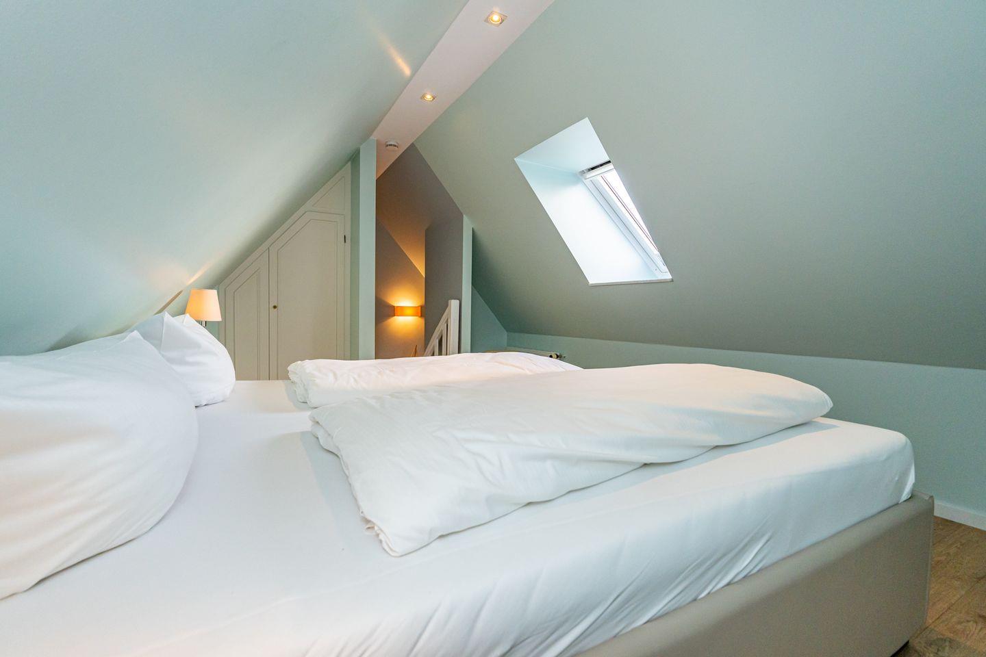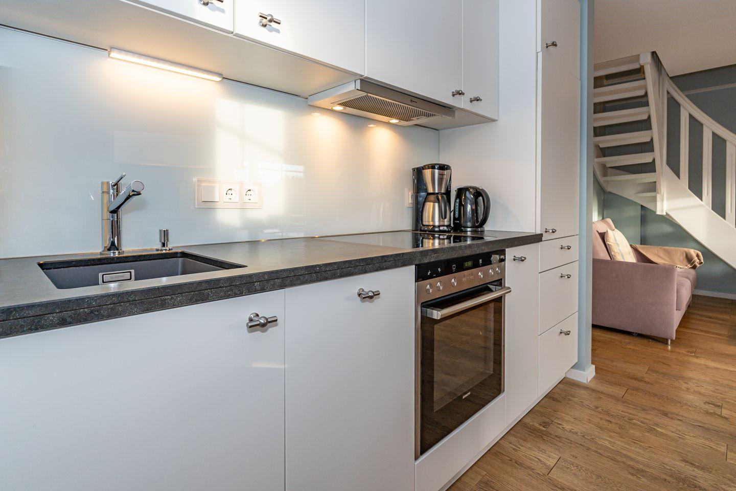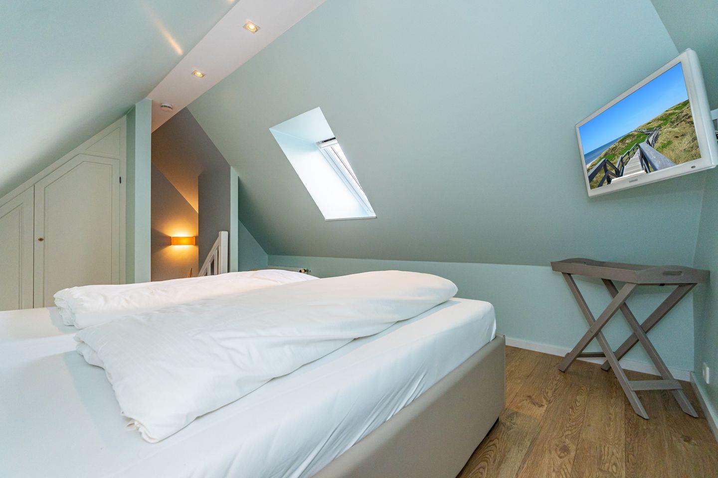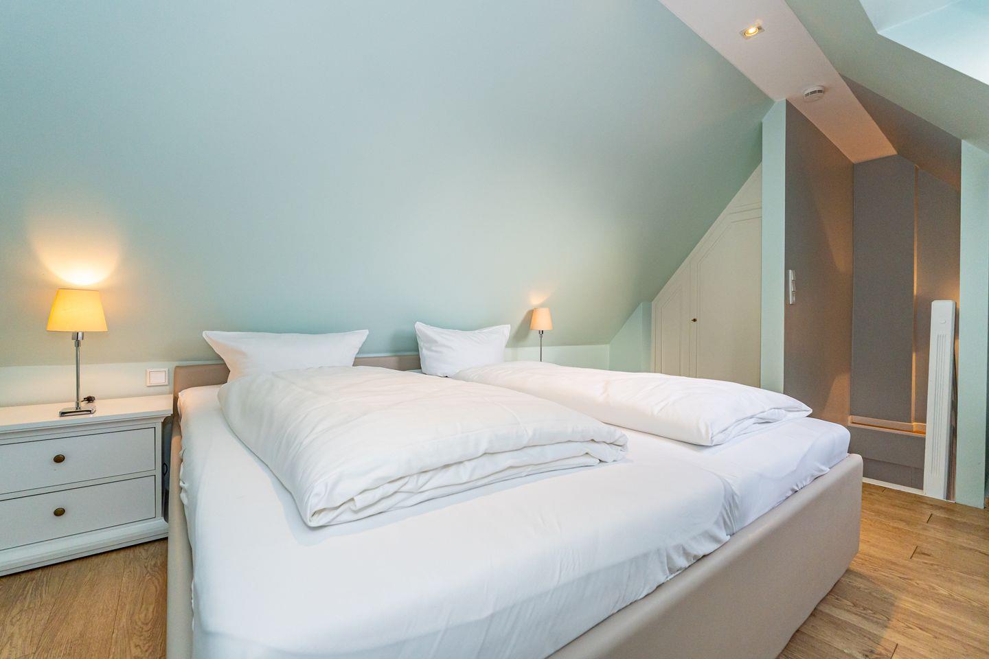 Der gemütliche Wohnbereich besteht aus einer kleinen Chillout-Ecke mit Couch sowie einem Esstisch nebst hochwertig ausgestatteter Küchenzeile. Die bodentiefen Fenster sind zugleich der Austritt auf den Balkon (Westlage), auf dem es sich im Sommer perfekt relaxen lässt. Nebenan im Schlafzimmer stehen zwei einzelne Boxspringbetten und ein großes Boxspringbett lädt eine Etage höher zum Schlummern wie im 7ten Himmel ein.