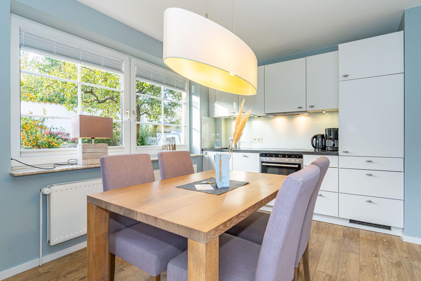 Der großzügig geschnittene Wohnbereich besteht aus einer kleinen Chillout-Ecke mit Schlafcouch sowie einem Esstisch nebst hochwertig ausgestatteter Küchenzeile. Die bodentiefen Fenster sind zugleich der Austritt auf die Terrasse (Südlage), auf der es sich im Sommer perfekt im Strandkorb relaxen lässt. Nebenan im Schlafzimmer steht ein hochwetiges Boxspringbett und - zur Freude der Damen - gibt es hier sogar einen kleinen Schminktisch.