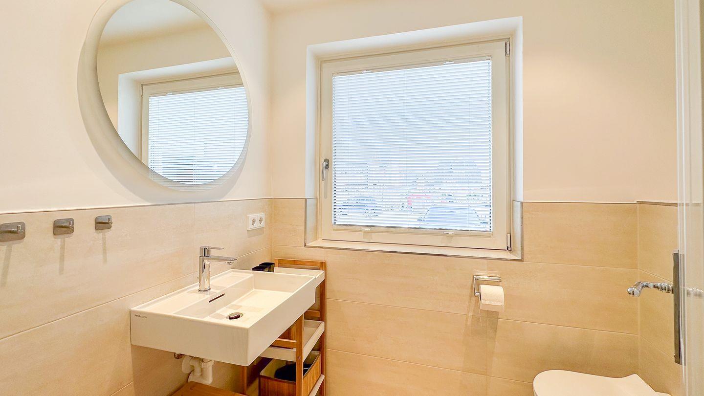 Auch im Schlafzimmer wird der Blick auf das Wesentliche gelenkt: ein gemütliches Doppelbett und praktische Einbauschränke, mehr braucht es nicht zum seligen Schlummern. Wenn dann der nächste Tag anbricht, sorgt das ganz in Sandtönen gehaltene Bad bereits für Vorfreude auf den Strand. Bereit, in den Flow zu kommen?