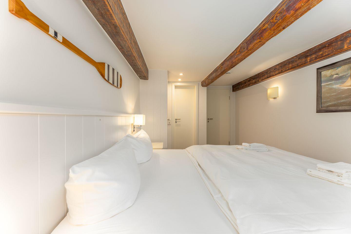 Ganz in Weiß und als Kontrast dazu ein Holzboden und Deckenbalken präsentiert sich der Admirals Room als cosy Doppelzimmer.