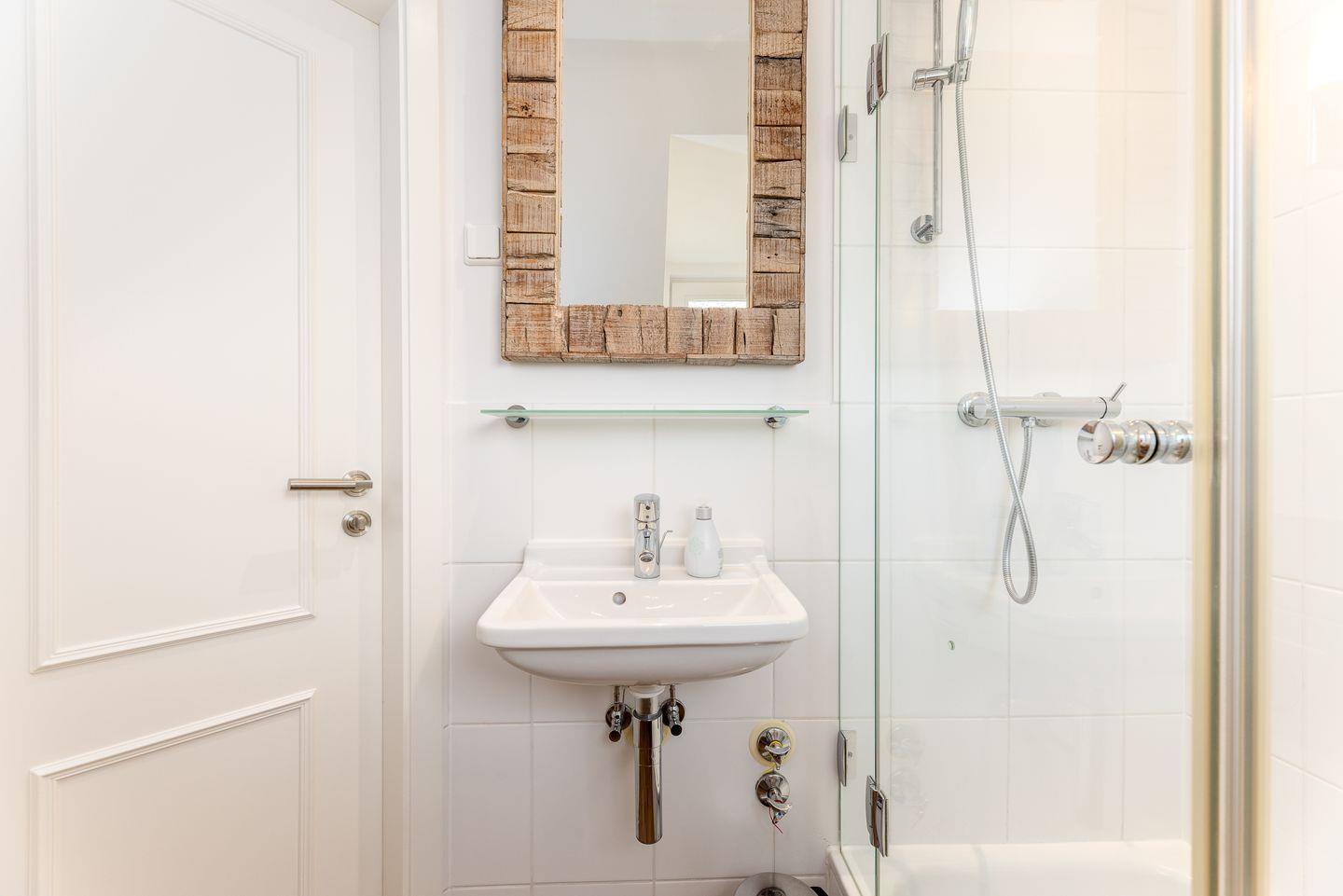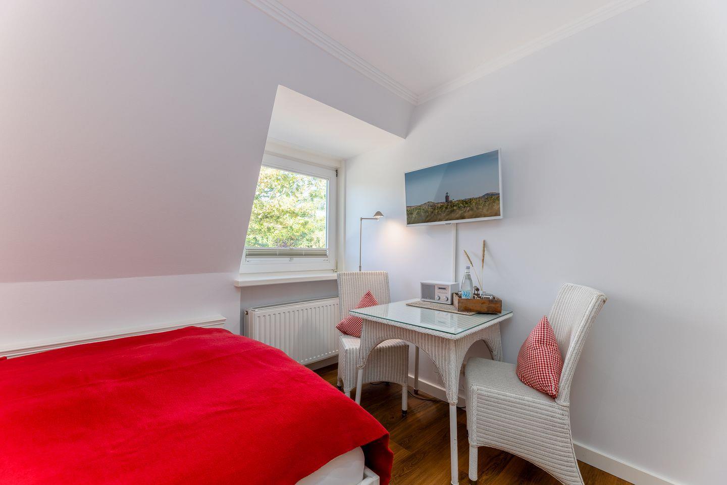 Hier wurde alles passgenau vom Tischler angefertigt und der Raum dadurch aufs Beste genutzt. Kein Schnickschnack nur ein paar ausgewählte maritime Accessoires lenken den Blick auf das Wesentliche, in diesem Fall das gemütliche Doppelbett (1,40 x 2,00m) samt seiner rückenfreundlichen Matratze. Dazu noch ein Einbauschrank, der genug Platz für die Urlaubsgarderobe bietet sowie ein kleiner Tisch mit Stühlen. In dem modernen Duschbad werden mit Sand und Weiß sanfte Töne angeschlagen und der Start in den Tag könnte hier kaum besser sein. Zusammengefasst das perfekte Zimmer für eine kleine Auszeit auf Sylt!