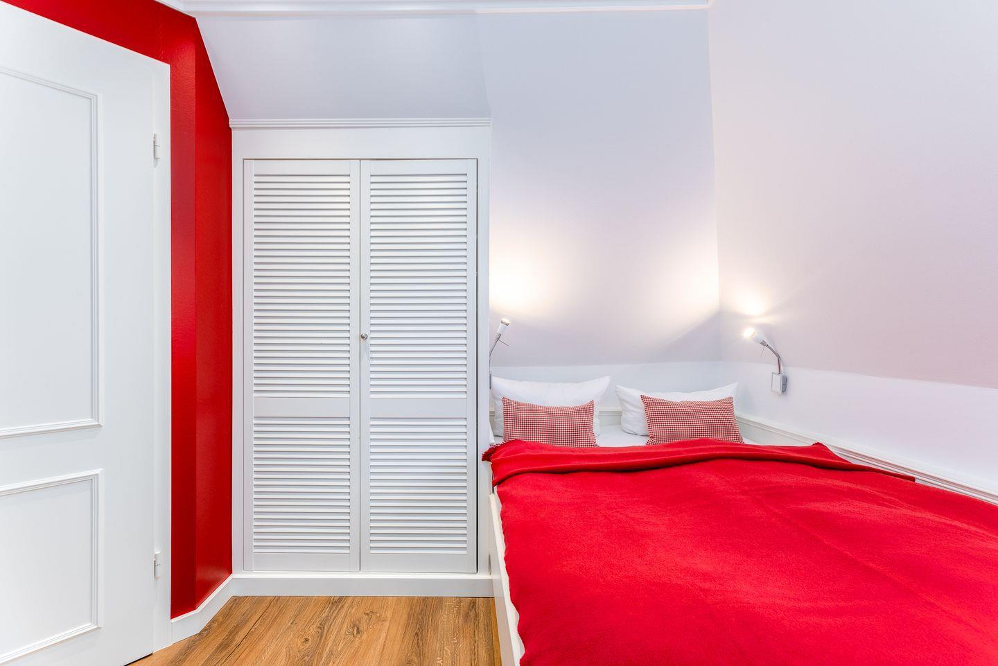 Ganz in Weiß und als Kontrast dazu die Signalfarbe Rot, macht das Doppelzimmer Lighthouse seinem Namen alle Ehre.
