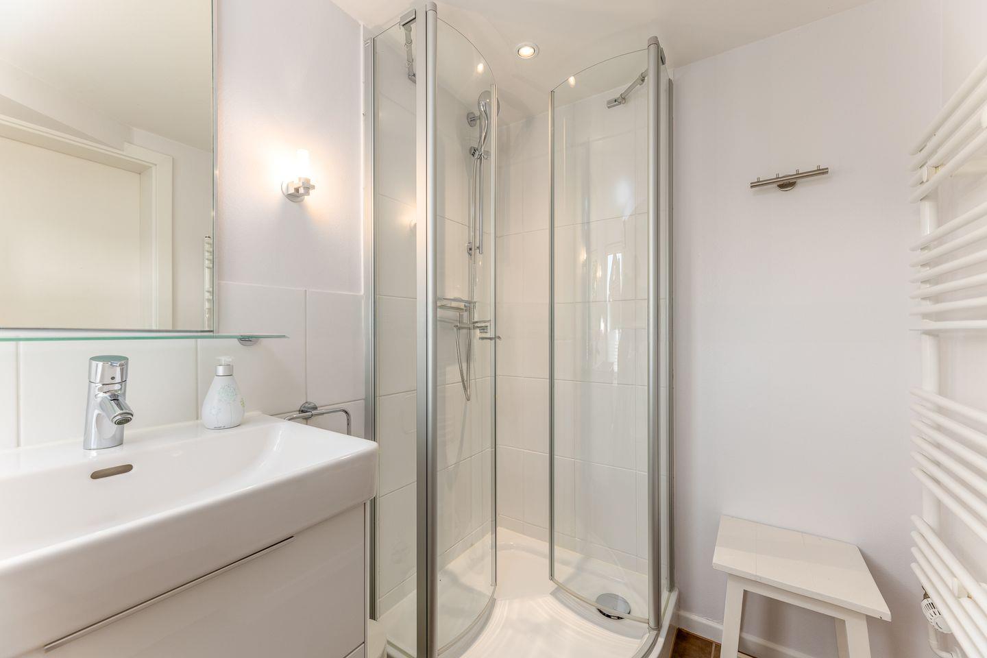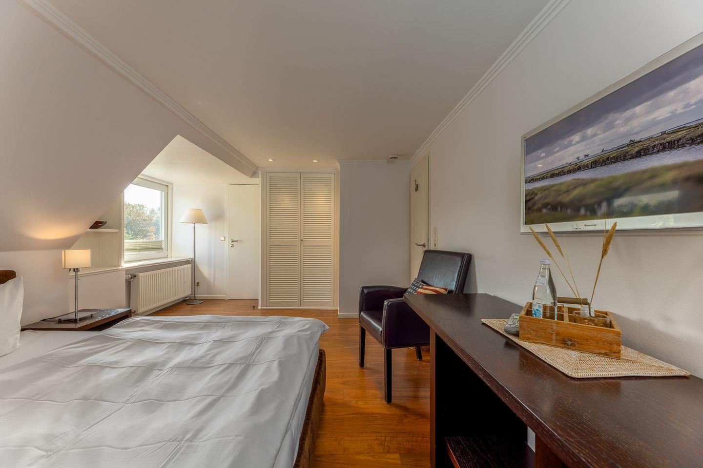 Hier wurde alles passgenau vom Tischler angefertigt und somit ist ein gemütliches Wohlfühldomizil entstanden. Das komfortable Polsterbett verfügt über eine rückenfreundliche Matratze und Blick auf den Fernseher. Ein Einbauschrank bietet genug Platz für die Urlaubsgarderobe und eine kleine Sitzgelegenheit gibt es ebenfalls. In dem hellen und modernen Duschbad werden mit Sand und Weiß sanfte Töne angeschlagen. Hier lässt es sich wunderbar in den Tag starten, bevor es ans Erkunden der Insel geht. Zusammengefasst das perfekte Zimmer für eine kleine Auszeit auf Sylt!