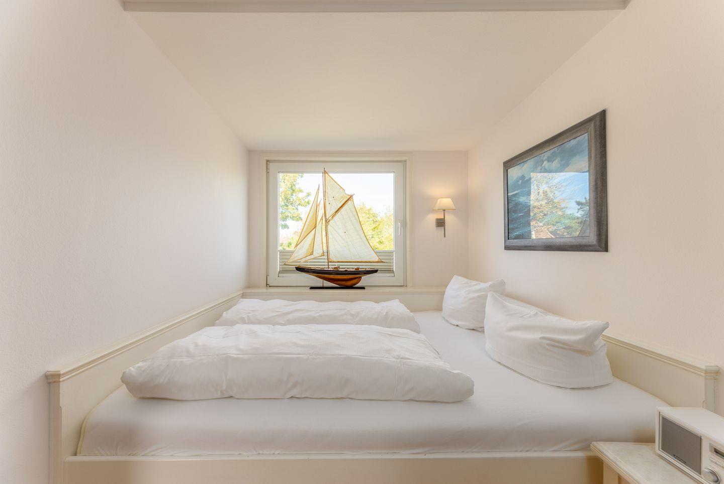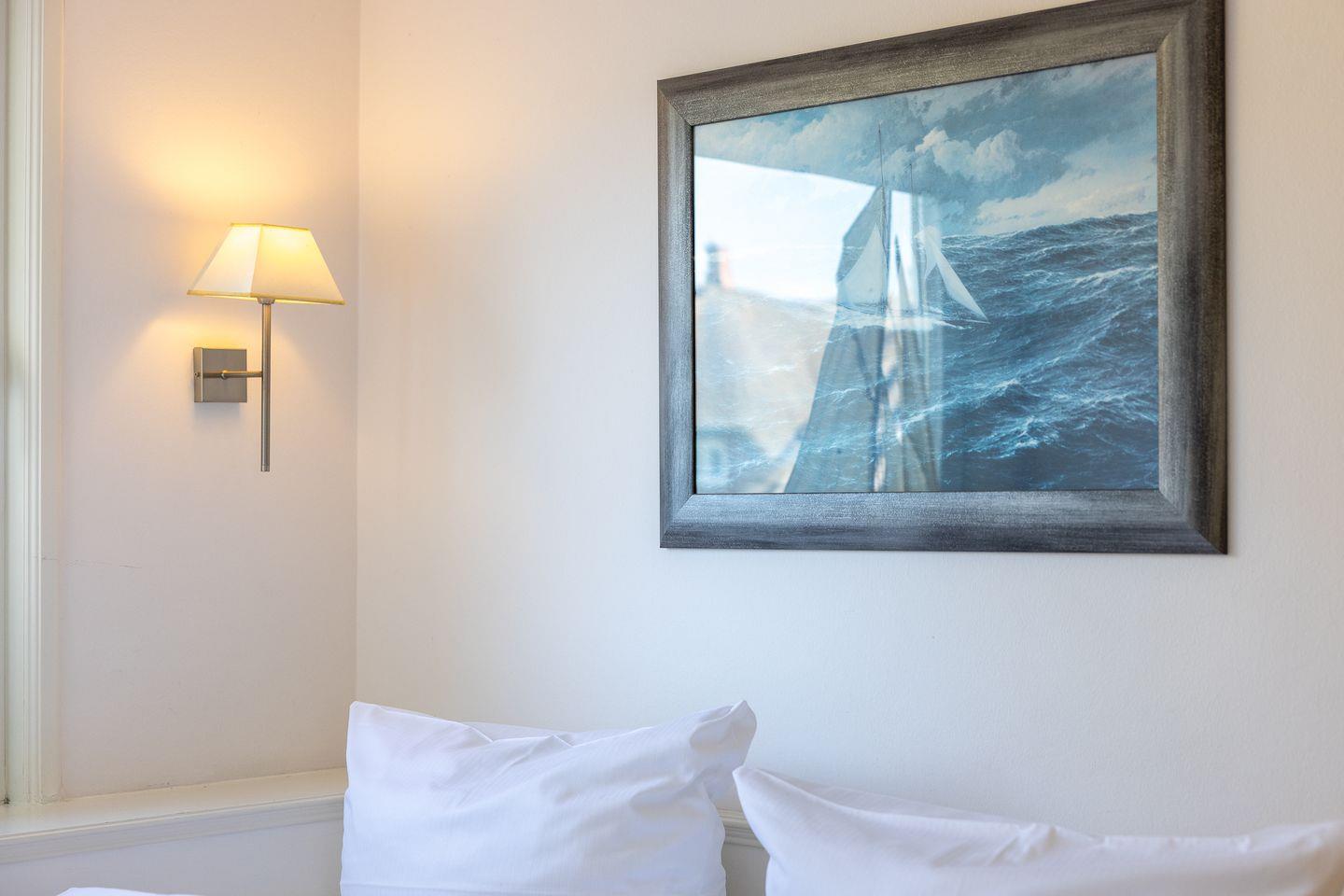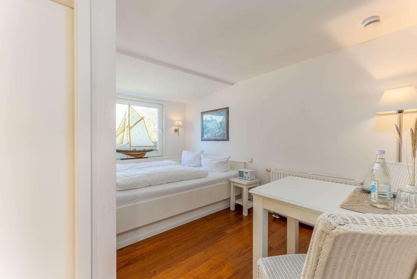 Hier wurde alles passgenau vom Tischler angefertigt und der Raum dadurch aufs Beste genutzt. Kein Schnickschnack nur ein paar ausgewählte maritime Accessoires lenken den Blick auf das Wesentliche, in diesem Fall das gemütliche Doppelbett (Alkove 1,60 x 2,00m) samt seiner rückenfreundlichen Matratze. Dazu noch ein Einbauschrank, der genug Platz für die Urlaubsgarderobe bietet sowie ein kleiner Tisch mit Stühlen. Ein modernes und geräumiges modernen Duschbad rundet das Zimmer ab. Zusammengefasst das perfekte Zimmer für eine kleine Auszeit auf Sylt!