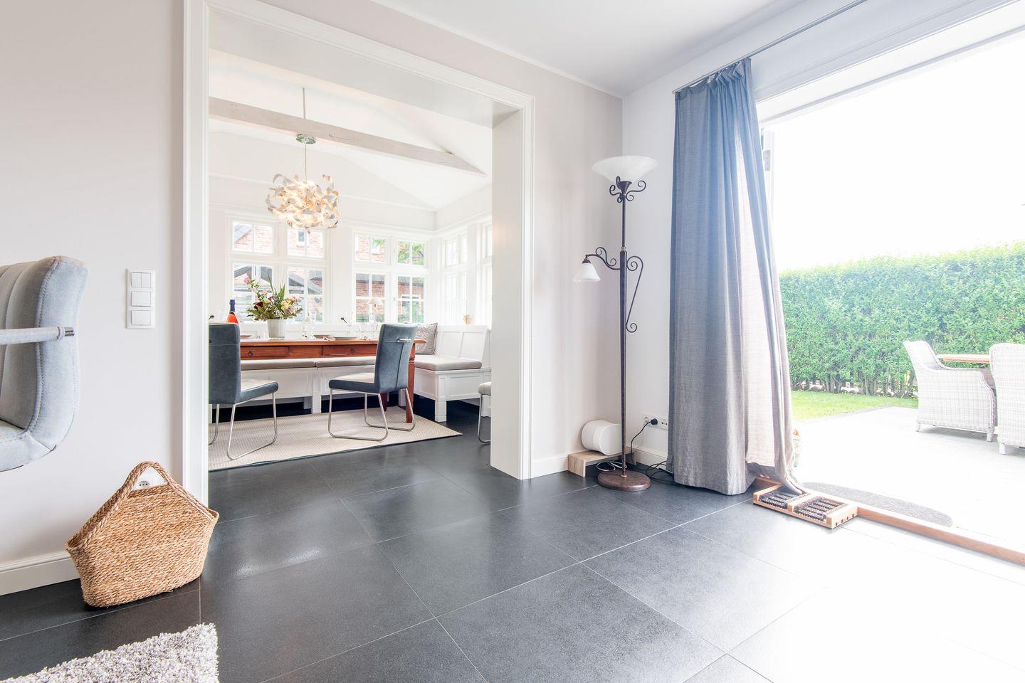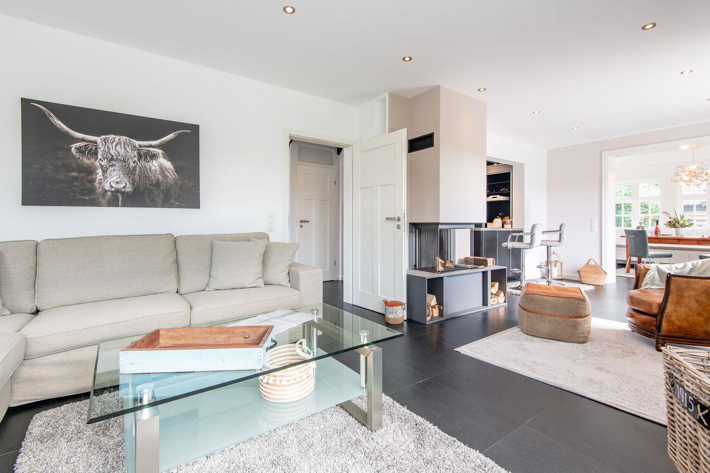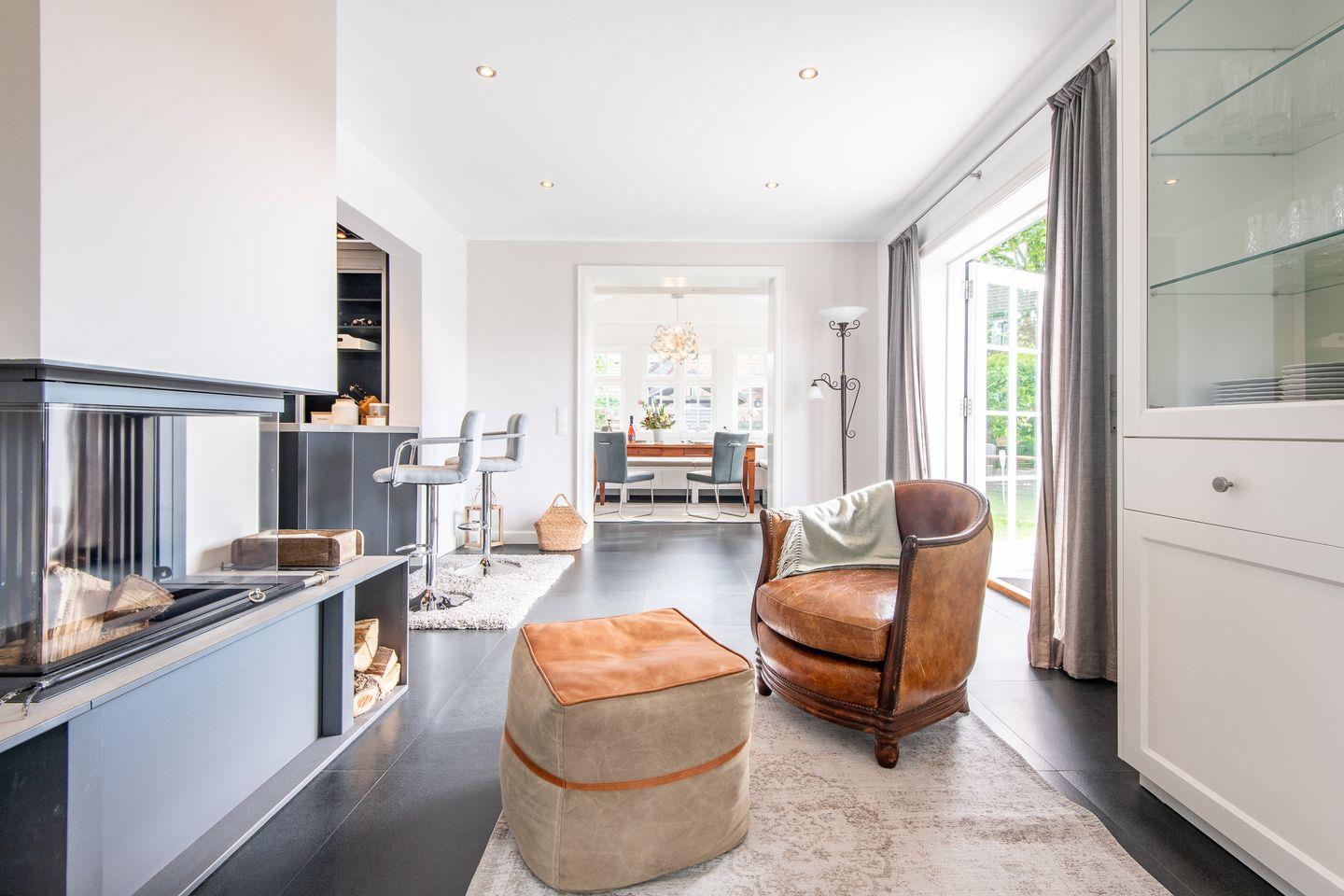 Der großzügige Wohnbereich des Hauses lädt mit seinem gemütlichen Kamin zu entspannten Abenden ein. Große Fenster lassen viel Licht in den Raum und bieten direkten Zugang zum Garten mit möblierter Terrasse. Hier können Sie die frische Nordseeluft genießen, sich entspannen und die Ruhe der Umgebung auf sich wirken lassen – perfekt für ein Frühstück im Freien oder einen Grillabend.