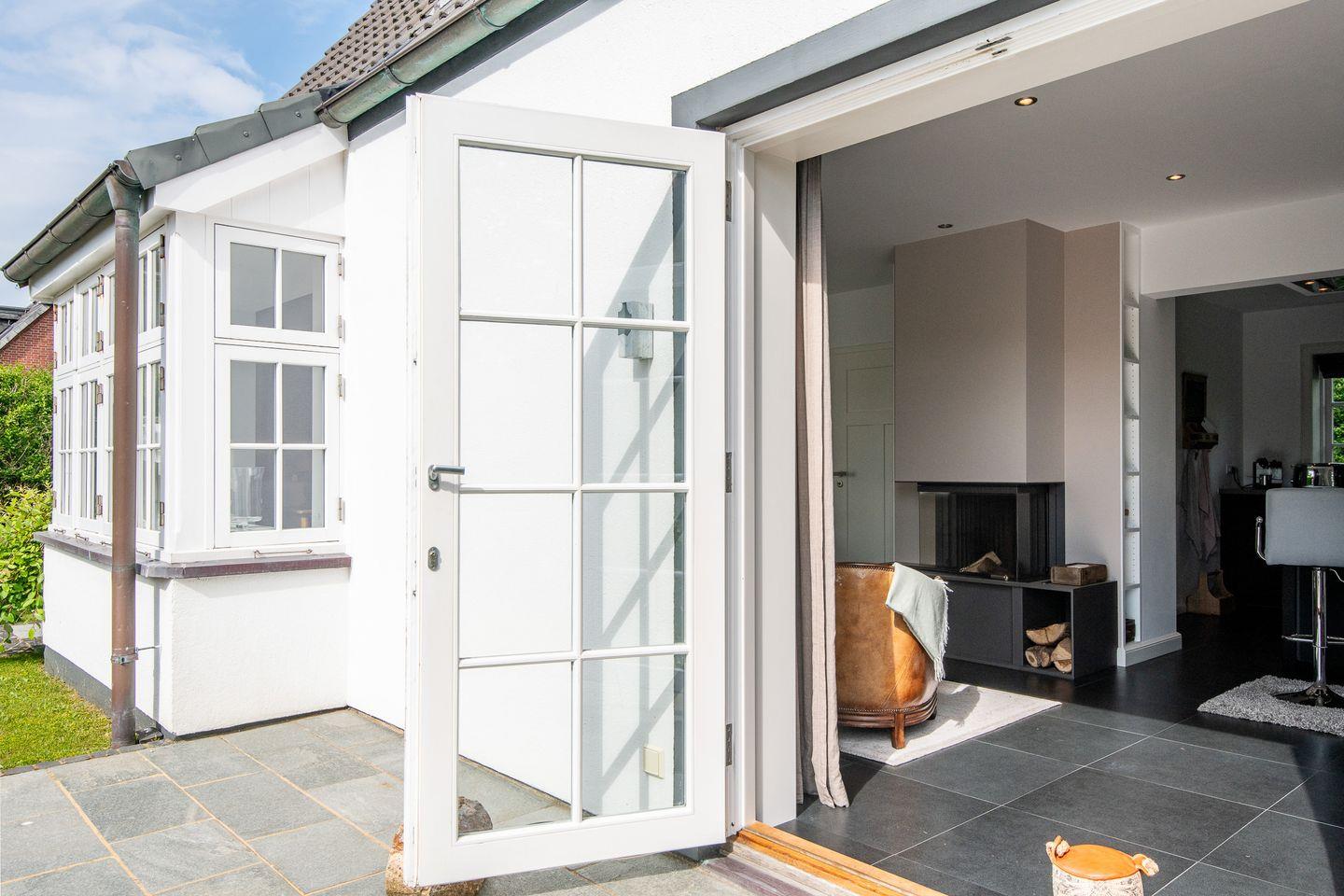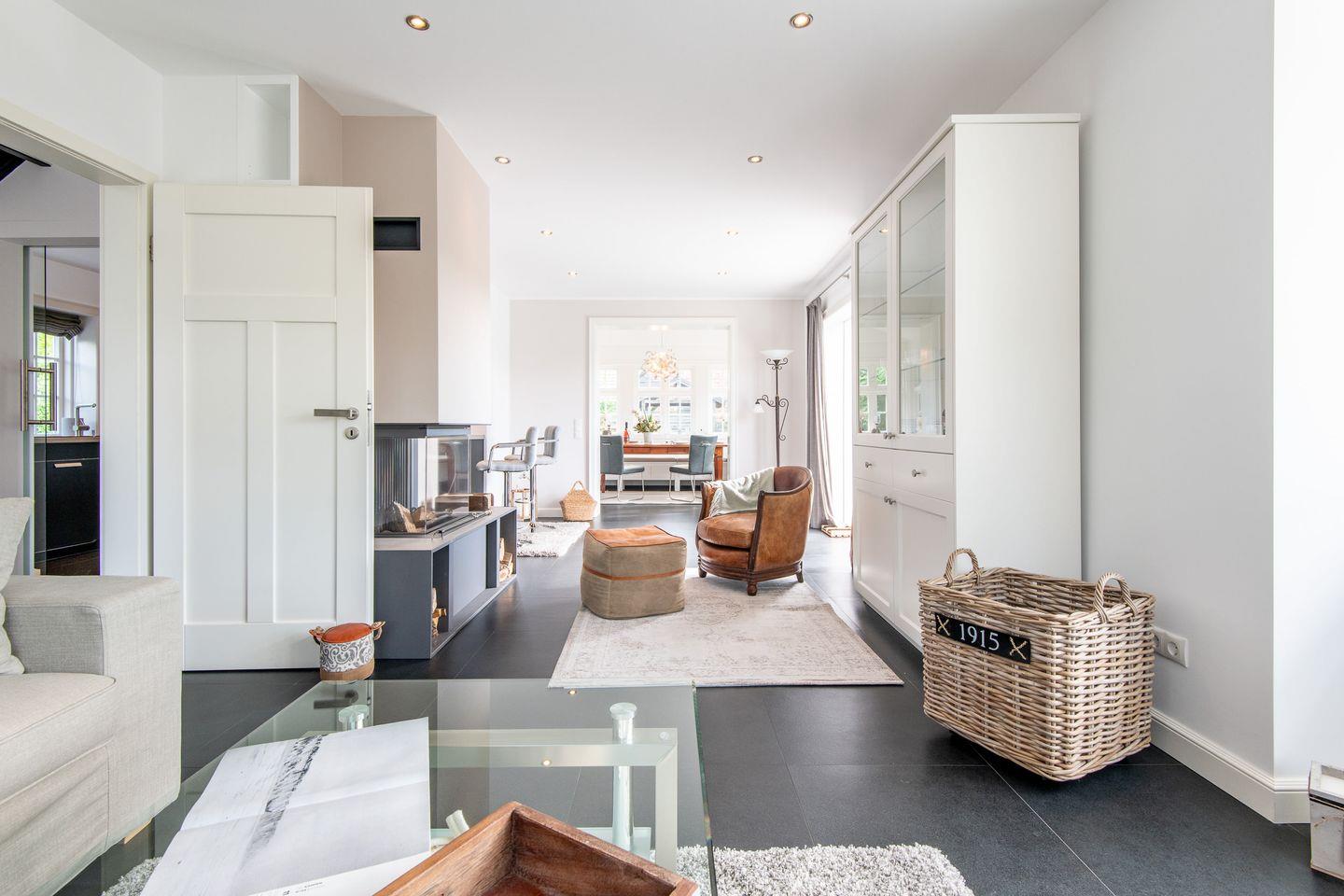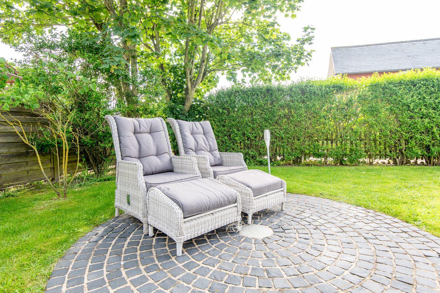 Der großzügige Wohnbereich des Hauses lädt mit seinem gemütlichen Kamin zu entspannten Abenden ein. Große Fenster lassen viel Licht in den Raum und bieten direkten Zugang zum Garten mit möblierter Terrasse. Hier können Sie die frische Nordseeluft genießen, sich entspannen und die Ruhe der Umgebung auf sich wirken lassen – perfekt für ein Frühstück im Freien oder einen Grillabend.