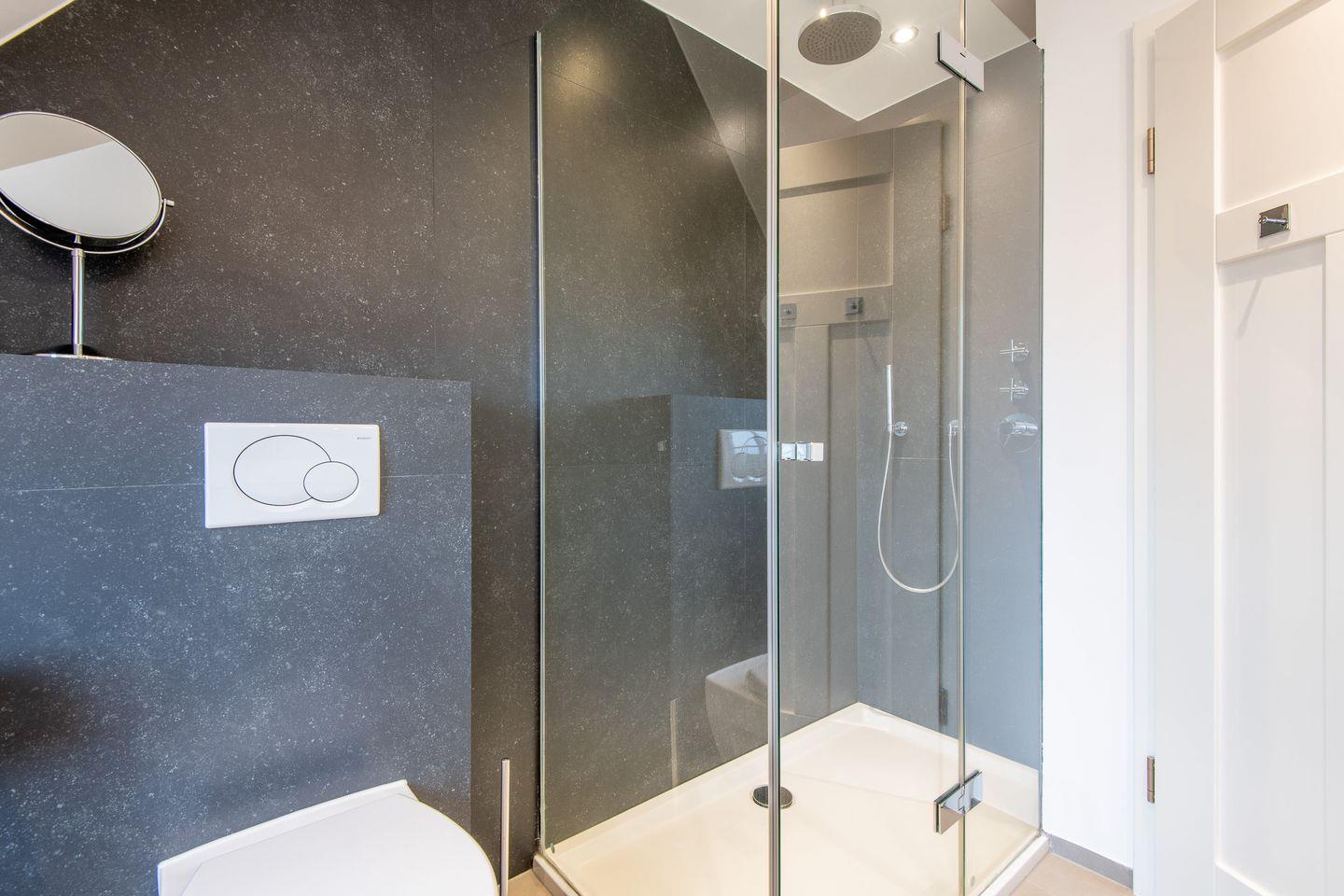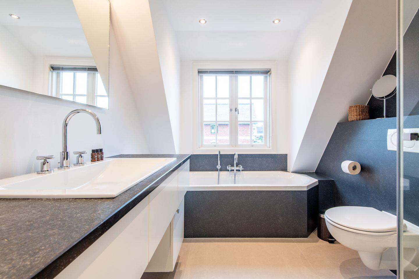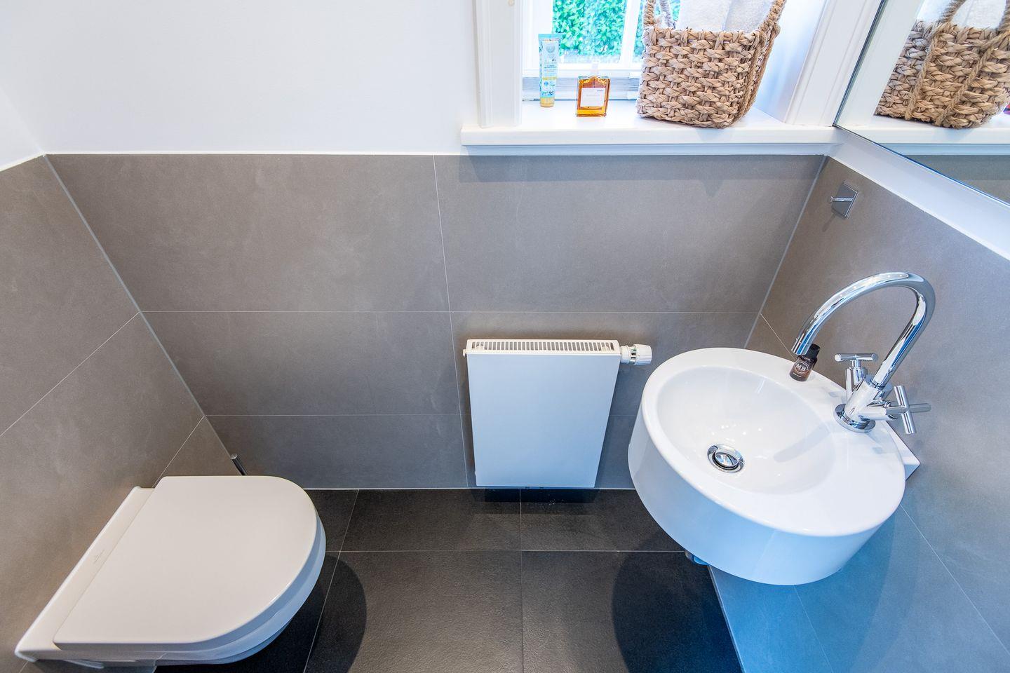 Das moderne Badezimmer bietet sowohl eine Badewanne als auch eine bodengleiche Dusche. Der Handtuchwärmer und das Tageslicht sorgen für zusätzlichen Komfort. Ein separates Gäste-WC im Erdgeschoss bietet zusätzliche Bequemlichkeit während Ihres Aufenthalts.