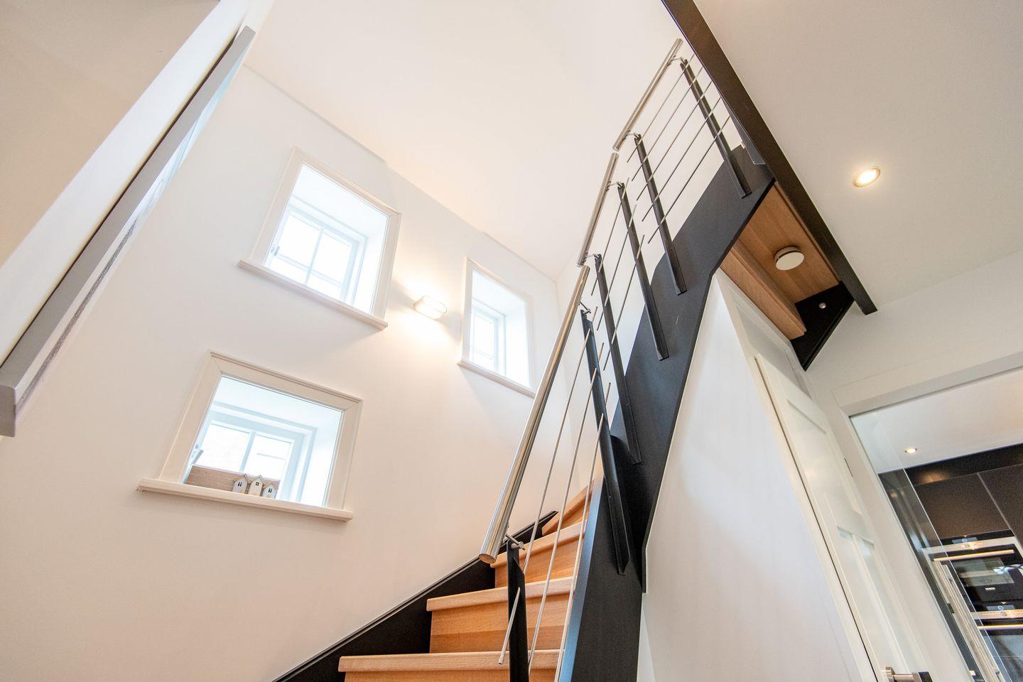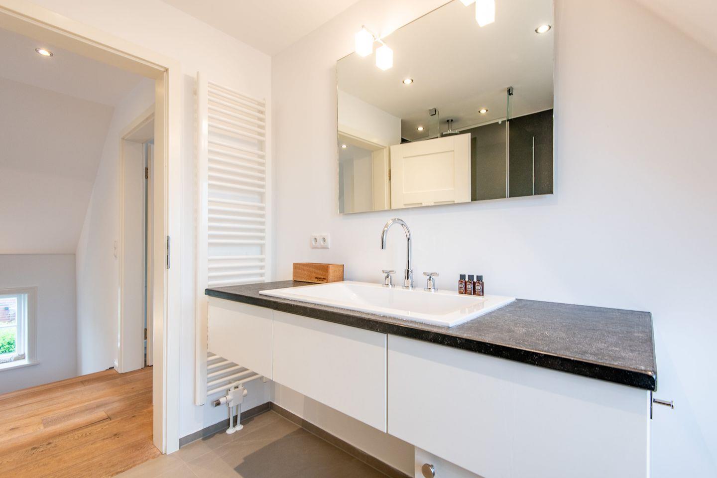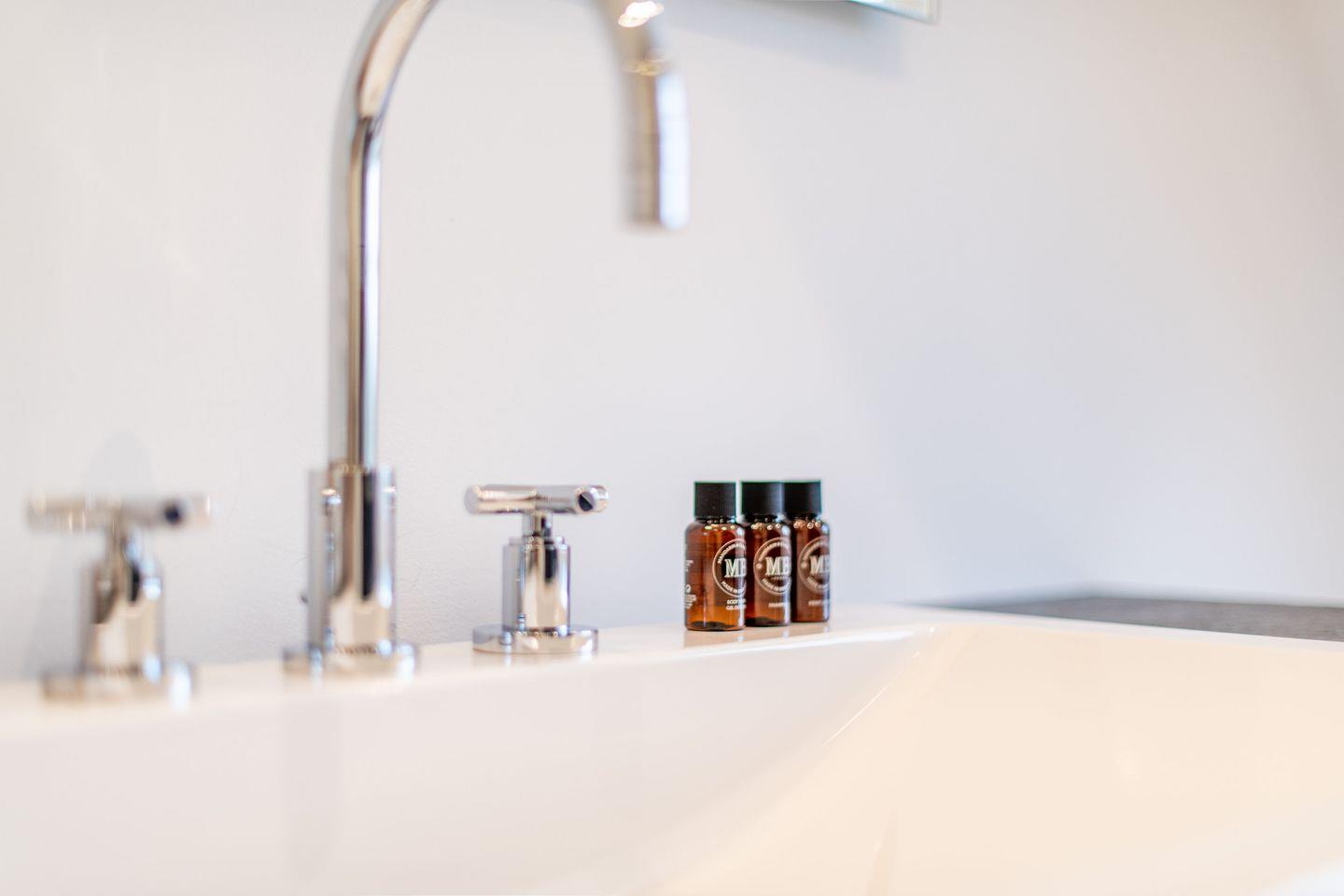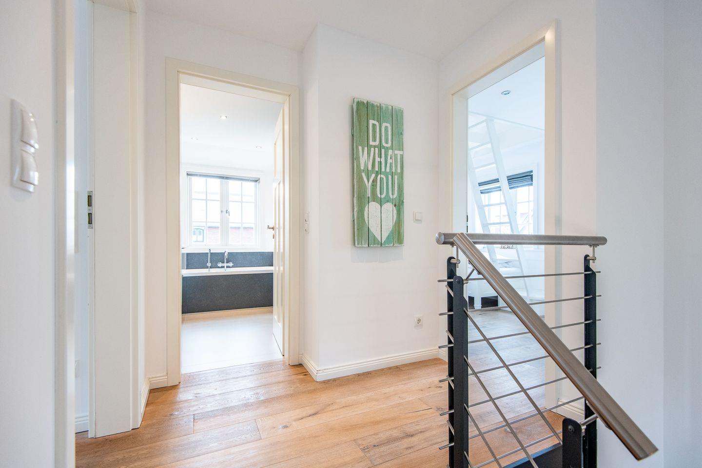 Das moderne Badezimmer bietet sowohl eine Badewanne als auch eine bodengleiche Dusche. Der Handtuchwärmer und das Tageslicht sorgen für zusätzlichen Komfort. Ein separates Gäste-WC im Erdgeschoss bietet zusätzliche Bequemlichkeit während Ihres Aufenthalts.
