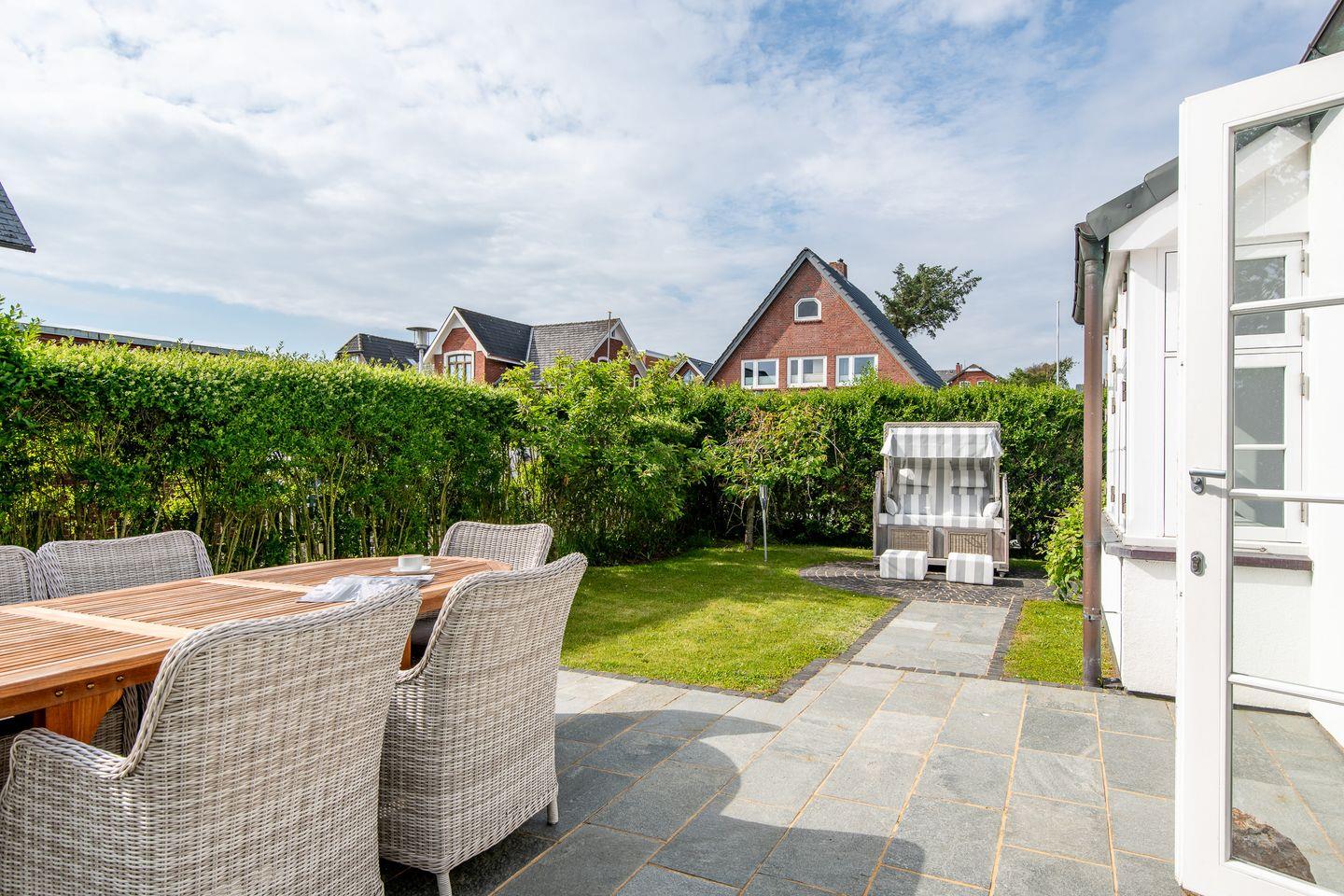 Der Garten mit möblierter Terrasse lädt zum Verweilen ein, sei es für ein gemütliches Frühstück oder zum Entspannen nach einem Strandspaziergang. Ein PKW-Stellplatz direkt am Haus steht Ihnen zur Verfügung, und es gibt eine sichere Unterstellmöglichkeit für Fahrräder im Gartenhaus. WLAN (ohne Gewähr) ist ebenfalls vorhanden, sodass Sie auch im Urlaub vernetzt bleiben können.