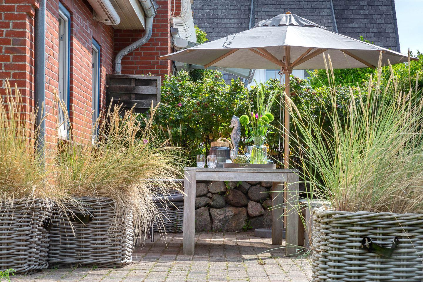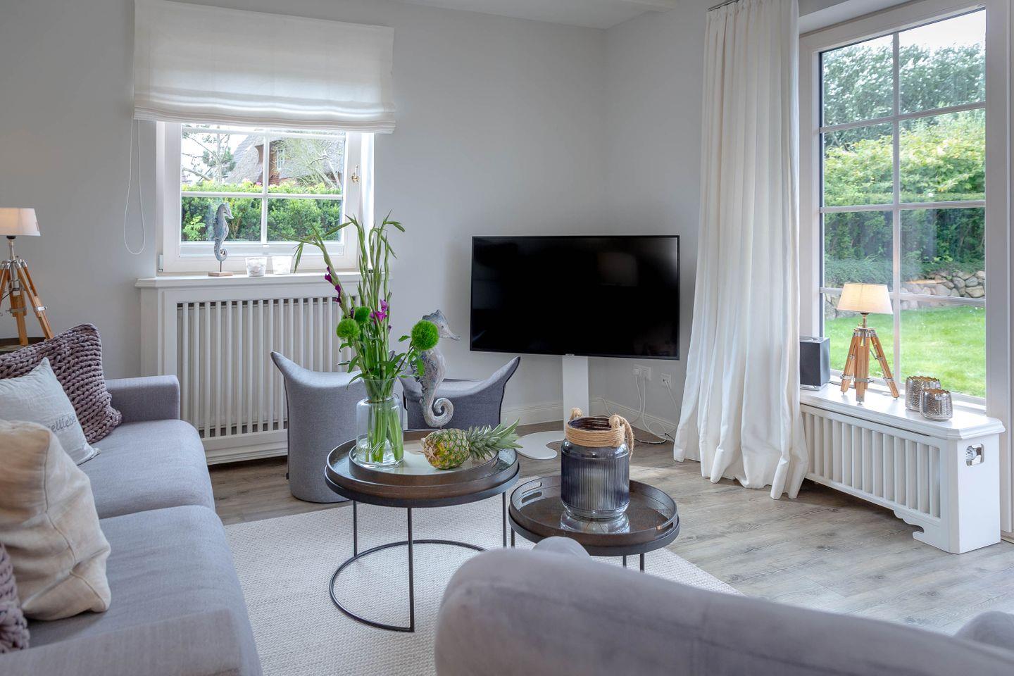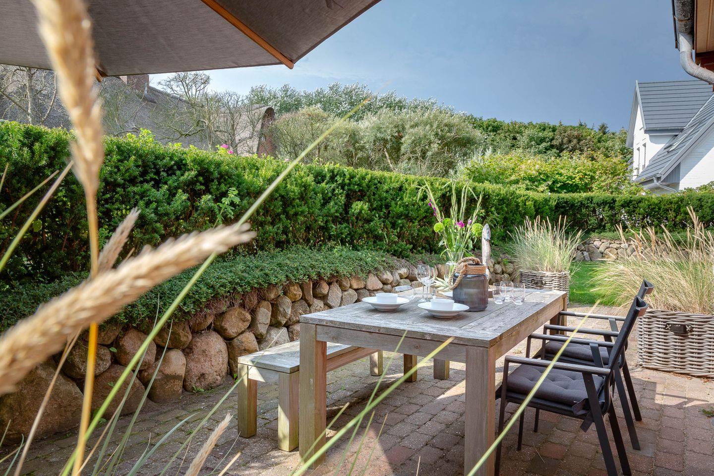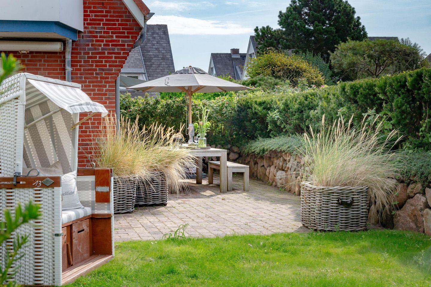 Ein echtes Highlight ist die private Terrasse, auf der Sie das milde Klima Sylt's unter freiem Himmel auskosten können. Die Terrasse ist mit komfortablen Gartenmöbeln ausgestattet, und ein Strandkorb wartet darauf, dass Sie sich hineinsetzen und die frische Nordseeluft genießen. Die grüne Umgebung des Hauses mit Blick in den Garten bringt eine entspannende Atmosphäre mit sich und lädt zu erholsamen Stunden im Freien ein.