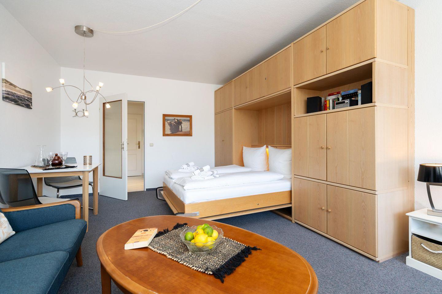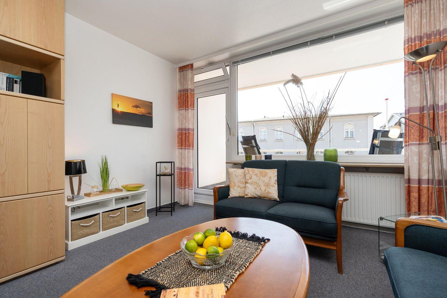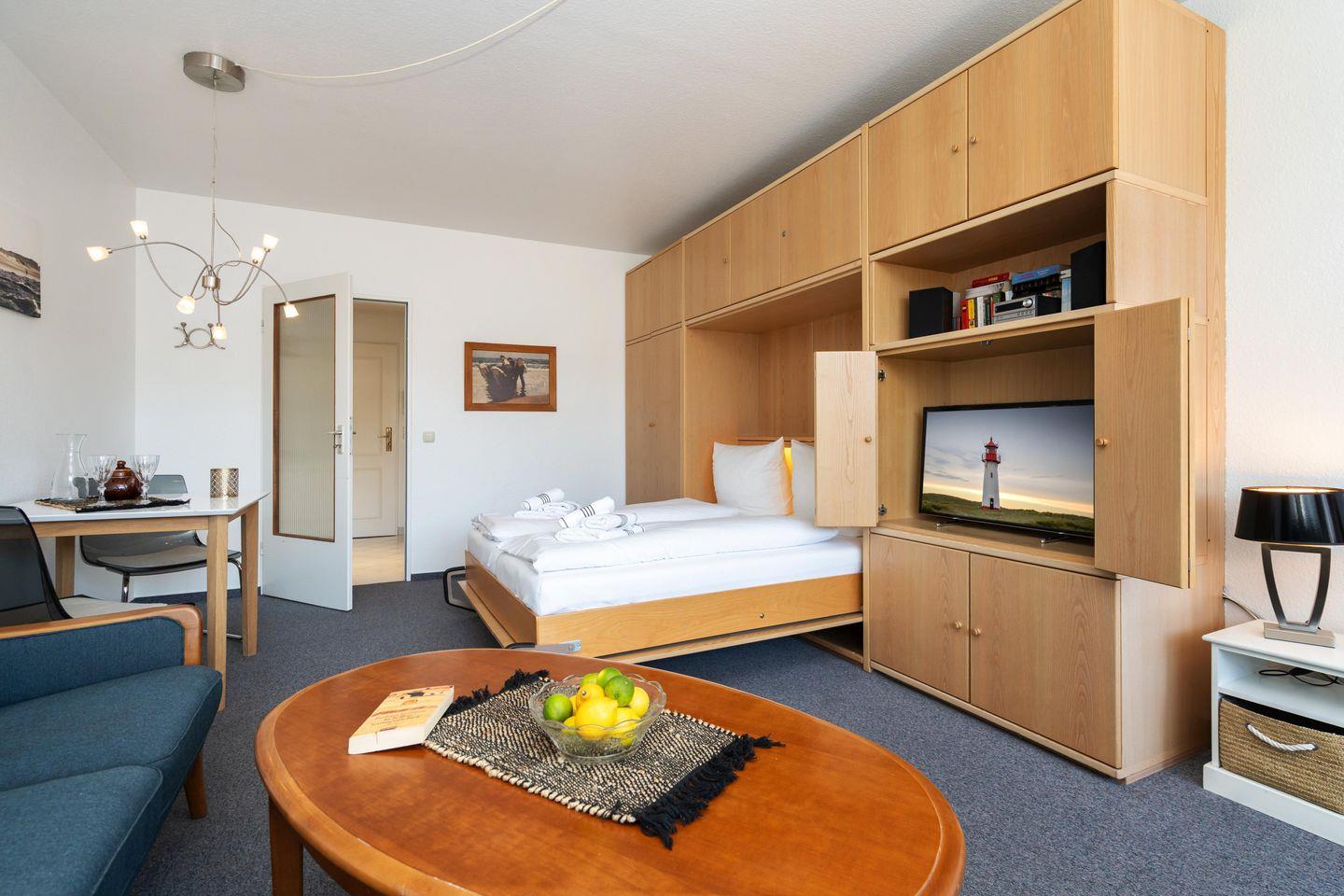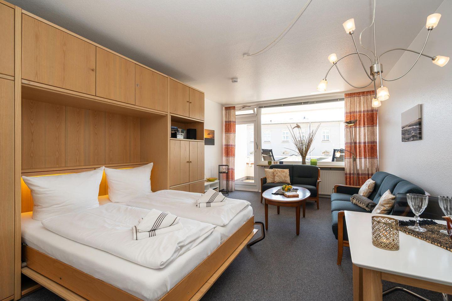 Diese gemütliche 1-Zimmer Ferienwohnung mit schönem Südbalkon für bis zu 2 Personen liegt zentral in Westerland in strandnaher Lage. Der gemütliche Wohn- und Schlafbereich bietet Ihnen neben einem Schrankbett (160x200 cm), eine gemütliche Sofaecke inkl. TV zum Entspannen und einen Essbereich. Die separate Küche samt Geschirrspüler ist gut ausgestattet. Im geräumigen Badezimmer erwartet Sie eine Dusche. Kostenloses WLAN, ein zugehöriger Tiefgaragenstellplatz (Einfahrtshöhe 180 cm) sowie ein Fahrstuhl sind vorhanden. Haustiere sind leider nicht erlaubt. Im Waschraum des Gebäudes stehen Ihnen kostenpflichtige Waschmaschinen (4x 1€) sowie Trockner (4x 1€) zur Verfügung.