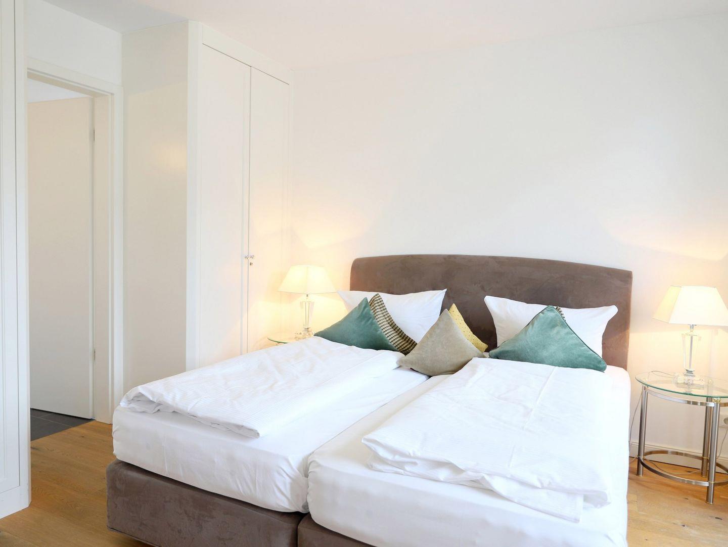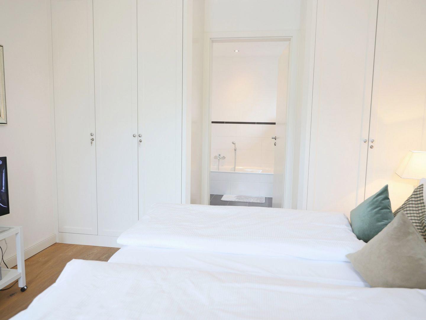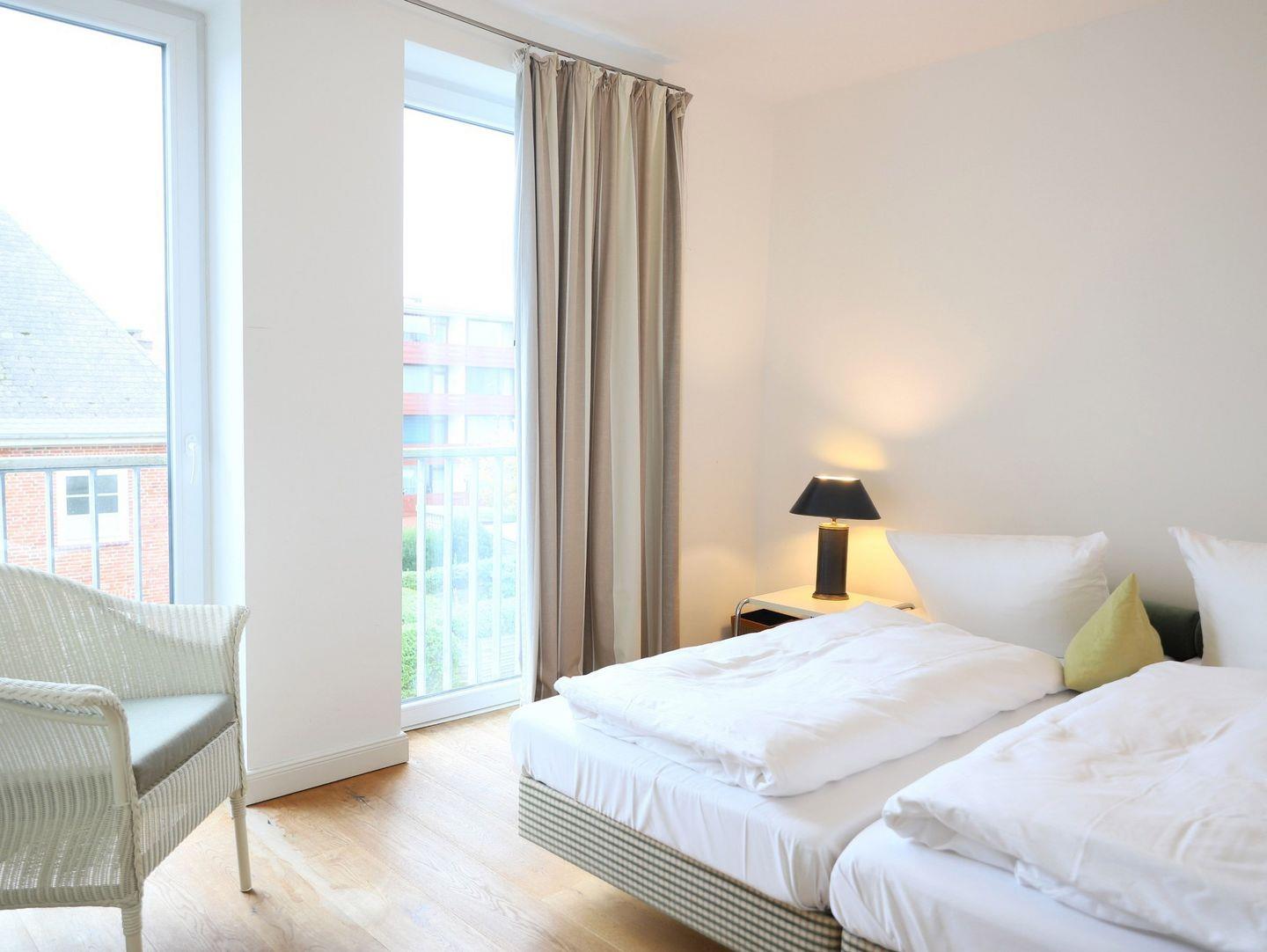 Großzügige, ca. 100 m² große, barrierefreie Ferienwohnung in direkter Strandnähe. Diese hochwertige Nichtraucherwohnung bietet Platz für bis zu 4 Personen mit zwei Schlafzimmern, zwei modernen Bädern (eins mit Badewanne) und einer voll ausgestatteten Küche. Ein Westbalkon mit Strandkorb, Tiefgaragenstellplatz, Fahrradkeller und Münz-Waschmöglichkeiten im Keller sorgen für Komfort. Haustiere sind nicht gestattet.