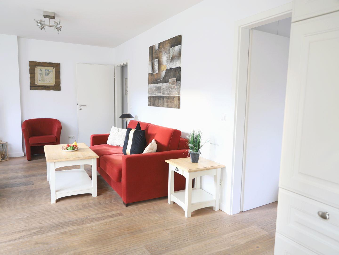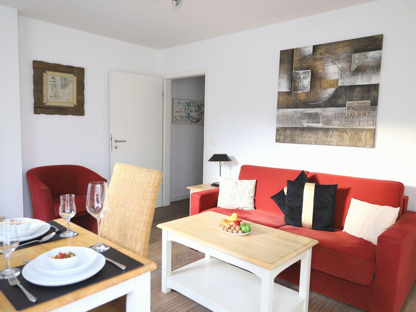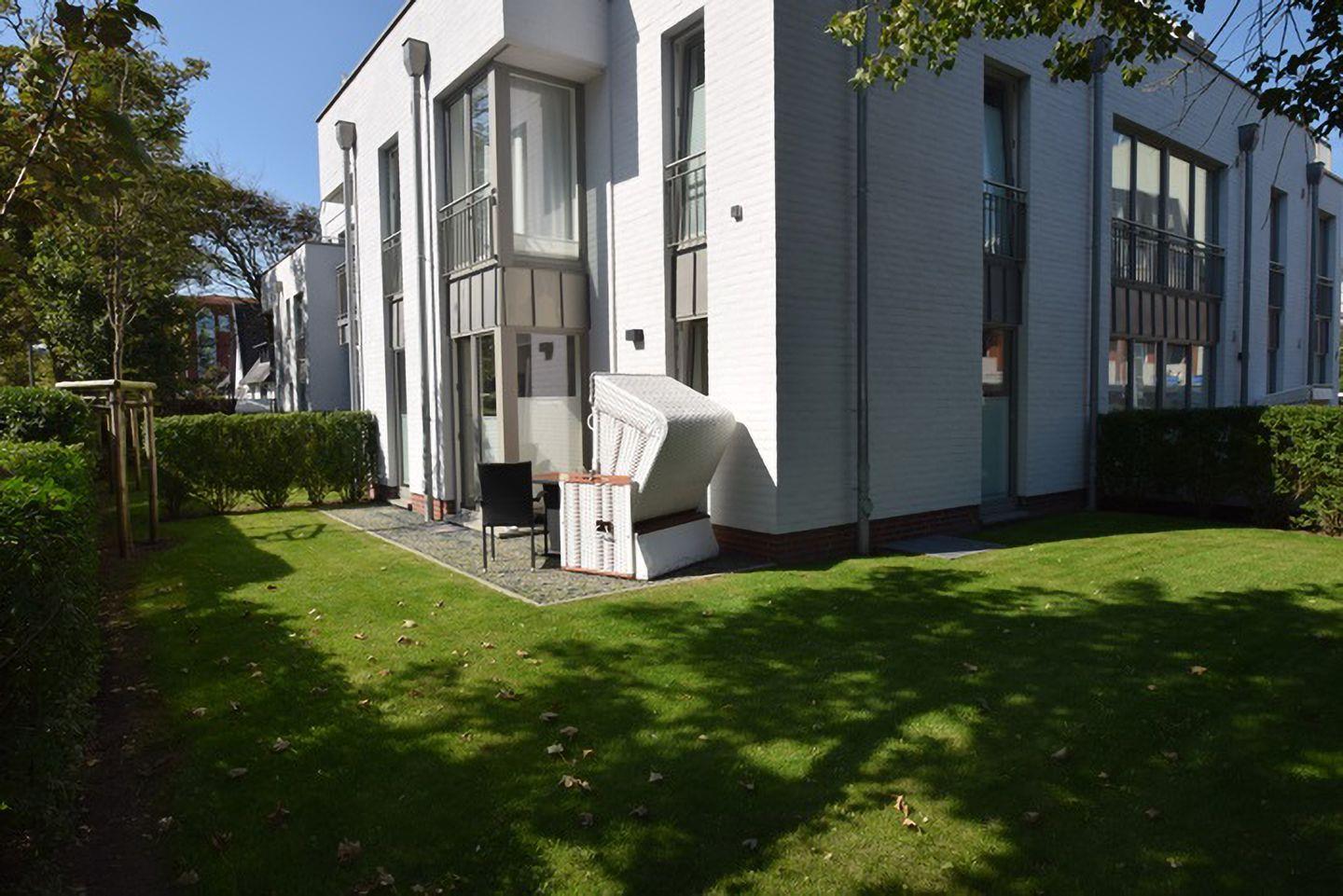 Dieses hochwertige 2-Zimmer-Appartement im Erdgeschoss der Viktoriaresidenz bietet auf ca. 53 m² Platz für bis zu 4 Personen. Das Schlafzimmer ist mit einem Doppelbett (180 x 200 cm) ausgestattet, während das lichtdurchflutete Wohnzimmer mit einer Schlafcouch (140 x 190 cm), einem Esstisch, Flatscreen-TV und WLAN für zusätzlichen Komfort sorgt. Die moderne Küche ist mit Cerankochfeld, Geschirrspüler und Backofen ausgestattet. Das Badezimmer verfügt über eine Dusche/WC. Genießen Sie die Sonne auf der Süd-Terrasse, die mit einem Gartentisch und Stühlen ausgestattet ist. Die Wohnung ist klimatisiert und eine Nichtraucherwohnung. Ein Tiefgaragenstellplatz (Durchfahrtshöhe 2,0 m) steht kostenlos zur Verfügung. Der Fahrradkeller bietet zusätzlichen Stauraum für Fahrräder, wobei ein Stellplatz nicht garantiert werden kann. Ein Fahrstuhl ermöglicht den bequemen Zugang zur Wohnung, und im Keller befindet sich eine Waschmaschine mit Münzzähler. Haustiere sind willkommen. Die Wohnung befindet sich in zentraler Lage, nur wenige Gehminuten von der Fußgängerzone, dem Bahnhof und dem Strand entfernt.