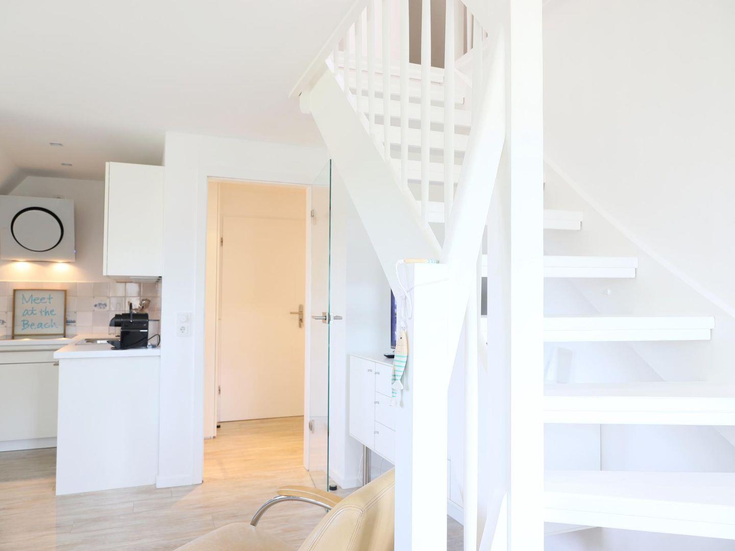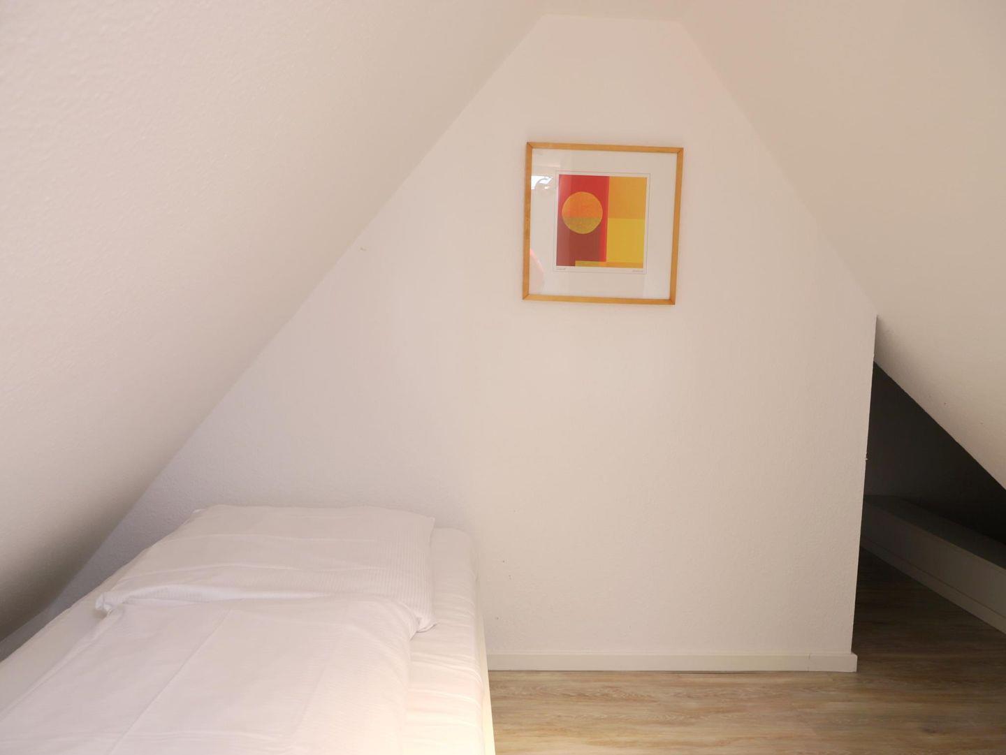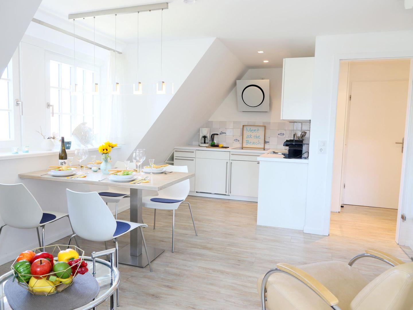In einer schönen Reetdachanlage in südlicher Richtung gelegen, bietet diese Wohnung auf 45 m² Platz für bis zu 4 Personen, ideal für 3 Erwachsene mit Kind oder 2 Erwachsene mit 2 Kindern. Der hell und lichtdurchflutete Wohn-/Essraum ist modern eingerichtet. Ein Schlafzimmer mit Doppelbett (180 x 200 cm) befindet sich auf gemeinsamer Ebene, während das zweite Schlafzimmer im Dachgeschoss mit zwei Einzelbetten (90 x 200 cm) ausgestattet ist. Im Außenbereich stehen ein Strandkorb und ein Fahrradständerplatz zur Verfügung. Der Gemeinschaftsgarten lädt zum Verweilen ein. Die Wohnung befindet sich in zentraler Lage, nur wenige Gehminuten von der Innenstadt mit Einkaufsmöglichkeiten und Restaurants entfernt. Der Strandaufgang zum Westerländer Strand ist ebenfalls schnell erreichbar. Ein Bäcker und ein Supermarkt (Famila) befinden sich in der Nähe für Ihre alltäglichen Besorgungen. Haustiere sind nicht gestattet. Ein kostenfreier Stellplatz ist ebenfalls vorhanden. Waschmaschine und Trockner mit Münzzähler befinden sich im Keller.