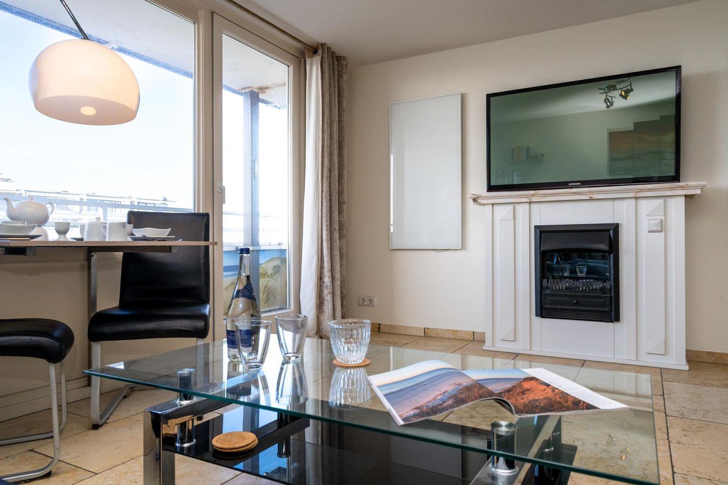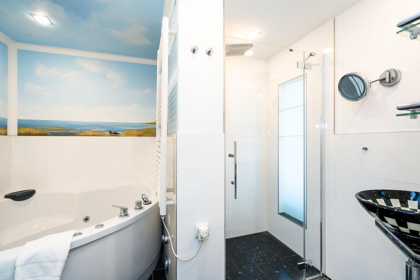 Modern renoviertes 1-Zimmer-Appartement in Westerland. 42 m², luxuriöse Ausstattung, Whirlpool-Duschbad mit TV, West-Balkon mit Meerblick, Tiefgaragenstellplatz, Fahrradkeller. Zentrale Lage nahe Strand und Promenade. Haustiere willkommen!
