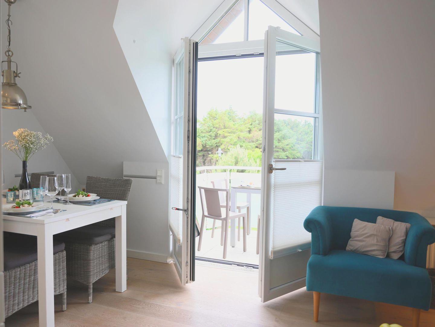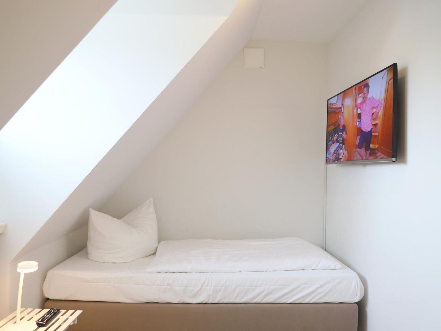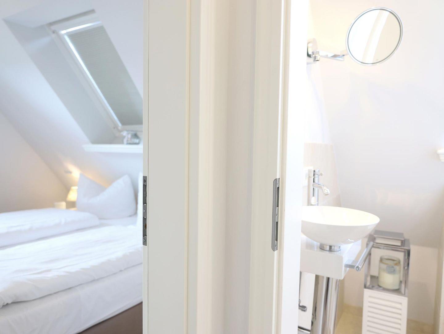 Moderne 3-Zimmer-Ferienwohnung im Dachgeschoss in Westerland (ca. 52 m²) für 4 Personen. 2 Schlafzimmer, 2 Badezimmer, Westbalkon, WLAN, Wohnraum mit Küchenzeile. Strand, Ortszentrum und Gastronomie fußläufig. Haustiere sind nicht gestattet. Kostenfreier Stellplatz.