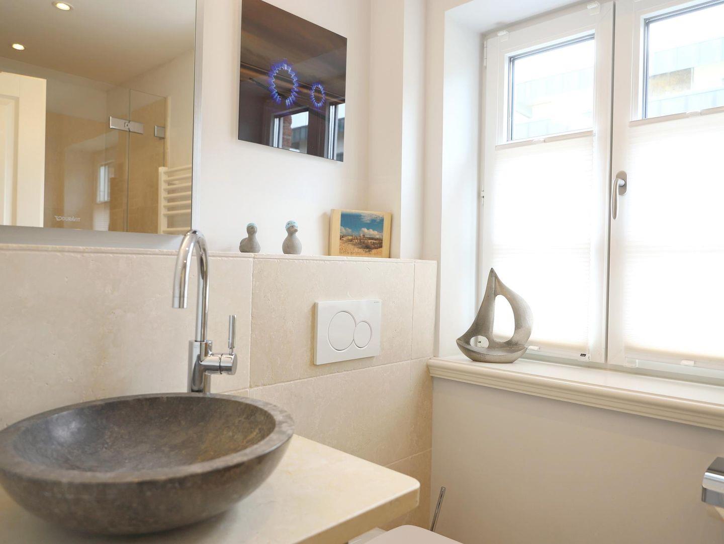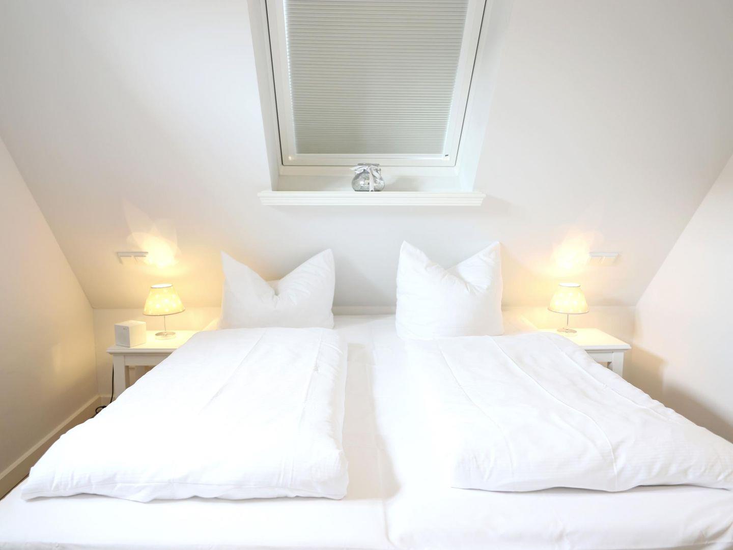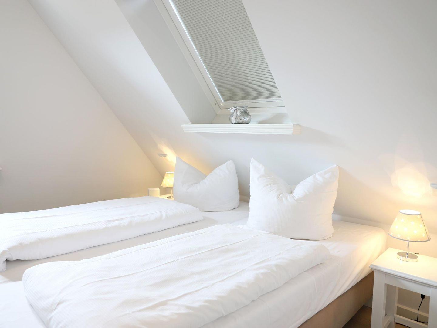 Diese exklusive 3-Zimmer-Ferienwohnung (ca. 52 m²) befindet sich hinter den Dünen, nur 200 m vom Strand entfernt. Im Dachgeschoss gelegen, bietet die Wohnung einen Wohnraum mit einer modernen Küchenzeile und Zugang zu einem Westbalkon. Das erste Schlafzimmer ist mit einem Doppelbett (160 x 200 cm) und Kabel-TV ausgestattet, das zweite Schlafzimmer mit 2 Einzelbetten (80 x 200 cm). Im Obergeschoss befindet sich das zweite Badezimmer sowie ein Doppelbettzimmer mit separatem WC. Die Wohnung ist ideal für einen entspannten Aufenthalt, nur wenige Gehminuten vom Strand, dem Ortszentrum und den Restaurants von Westerland entfernt. Weitere Annehmlichkeiten sind ein kostenfreier Stellplatz, ein Fahrradständer sowie die Möglichkeit, ein Fahrrad zu nutzen (kein garantierter Stellplatz). Im Keller stehen eine Waschmaschine und ein Trockner zur Verfügung. Haustiere sind nicht gestattet.