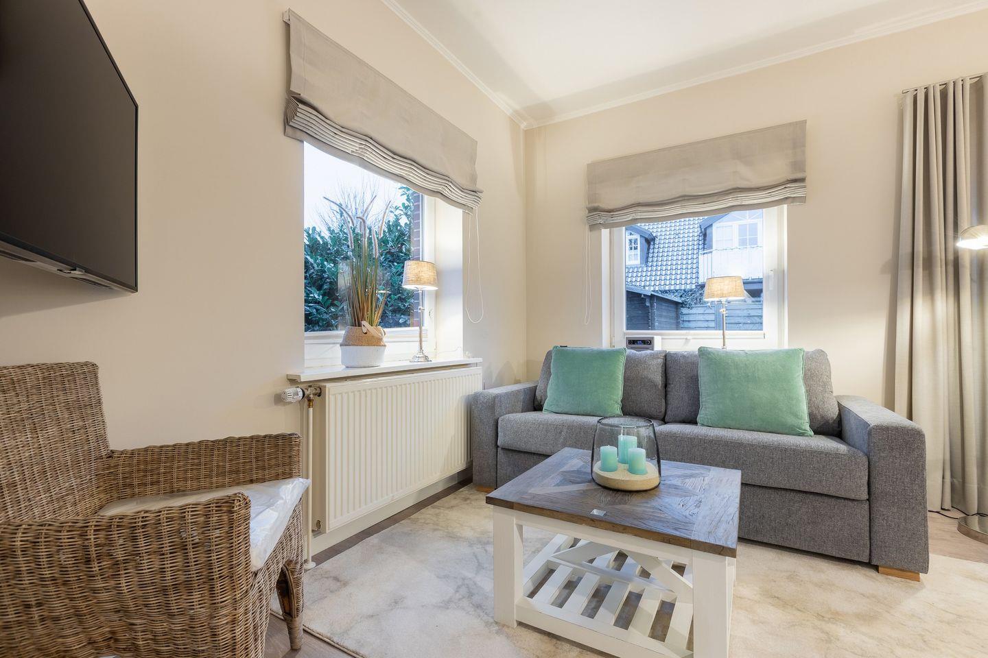 Diese einladende Erdgeschosswohnung in Alt-Westerland bietet auf 40 m² Platz für bis zu 4 Personen. Der großzügige Wohn-/Essbereich mit Küchenzeile ist gemütlich eingerichtet und verfügt über ein Schlafsofa (160 x 190 cm). Das separate Schlafzimmer bietet ein Boxspring-Doppelbett (160 x 200 cm) für erholsame Nächte. Von der Nord-Terrasse mit Gartenmöbeln und Strandkorb gelangen Sie direkt in den Garten. Ein kostenfreier PKW-Stellplatz befindet sich direkt am Haus. Ideal für Bahnreisende durch die Nähe zum Bahnhof. Fußläufig erreichen Sie die Strandpromenade, das Wellenbad und die Fußgängerzone mit Restaurants und Geschäften. Waschmaschine und Trockner sind vorhanden. Haustiere sind nicht gestattet.