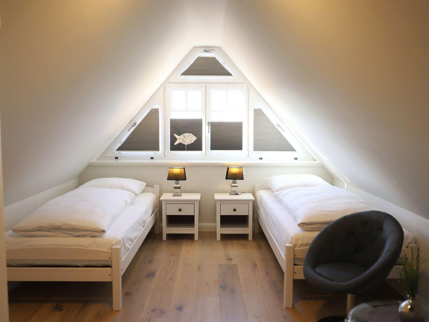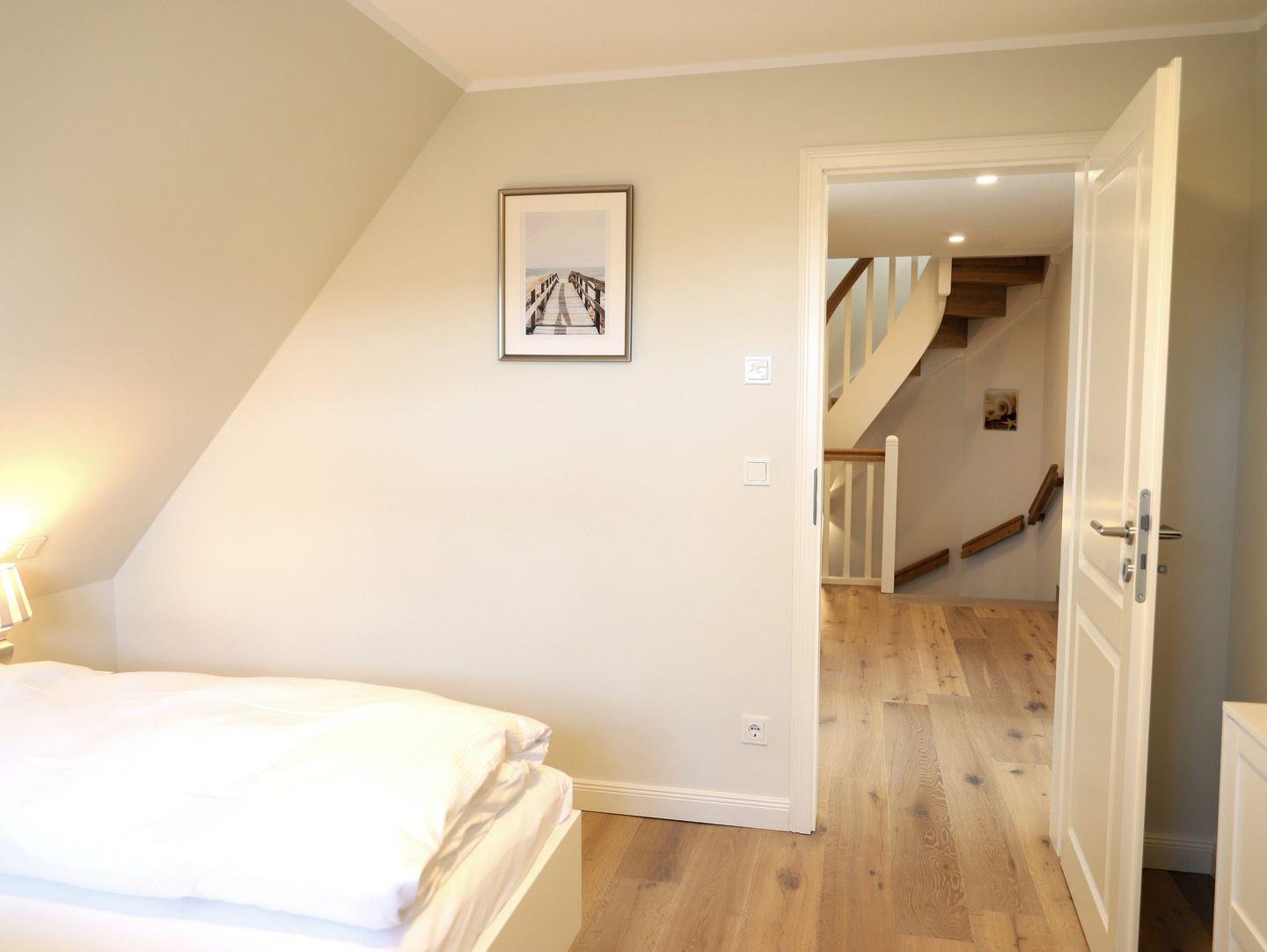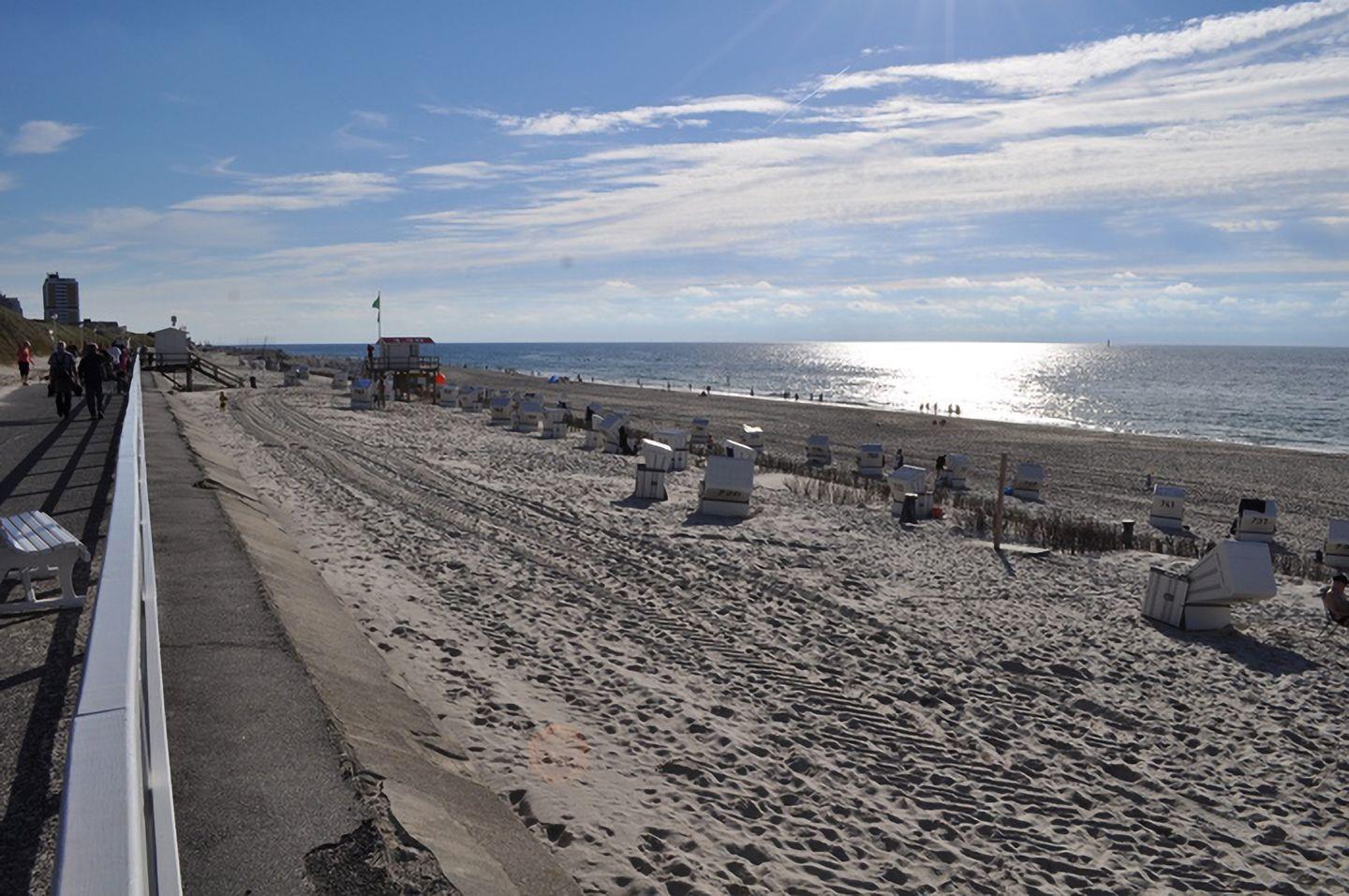 Diese sehr schöne, hochwertig eingerichtete Obergeschosswohnung (ca. 85 m²) in Westerland erstreckt sich über 2 Ebenen und bietet Platz für bis zu 4 Personen. Das lichtdurchflutete Wohn-/Esszimmer ist der perfekte Ort zum Entspannen. Die geschmackvoll abgestimmte Möblierung sowie die harmonische Farbgestaltung ziehen sich durch die gesamte Wohnung. Vom großzügigen Wohnzimmer aus gelangen Sie auf den großen Süd-Balkon, der mit Gartentischen und Stühlen ausgestattet ist und zum Relaxen einlädt. Das Schlafzimmer 1 ist mit einem Doppelbett (180 x 200 cm) ausgestattet und verfügt über Kabel-TV. Das Schlafzimmer 2 bietet zwei Einzelbetten (90 x 190 cm). Die Wohnung bietet zwei zusätzliche Badezimmer für Komfort. Zur Ausstattung gehören ein kostenfreier Stellplatz und ein Fahrradständer. Haustiere sind willkommen.