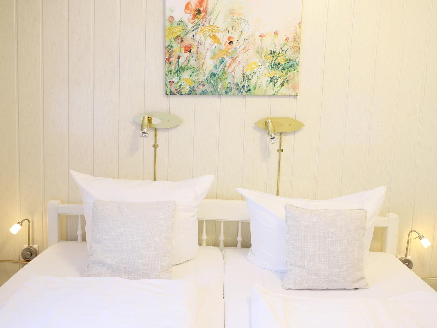 Die Ferienwohnung „Amrum“ im Erdgeschoss bietet auf 35 m² Platz für bis zu 4 Personen. Die Ausstattung ist einfach und zweckmäßig – ideal für alle, die eine gute Lage zu einem fairen Preis suchen. Im Schlafzimmer steht ein Doppelbett, im Wohnbereich gibt es eine zusätzliche Schlafgelegenheit. Eine sonnige Südterrasse mit Strandkorb lädt zum Entspannen ein. Ein Stellplatz ist inklusive, Hunde sind auf Anfrage willkommen.
