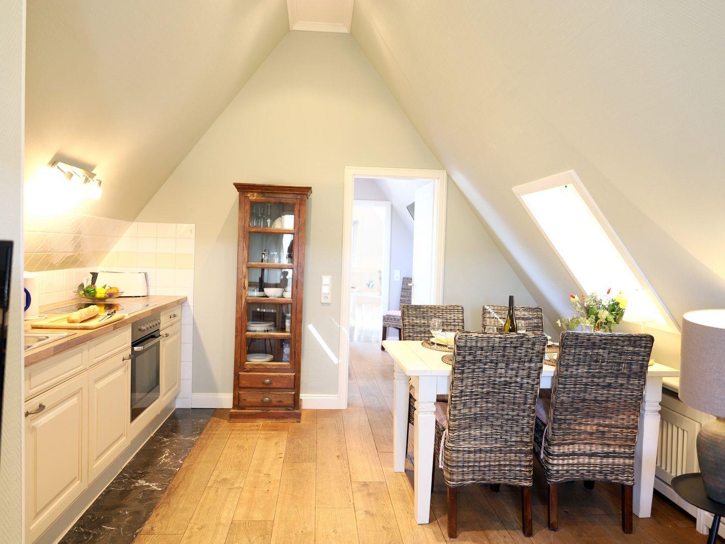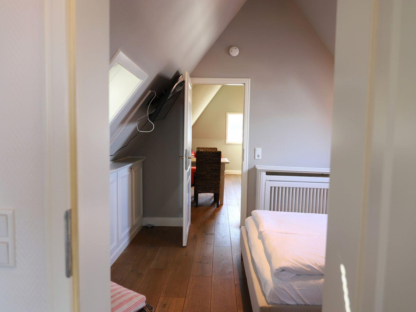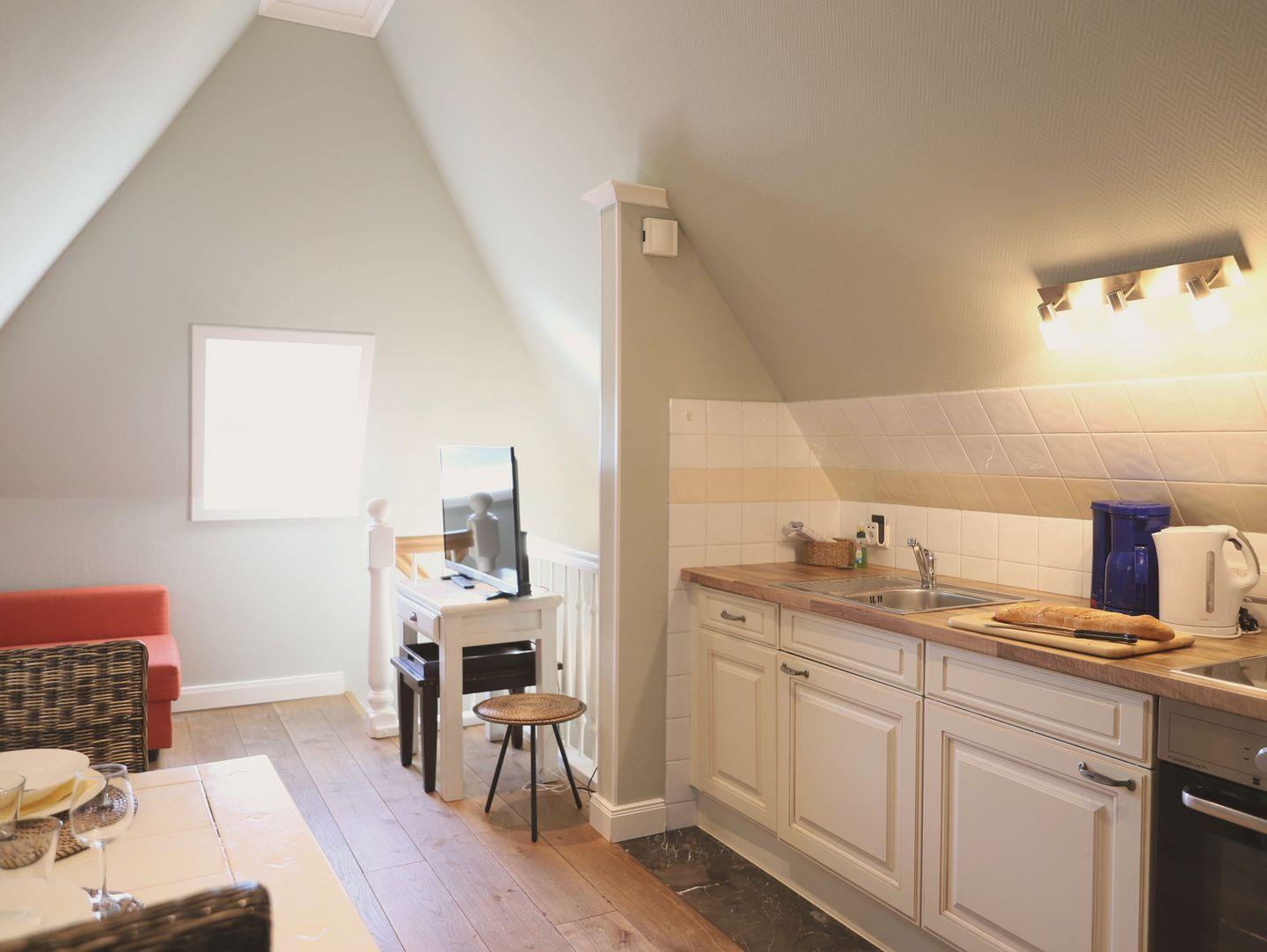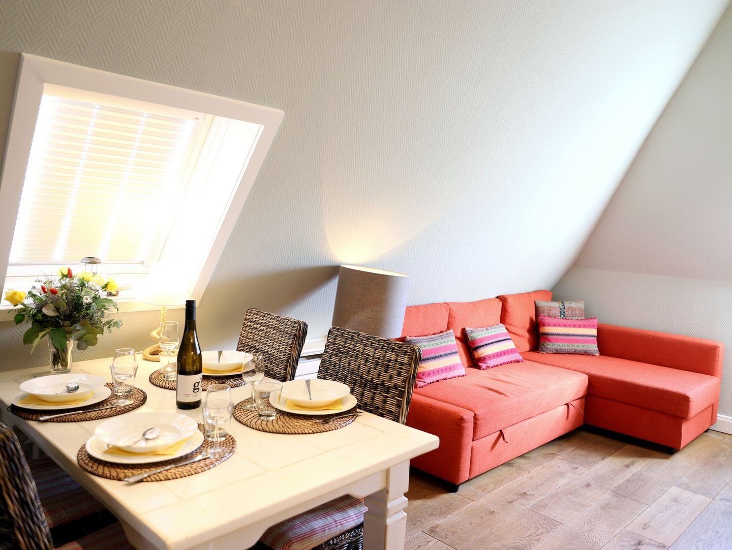 Genießen Sie Ihren Aufenthalt in Westerland, Sylt, in diesem gemütlichen Studio-Appartement im Dachgeschoss, nur wenige Gehminuten vom Strand und der Innenstadt entfernt. Auf ca. 40 m² bietet das Appartement Platz für bis zu 2 Personen und eignet sich ideal für Paare oder Alleinreisende. Das Wohnzimmer ist mit einer komfortablen Sitz- und Essecke sowie einem Flatscreen-TV ausgestattet, während das Schlafzimmer – ein Durchgangszimmer zum Bad – über ein Doppelbett (140 x 200 cm) und einen weiteren Flatscreen-TV verfügt. Das Badezimmer lädt mit einer Eckbadewanne und WC zum Entspannen ein. Der Gemeinschaftsgarten mit Strandkorb und Grill bietet zusätzlichen Raum für gemütliche Stunden im Freien. Haustiere sind herzlich willkommen, sodass auch Gäste mit Hund ihren Urlaub in vollen Zügen genießen können.
