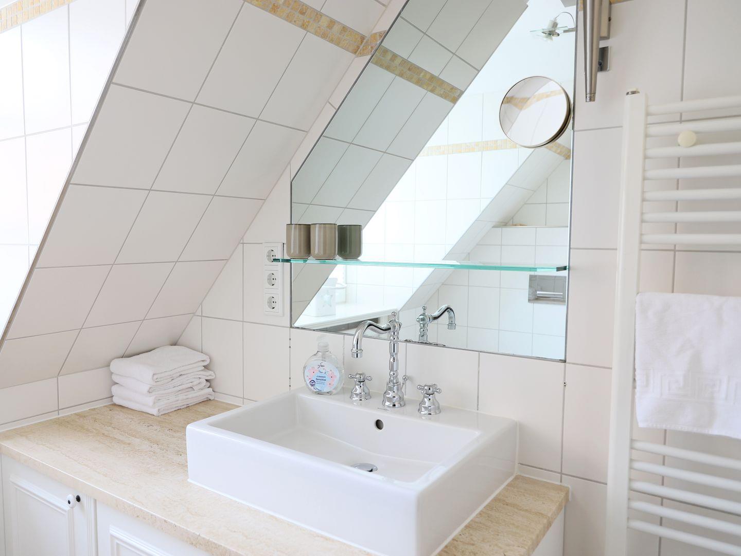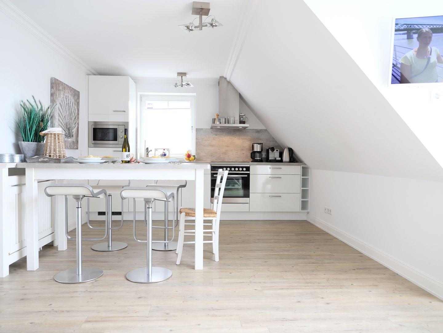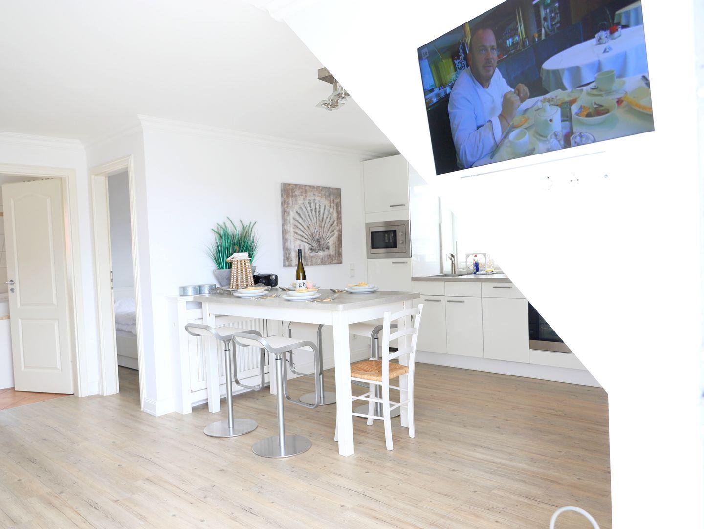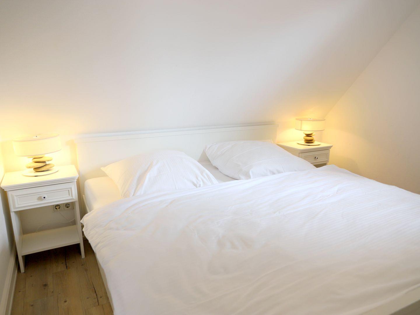 Diese helle und moderne Wohnung in Westerland bietet auf ca. 74 m² Platz für 4 Personen. Die Wohnung befindet sich im 1. Obergeschoss/Dachgeschoss und ist allergikerfreundlich. Sie verfügt über ein gemütliches Wohnzimmer mit Eckcouch, Flatscreen-TV sowie einen Essplatz. Die offene Küche ist voll ausgestattet, darunter ein Backofen, Cerankochfeld, Kühlschrank, Mikrowelle und Geschirrspüler. Zwei Schlafzimmer bieten je ein Doppelbett (180 x 200 cm und 160 x 200 cm) sowie Flatscreen-TVs. Das moderne, helle Duschbad ist mit Fenster und hochwertigen Armaturen ausgestattet. Ein schöner Süd-Balkon mit Gartentisch und Stühlen lädt zum Entspannen ein. Von hier aus können Sie das Meeresrauschen genießen. Ein kostenfreier Stellplatz befindet sich direkt vor dem Haus. Fahrräder können im Fahrradständer abgestellt werden (kein garantierter Stellplatz). Rauchen ist nur auf dem Balkon gestattet.