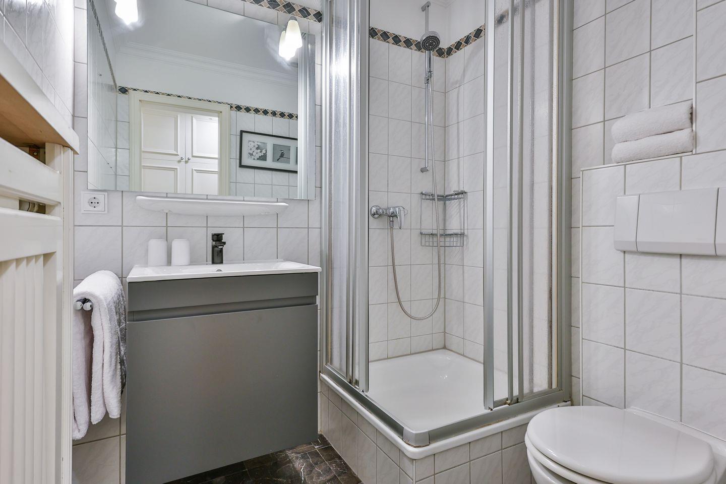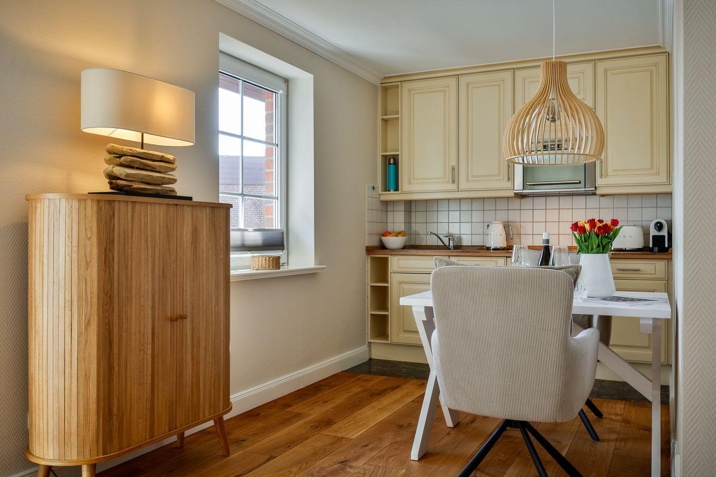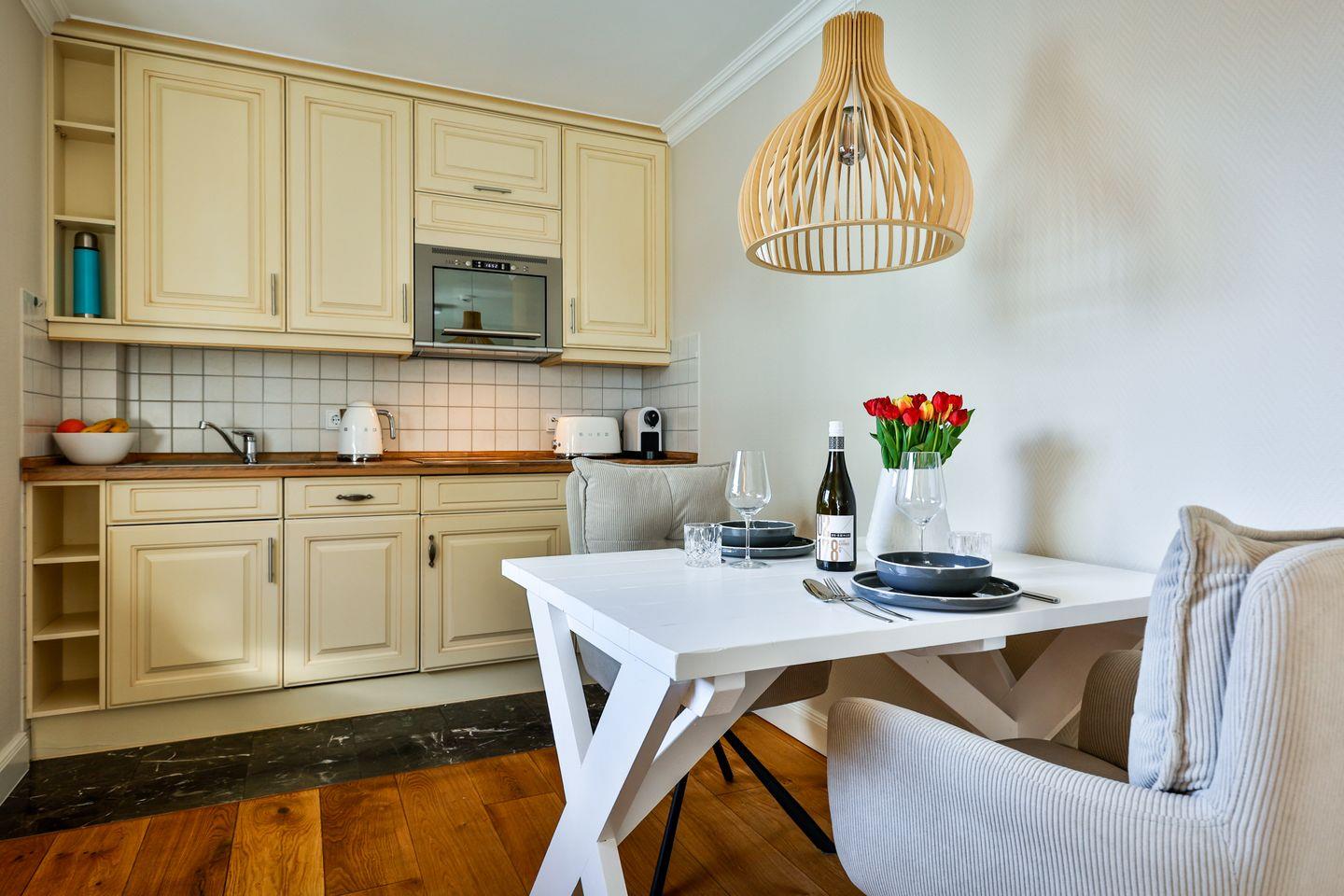 Diese hochwertige 2-Zimmer-Wohnung im 1. Obergeschoss bietet auf ca. 43 m² Platz für 2 Personen. Der kombinierte Wohn-/Essbereich ist mit einem Flatscreen-TV, einer Stereoanlage und einer gemütlichen Essecke ausgestattet. Die offene Küchenzeile ist mit einem 4-Platten-Cerankochfeld, Mikrowelle, Geschirrspüler, Kühlschrank und Kaffeemaschine bestens für Selbstversorger geeignet. Das Schlafzimmer verfügt über ein Doppelbett (160 x 200 cm) und ebenfalls einen Flatscreen-TV. Das Badezimmer ist mit einer Dusche und WC ausgestattet. Zwei kleine Balkone (Süd- und Westlage) bieten Platz für entspannte Stunden im Freien. Im Außenbereich steht ein geräumiger Gemeinschaftsgarten zur Verfügung. Für Ihre Fahrräder gibt es einen Fahrradständer am Haus. Ein kostenfreier Stellplatz für Ihr Auto ist direkt am Gebäude vorhanden. Im Untergeschoss des Hauses können Sie die Sauna (mit Münzautomat), Waschmaschine und Trockner (Münzbetrieb) nutzen. Haustiere sind willkommen.