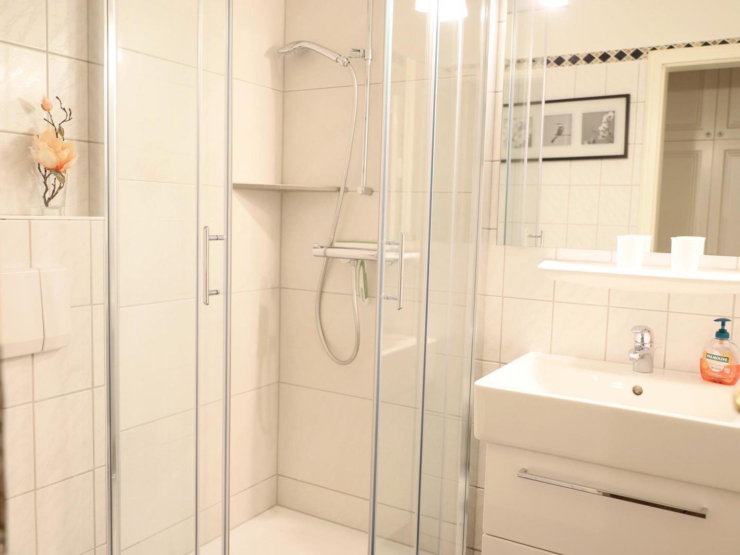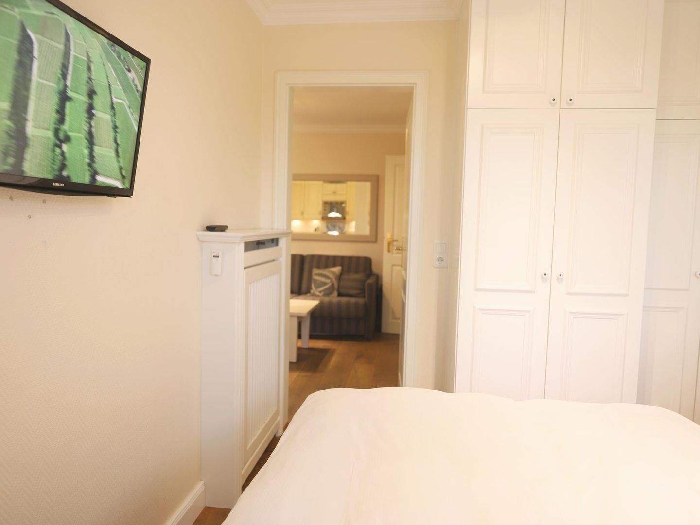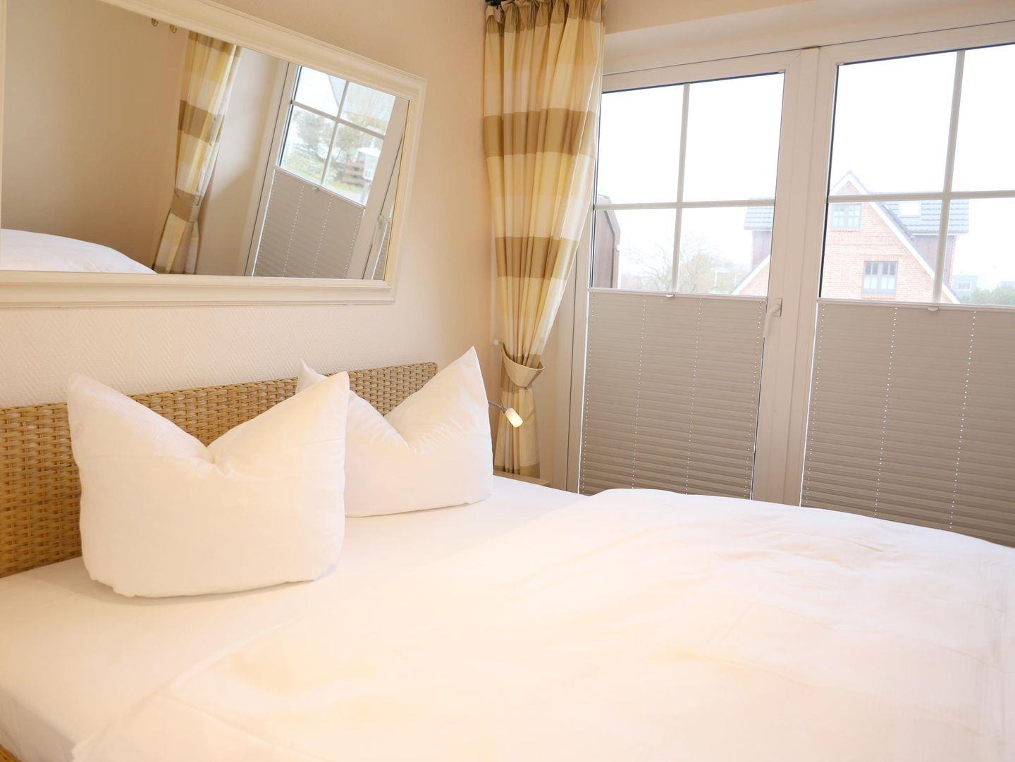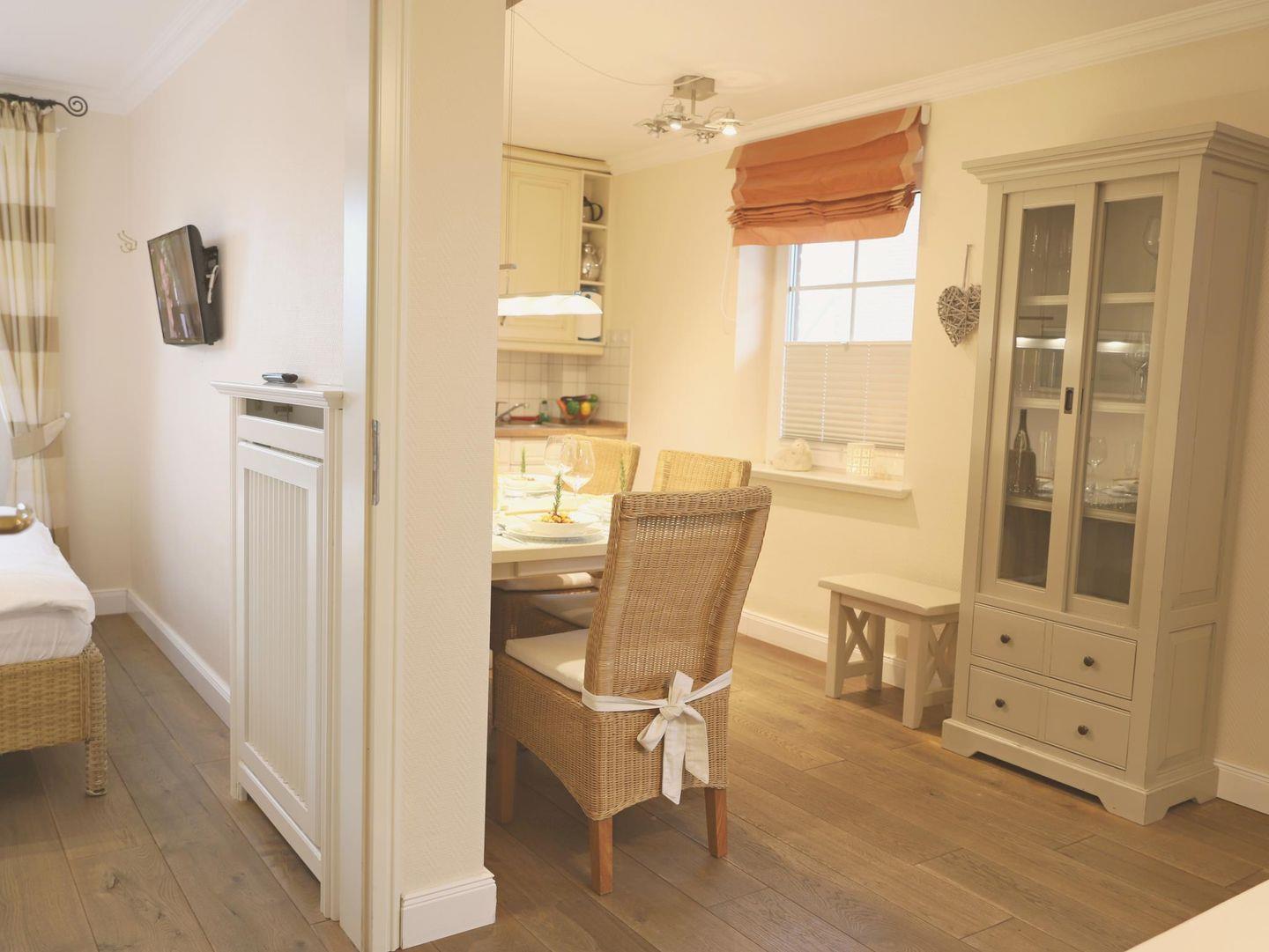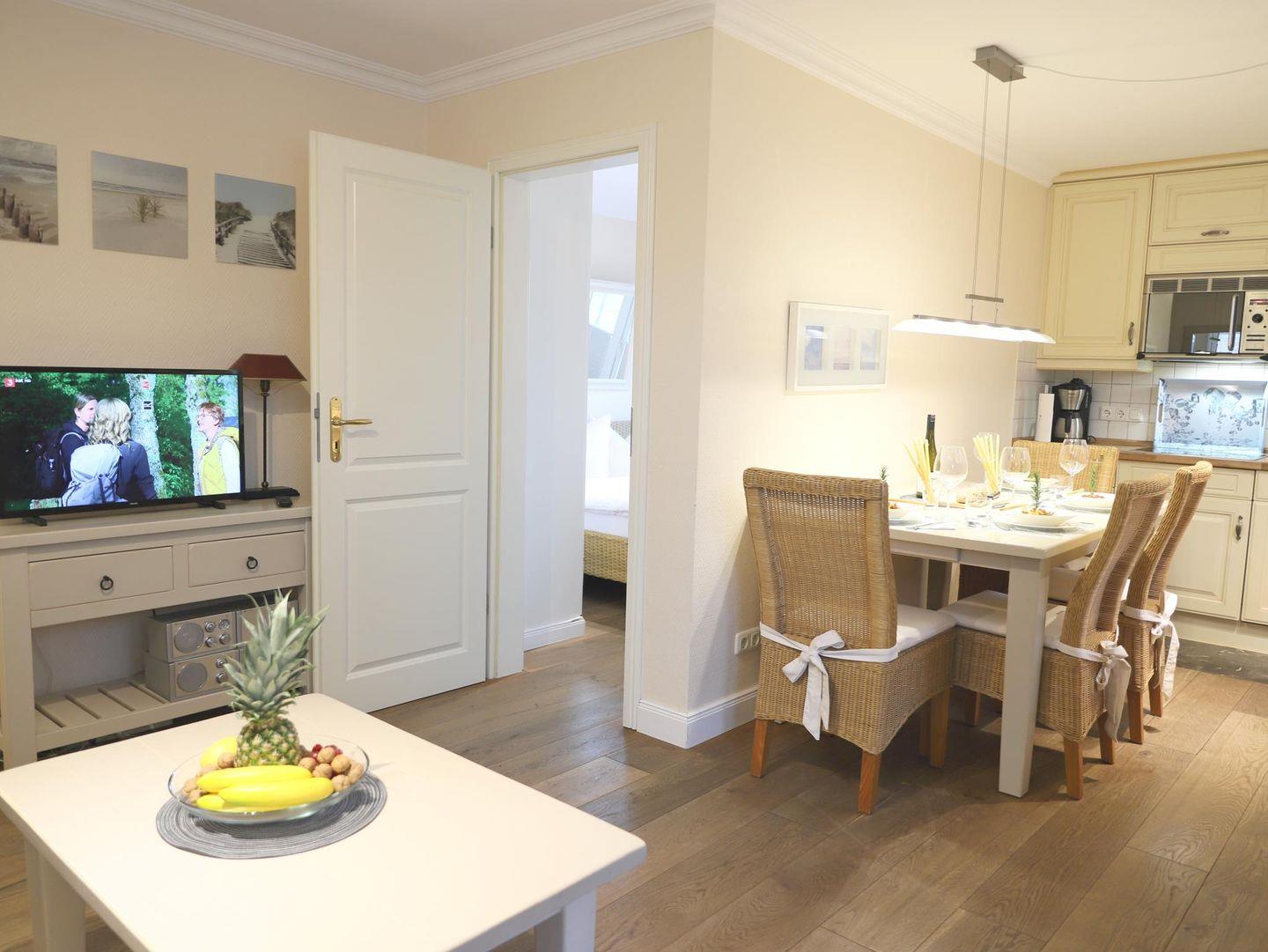 Diese komfortable 2-Zimmer-Wohnung im 1. Obergeschoss bietet auf ca. 43 m² Platz für 4 Personen. Der gemütliche Wohn-/Essbereich ist mit einer Schlafcouch (160 x 200 cm), Flatscreen-TV, Stereoanlage und einer Essecke ausgestattet. Die offene, gut ausgestattete Küchenzeile umfasst ein 4-Platten-Cerankochfeld, Mikrowelle, Geschirrspüler, Kühlschrank und Kaffeemaschine. Das Schlafzimmer ist mit einem Doppelbett (160 x 200 cm) und einem weiteren Flatscreen-TV versehen. Das moderne Badezimmer verfügt über eine Dusche und ein WC. Zwei kleine Balkone in Süd- und Ostausrichtung bieten Platz für Entspannung im Freien. Im Außenbereich finden Sie einen Gemeinschaftsgarten mit Strandkörben.