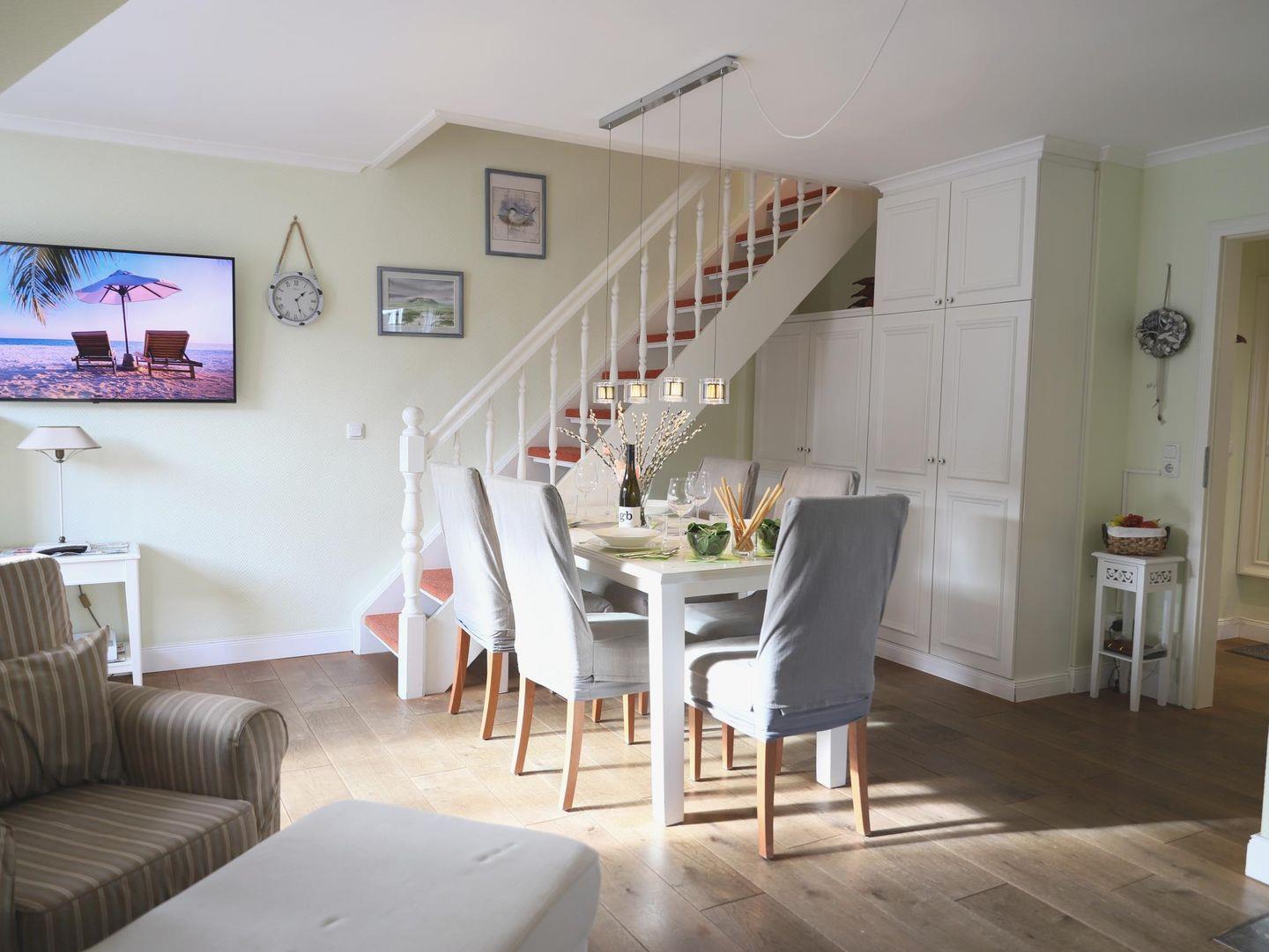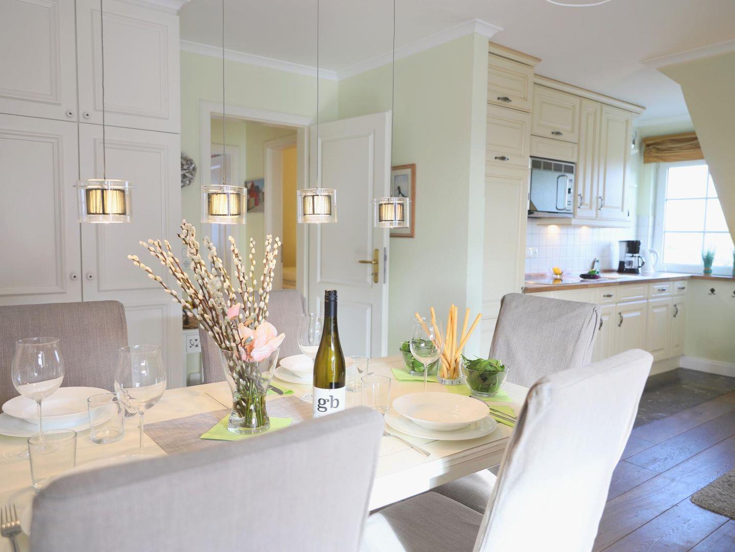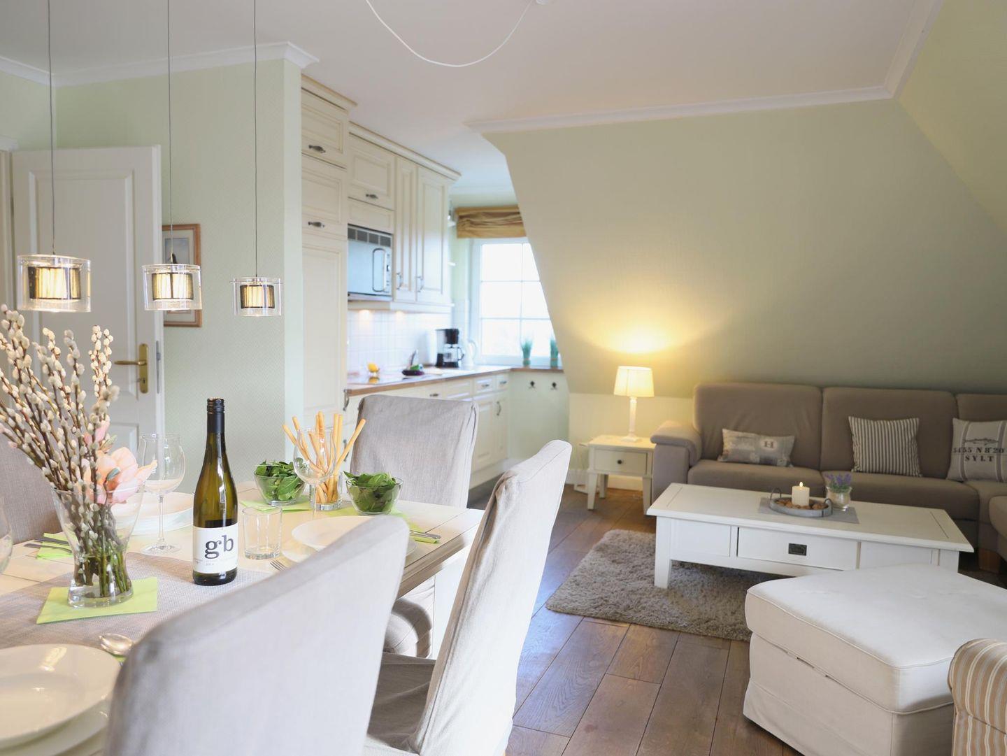 Diese hochwertige 3-Zimmer-Wohnung im 2. Obergeschoss bietet auf ca. 60 m² Platz für bis zu 4 Personen. Der Wohn-/Essbereich ist mit einer Schlafcouch (150 x 160 cm), Flatscreen-TV, Stereoanlage und WLAN ausgestattet. Die offene Küchenzeile enthält ein 4-Platten-Cerankochfeld, Mikrowelle, Geschirrspüler, Kühlschrank und Kaffeemaschine.