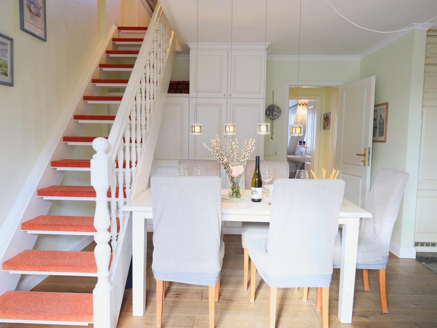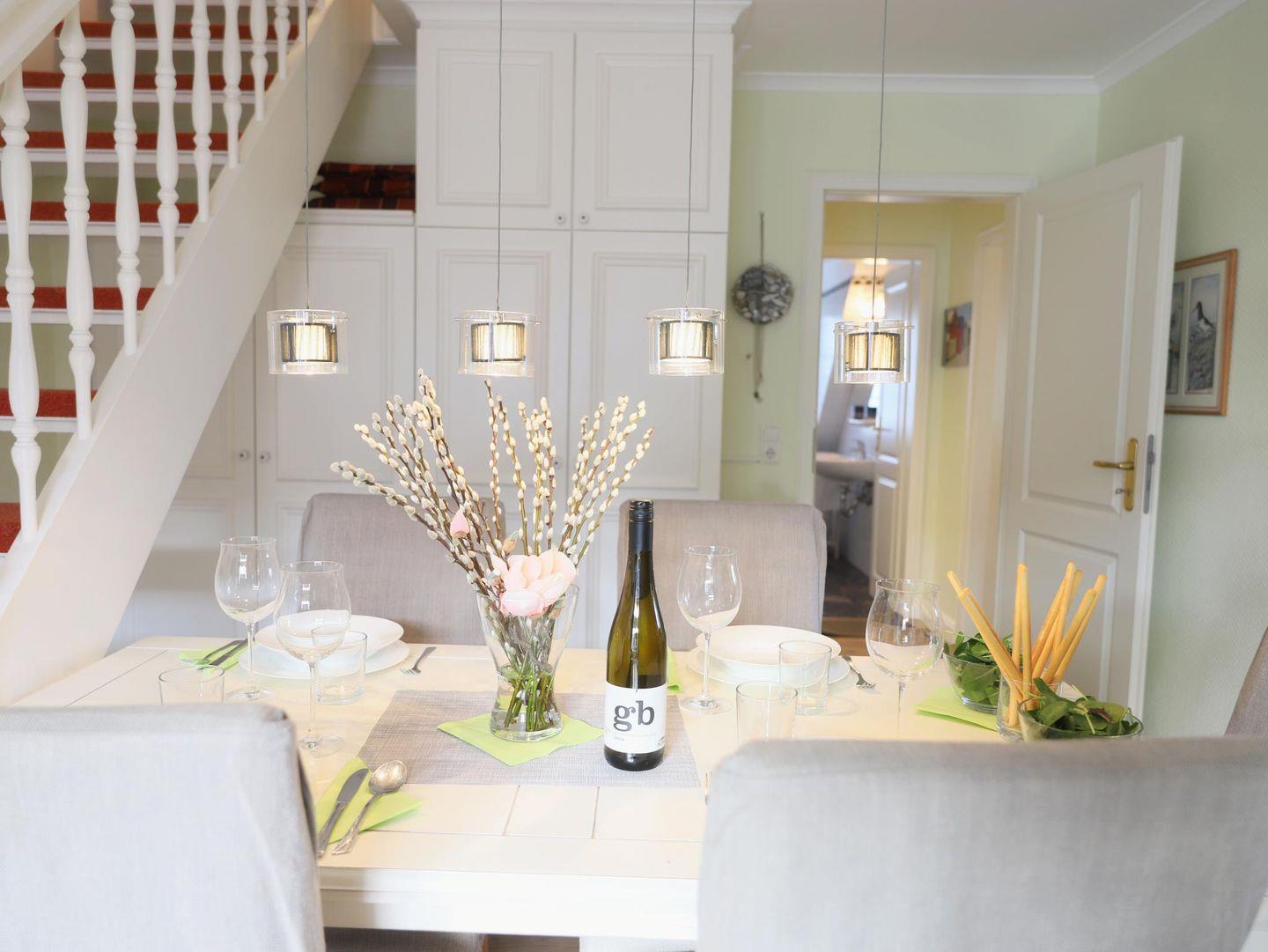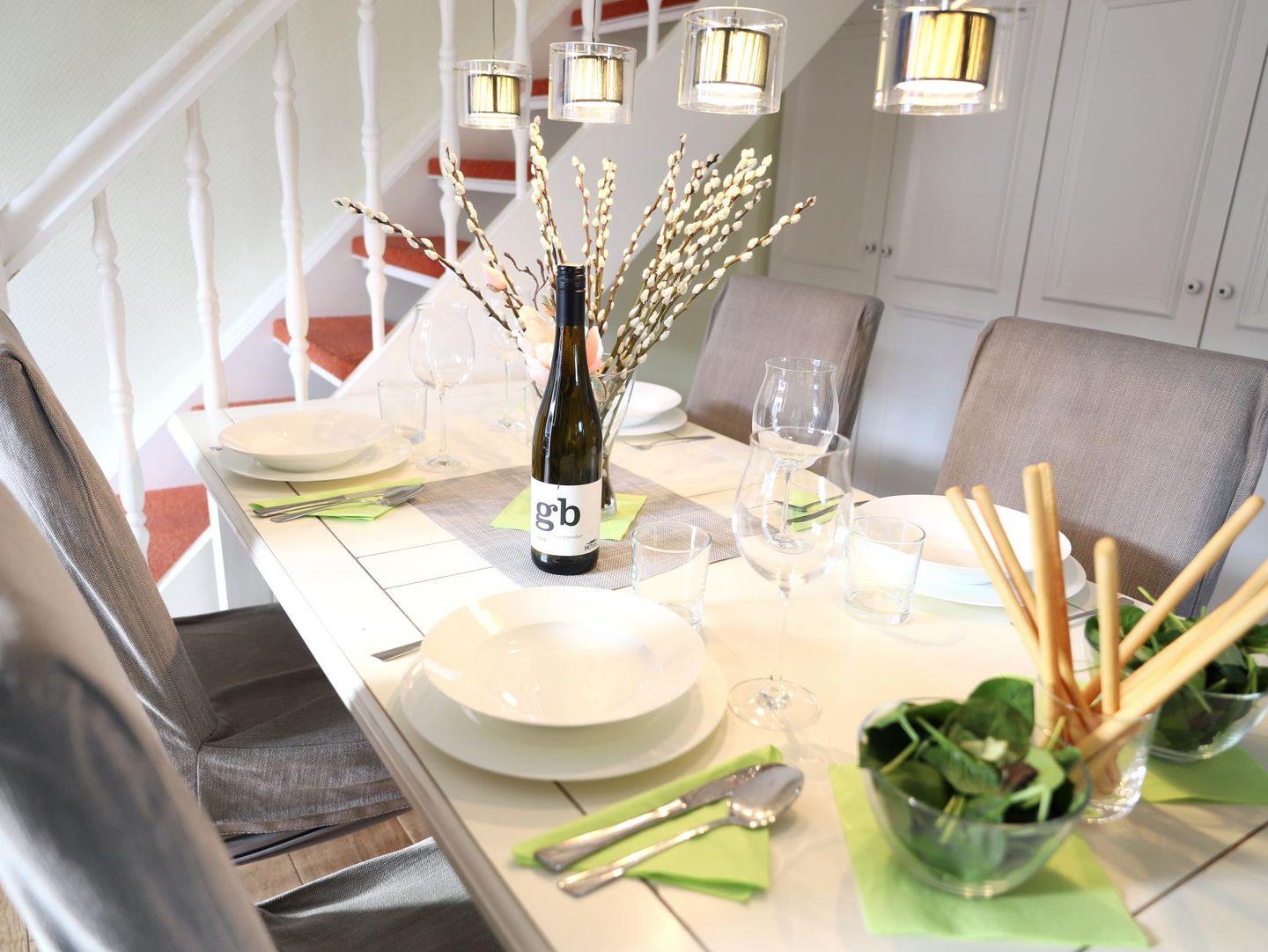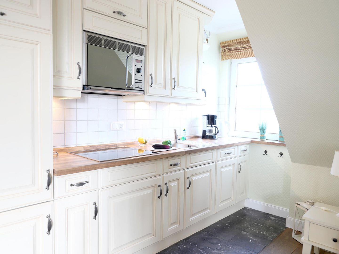 Diese hochwertige 3-Zimmer-Wohnung im 2. Obergeschoss bietet auf ca. 60 m² Platz für bis zu 4 Personen. Der Wohn-/Essbereich ist mit einer Schlafcouch (150 x 160 cm), Flatscreen-TV, Stereoanlage und WLAN ausgestattet. Die offene Küchenzeile enthält ein 4-Platten-Cerankochfeld, Mikrowelle, Geschirrspüler, Kühlschrank und Kaffeemaschine.