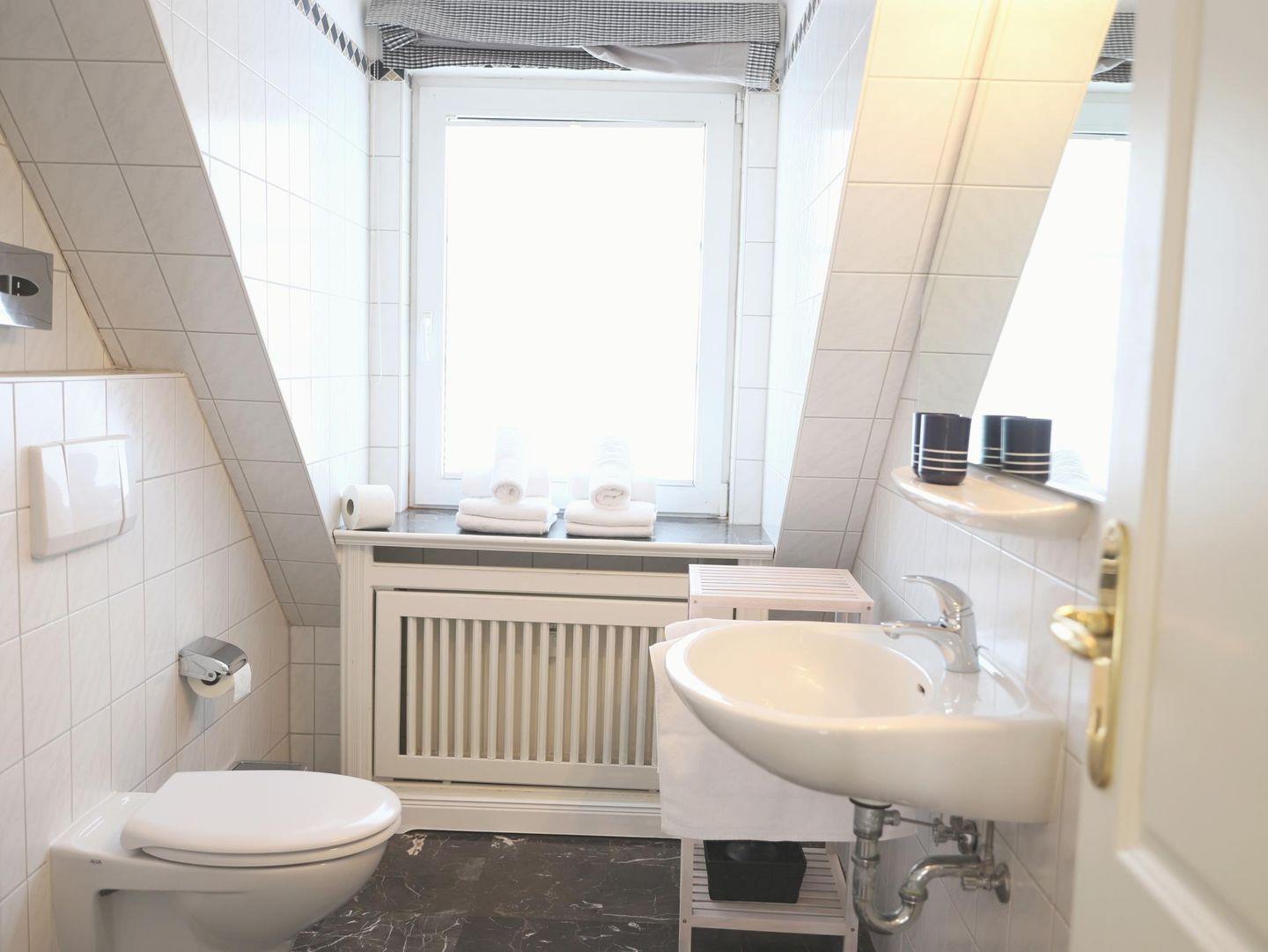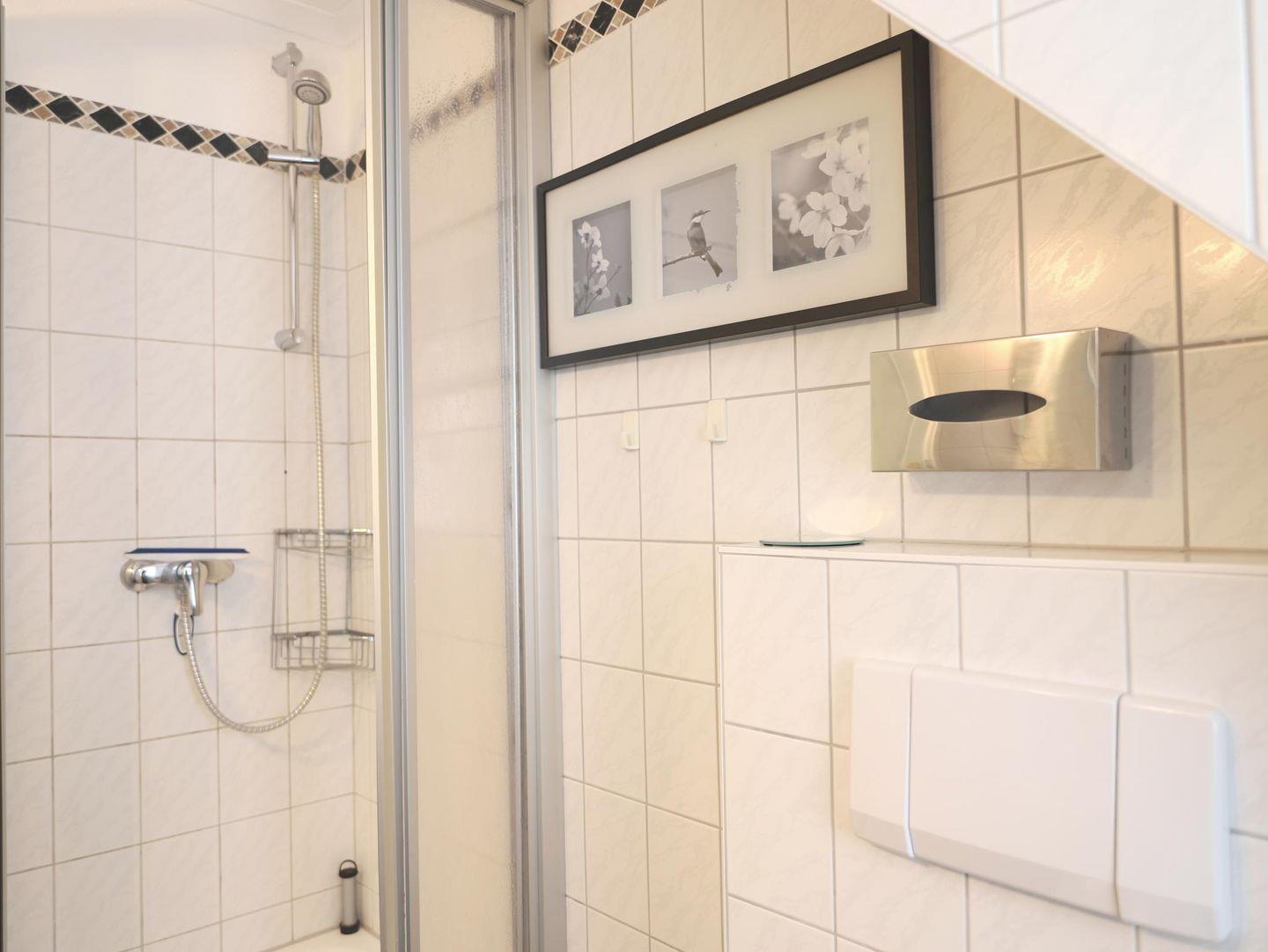 Das Schlafzimmer 1 bietet ein Doppelbett (180 x 200 cm) und einen Flatscreen-TV. Das zweite Schlafzimmer im Spitzboden verfügt ebenfalls über ein Doppelbett (180 x 200 cm) und einen Flatscreen-TV. Das Badezimmer ist mit einer Dusche und WC ausgestattet. Genießen Sie den kleinen Süd-Balkon oder entspannen Sie im schön angelegten Gemeinschaftsgarten mit Strandkörben. Ein kostenfreier Stellplatz ist auf dem Grundstück verfügbar, ebenso ein Fahrradständer. Im Untergeschoss können die Sauna (mit Münzautomat), Waschmaschine und Trockner im Münzbetrieb genutzt werden. Haustiere sind willkommen.