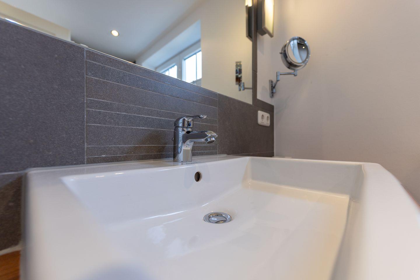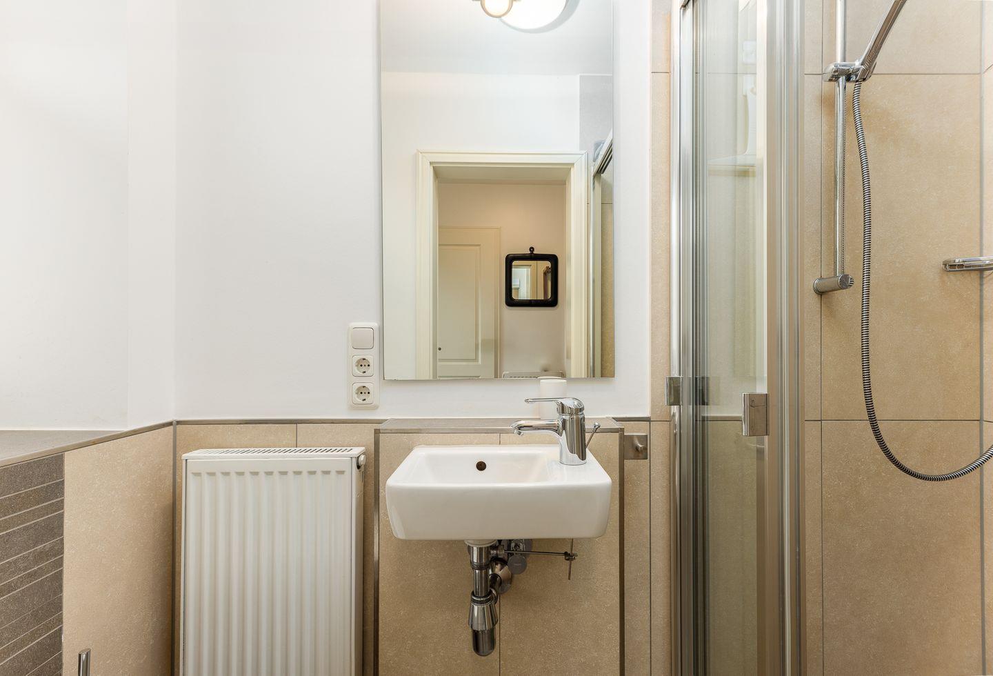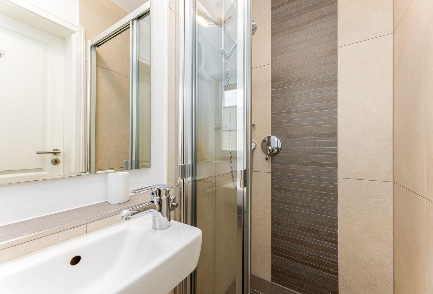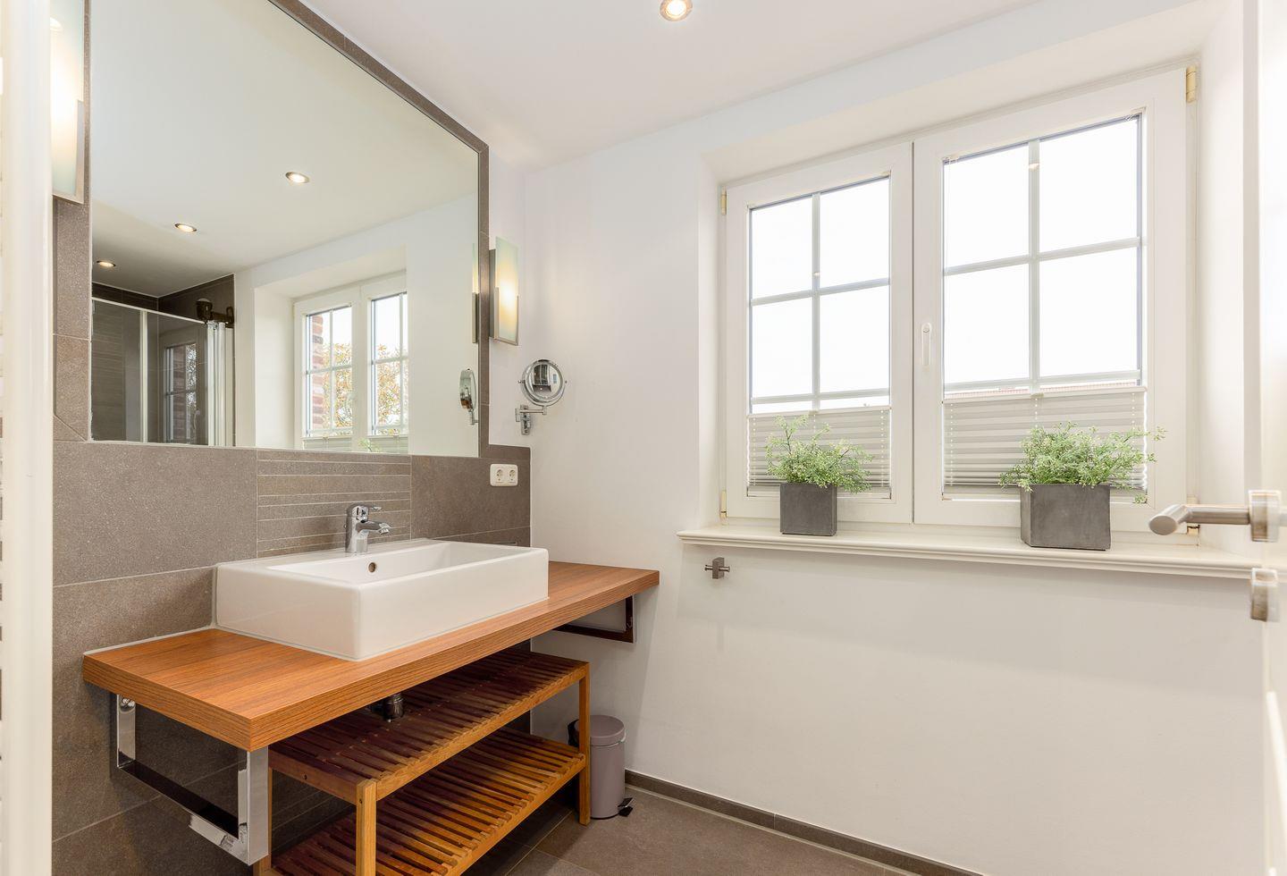 Ebenfalls im Erdgeschoss befindet sich ein ganz in Sandfarben gehaltenes Duschbad mit Tageslicht.