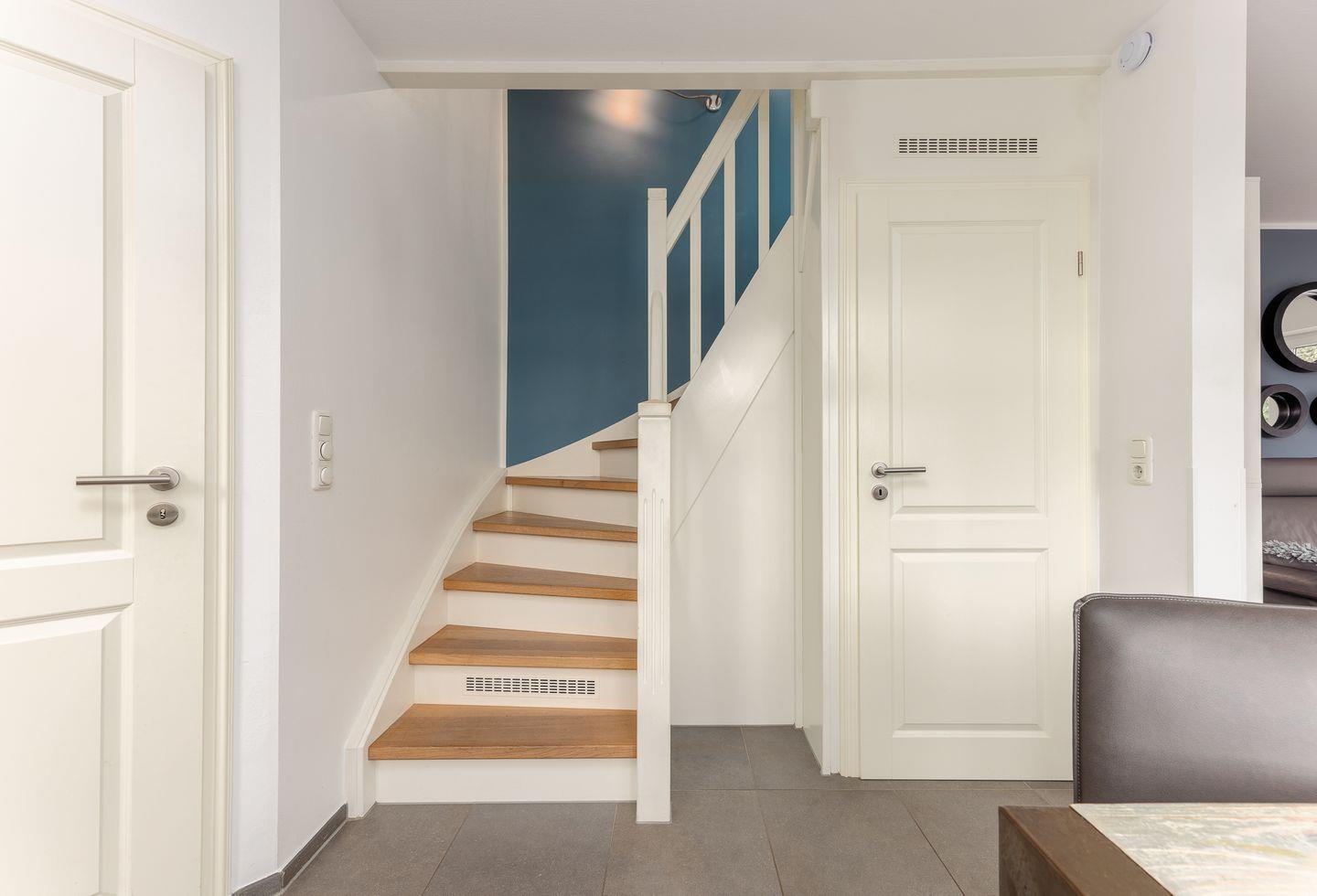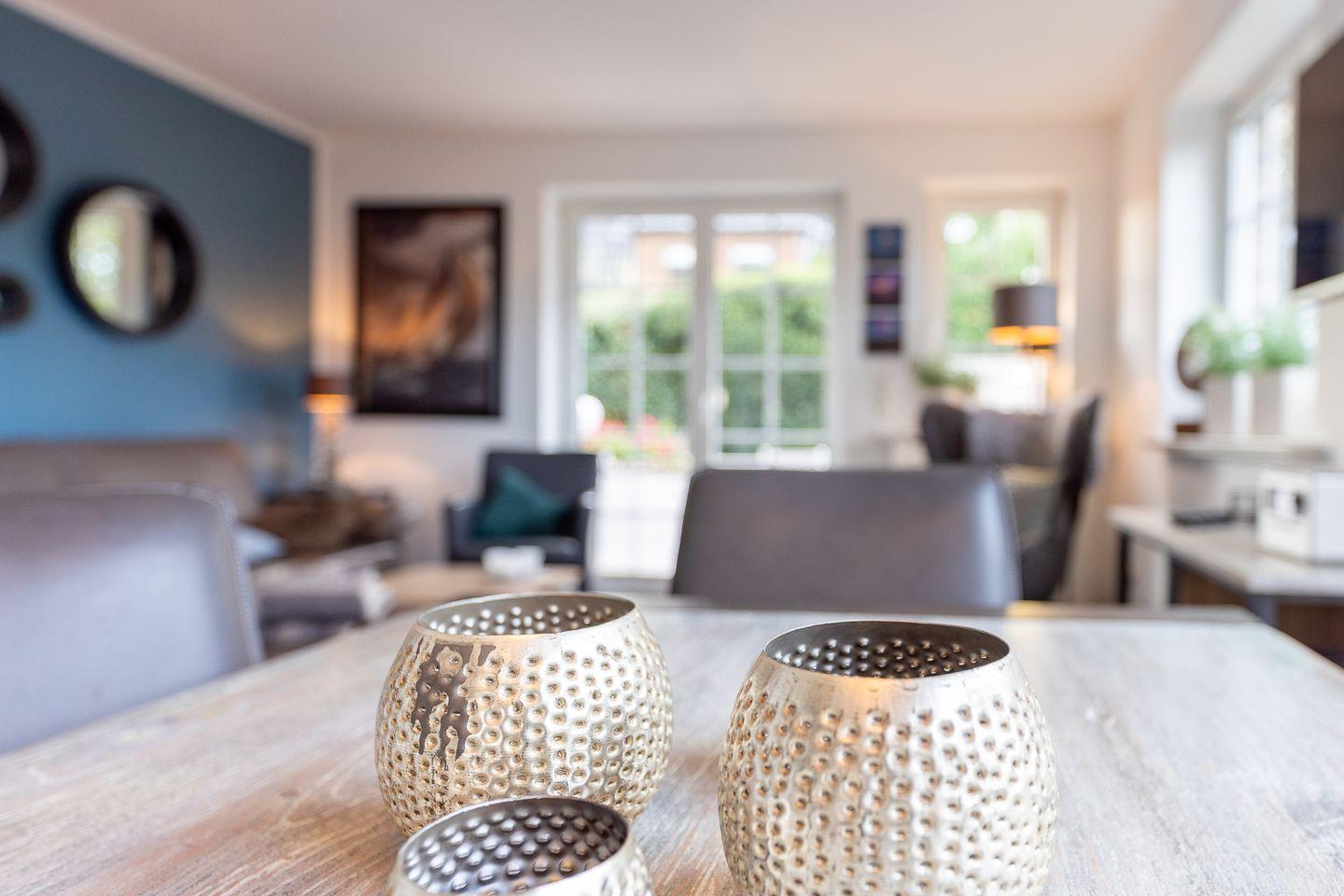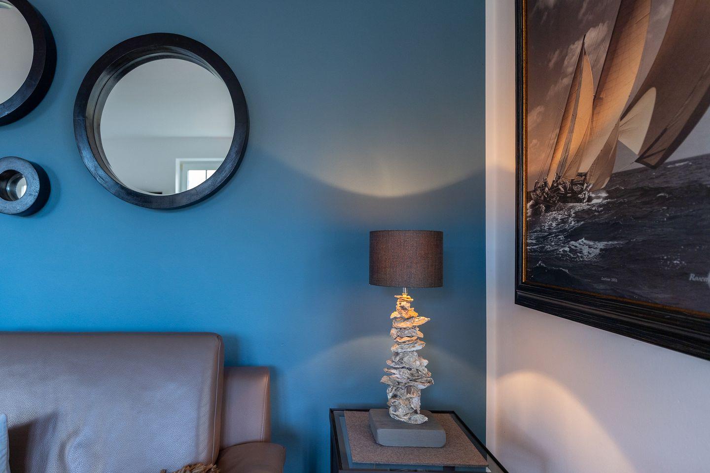 Auf drei Ebenen ist hier wunderbarer Wohnkomfort entstanden, der kaum einen Wunsch offen lässt. Im Erdgeschoss befindet sich der gut geschnittene und lichtdurchflutete Wohnbereich. Hier fällt als besonders die nordisch blaue Wand mit ihrer coolen Spiegeloptik sofort auf, die einen perfekten Rahmen zu den erdigen Tönen der Einrichtung bildet.