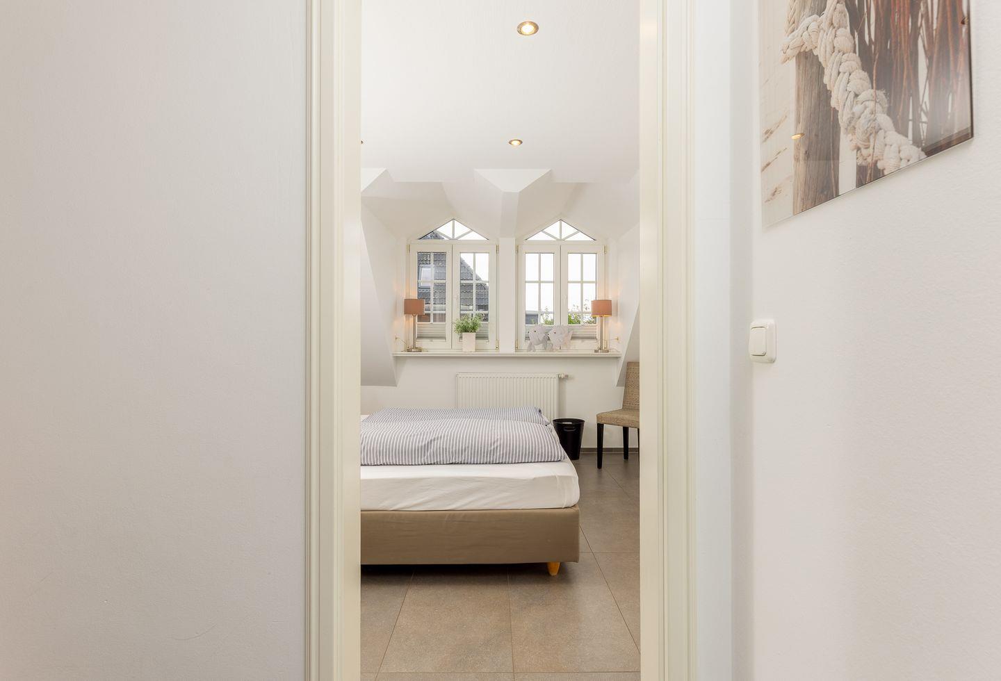 Eine Treppe höher geht es zu den beiden Schlafzimmern, von denen eines über ein komfortables Doppelbett und das andere über ein nicht minder bequemes Einzelbett verfügt. Durch erdige Farben und weiße Einbauten sind hier zwei wundervolle Rückzugsorte, die zum Entspannen einladen, entstanden. Und auch das große Badezimmer knüpft an die harmonische Farbwahl an.