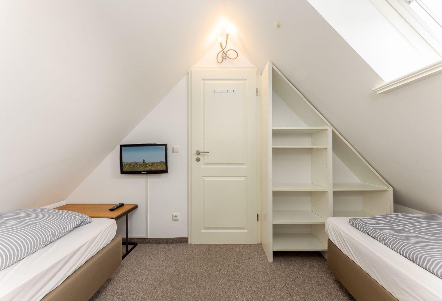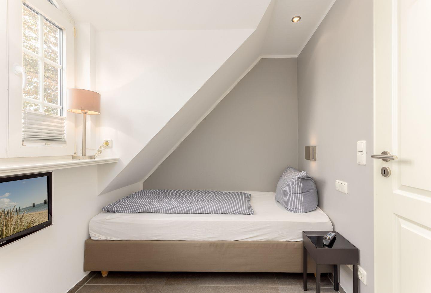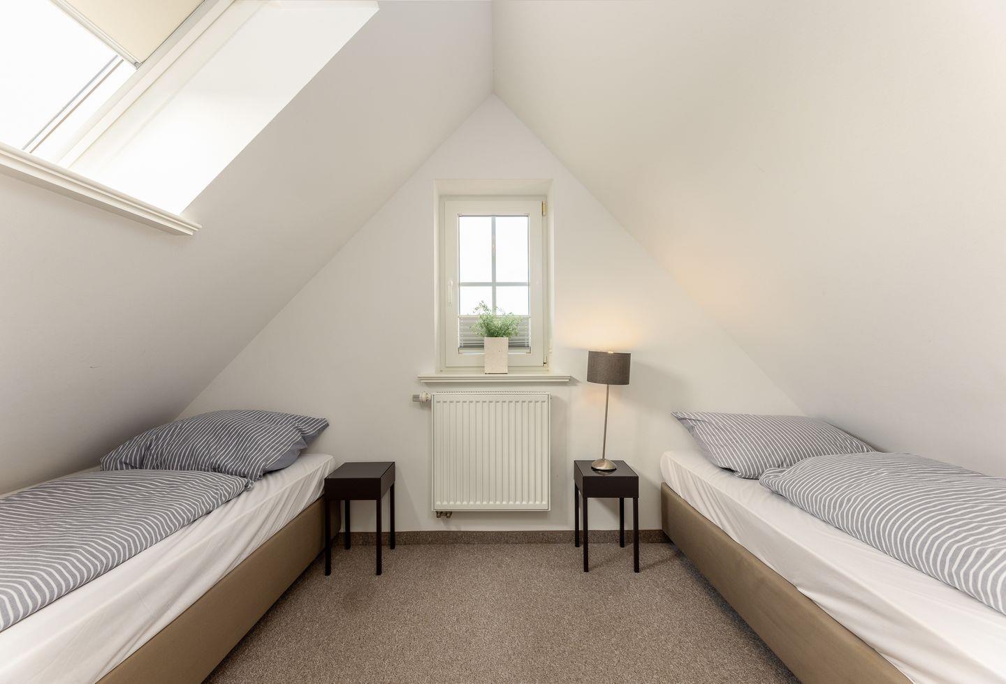 Doch damit nicht genug: Gleich unterm Himmel befindet sich das Dachgeschoss in dem zwei Einzelbetten zu süßen träumen einladen.