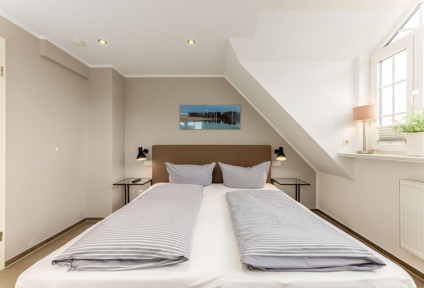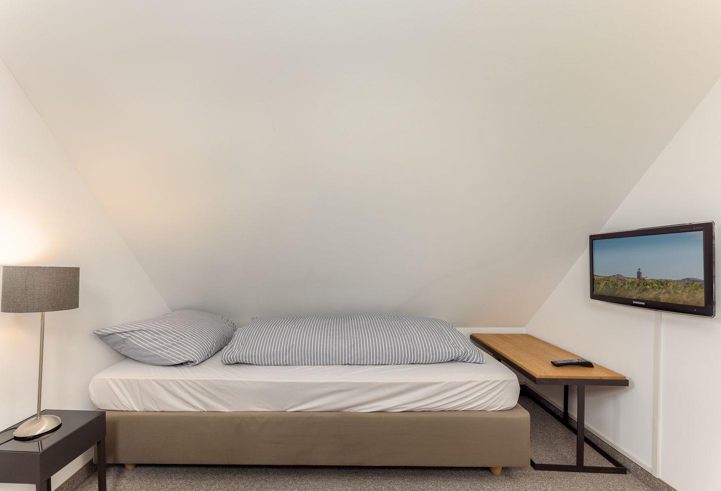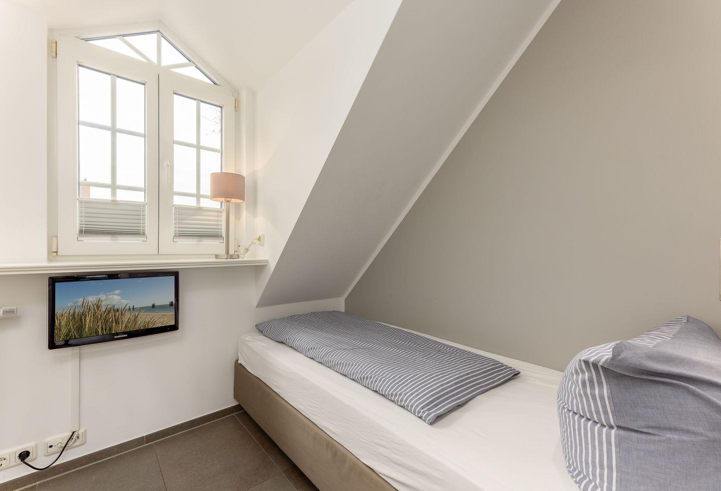 Doch damit nicht genug: Gleich unterm Himmel befindet sich das Dachgeschoss in dem zwei Einzelbetten zu süßen träumen einladen.