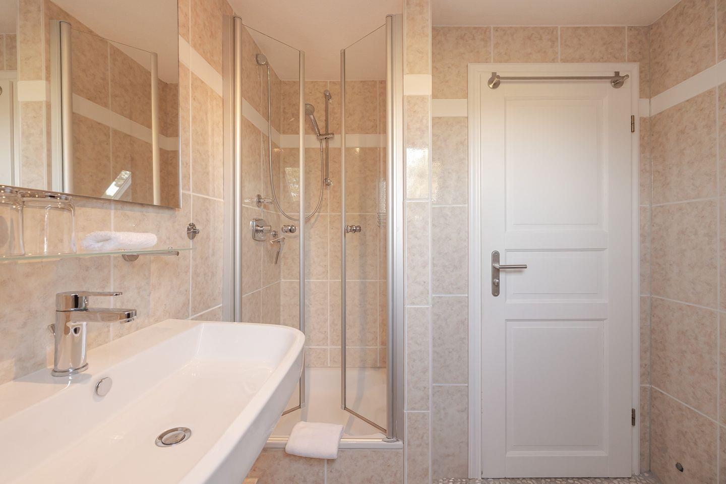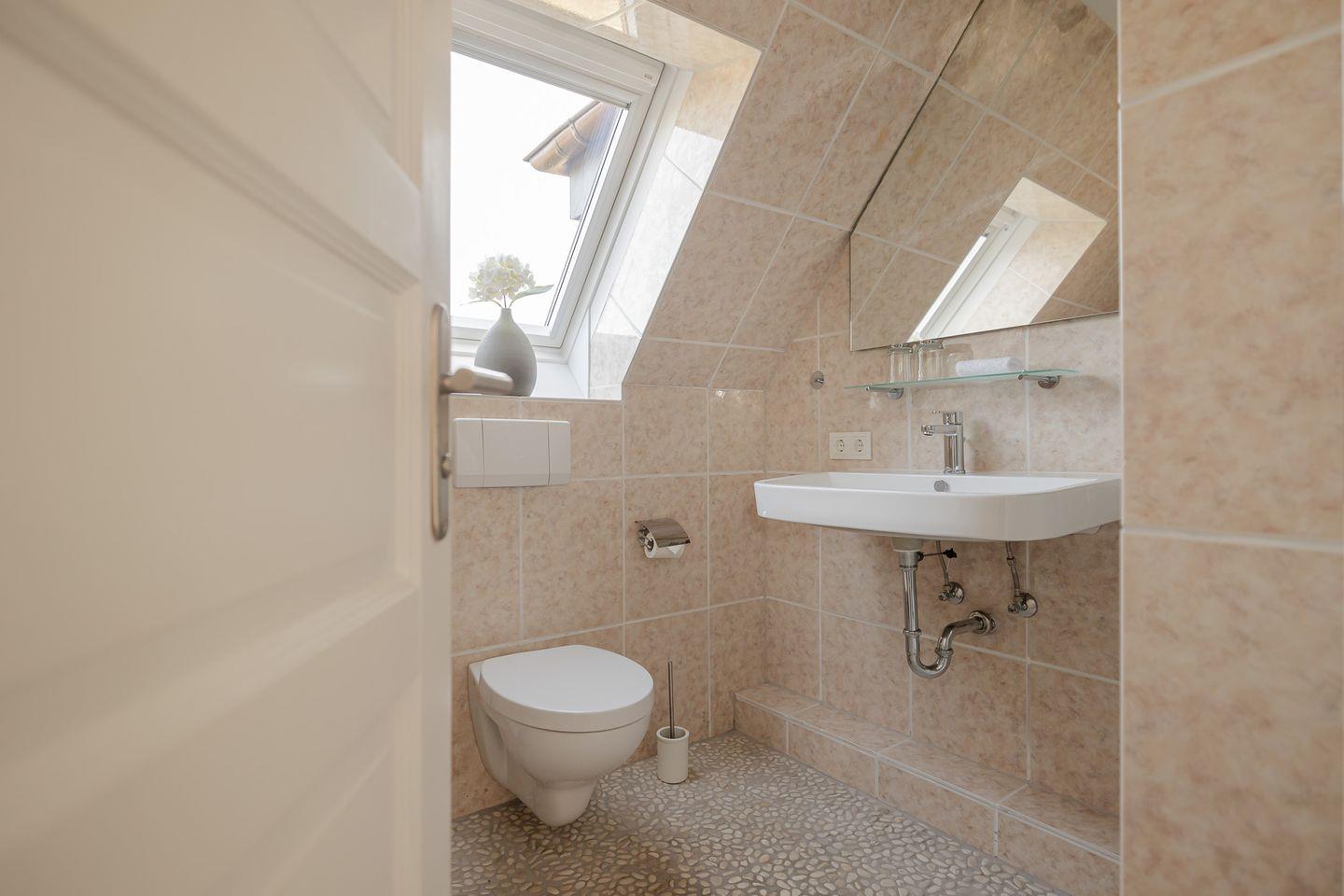 Die Wohnung befindet sich im ersten Obergeschoss und ist zum Garten hin ausgerichtet. Vom eigenen Balkon aus lässt sich der Blick ins Grüne genießen – morgens mit einer Tasse Kaffee, abends bei einem Glas Wein, begleitet von frischer Luft und angenehmer Ruhe.