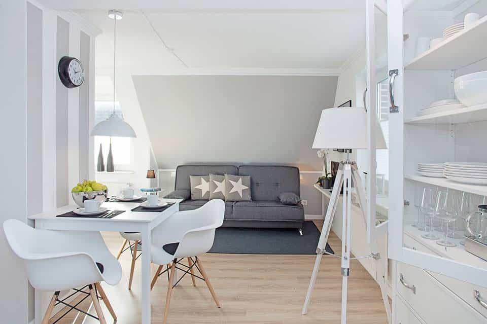 Auf etwa 45 m² bietet die Wohnung Platz für bis zu drei Personen. Der Wohnbereich ist offen und lichtdurchflutet gestaltet. Sofa und Essplatz bilden einen stimmigen Mittelpunkt für gemeinsame Zeit – ruhig, entspannt und mit einer Atmosphäre, die sofort ankommen lässt.