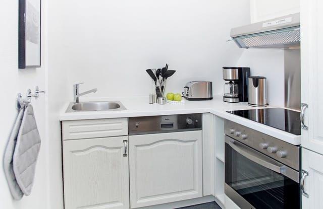 Die integrierte Küche ist vollständig ausgestattet und bietet alles, was man im Urlaub gern nutzt: Herd, Backofen, Geschirrspüler und Mikrowelle. Kochen darf hier unkompliziert sein – ob für den kleinen Hunger zwischendurch oder ein gemeinsames Abendessen.