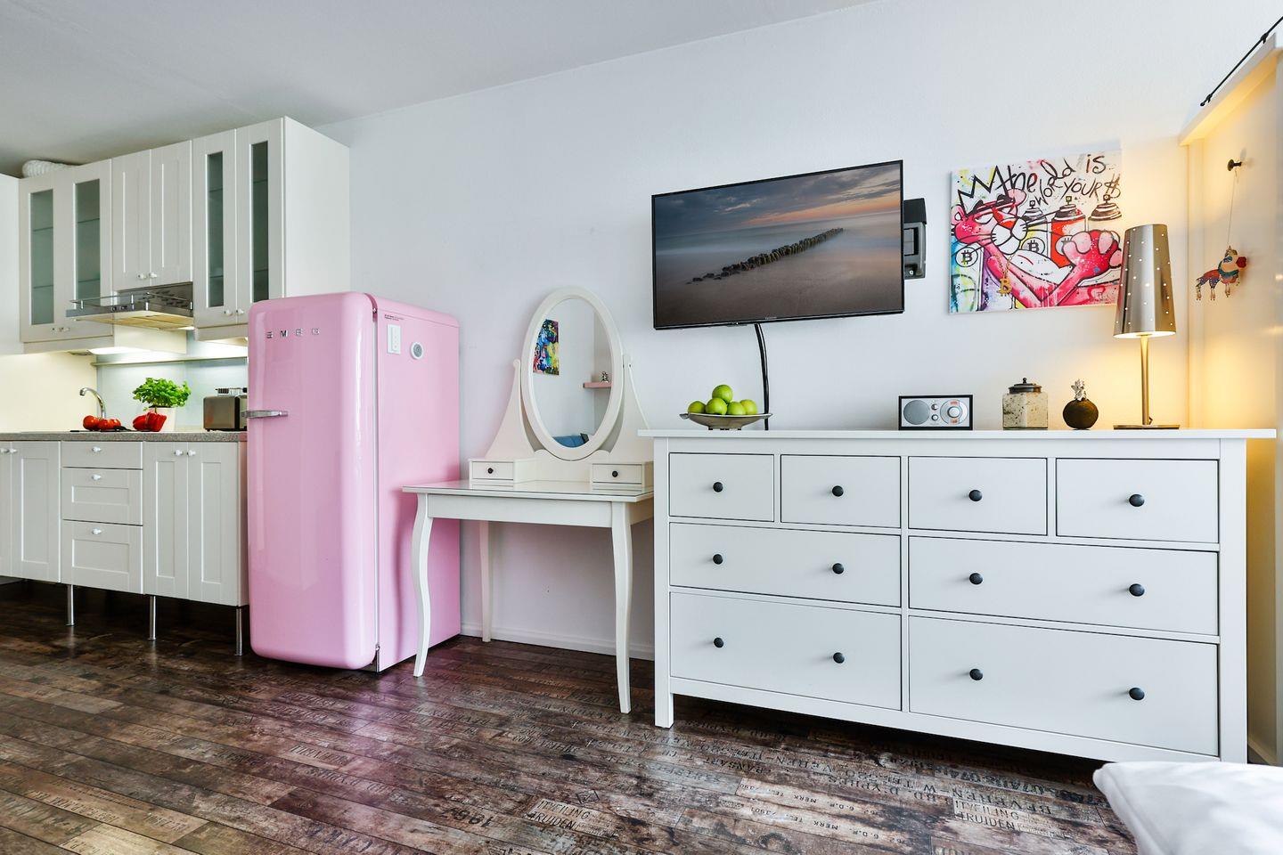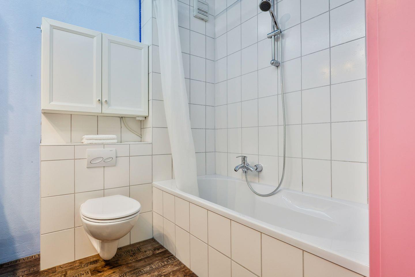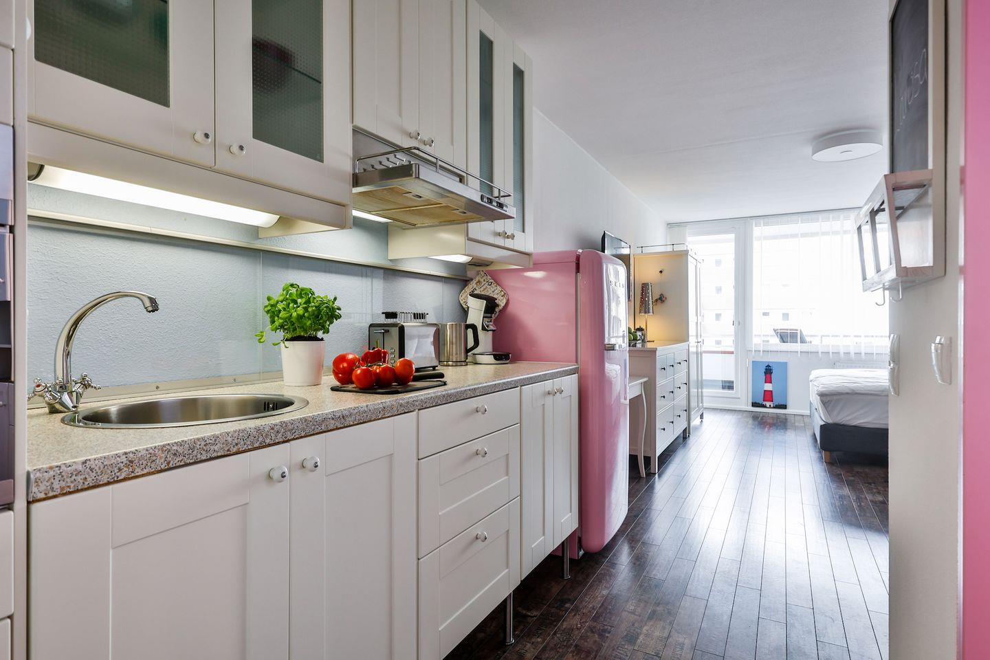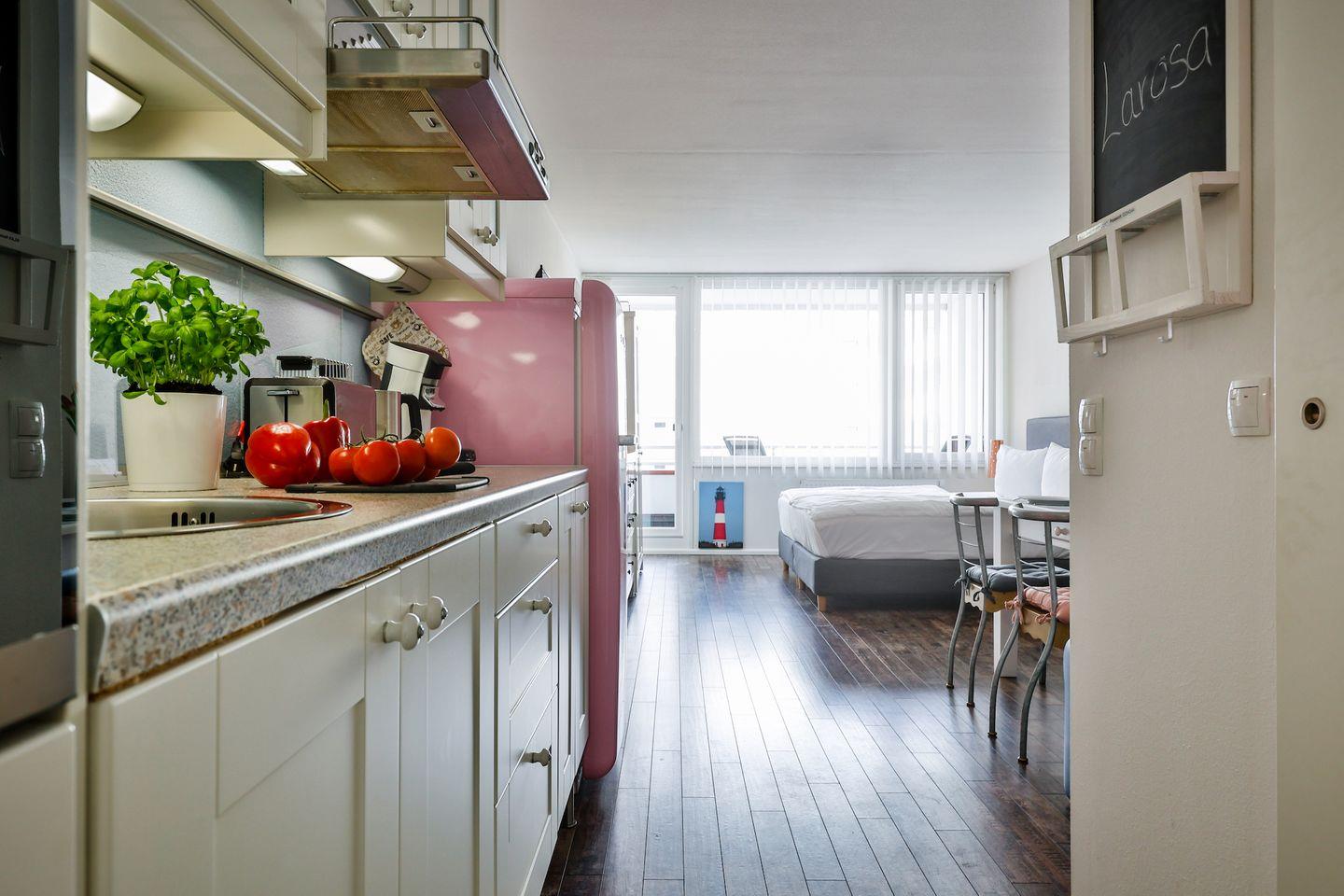 Die Wohnung hat einen gemütlichen Wohn-/Schlafraum mit Westausrichtung, eine Küchenzeile und ein modernes Bad mit Badewanne. Im Wohn-/Schlafraum erwartet Sie ein Boxspringbett (180x200 cm), Sitz und Essgruppe mit Sofa, ein Flatscreen-TV und genügend Stauraum in den Schränken. Die Küche ist mit allem für einen nächsten Kochabend ausgestattet.