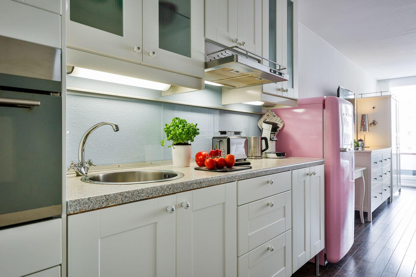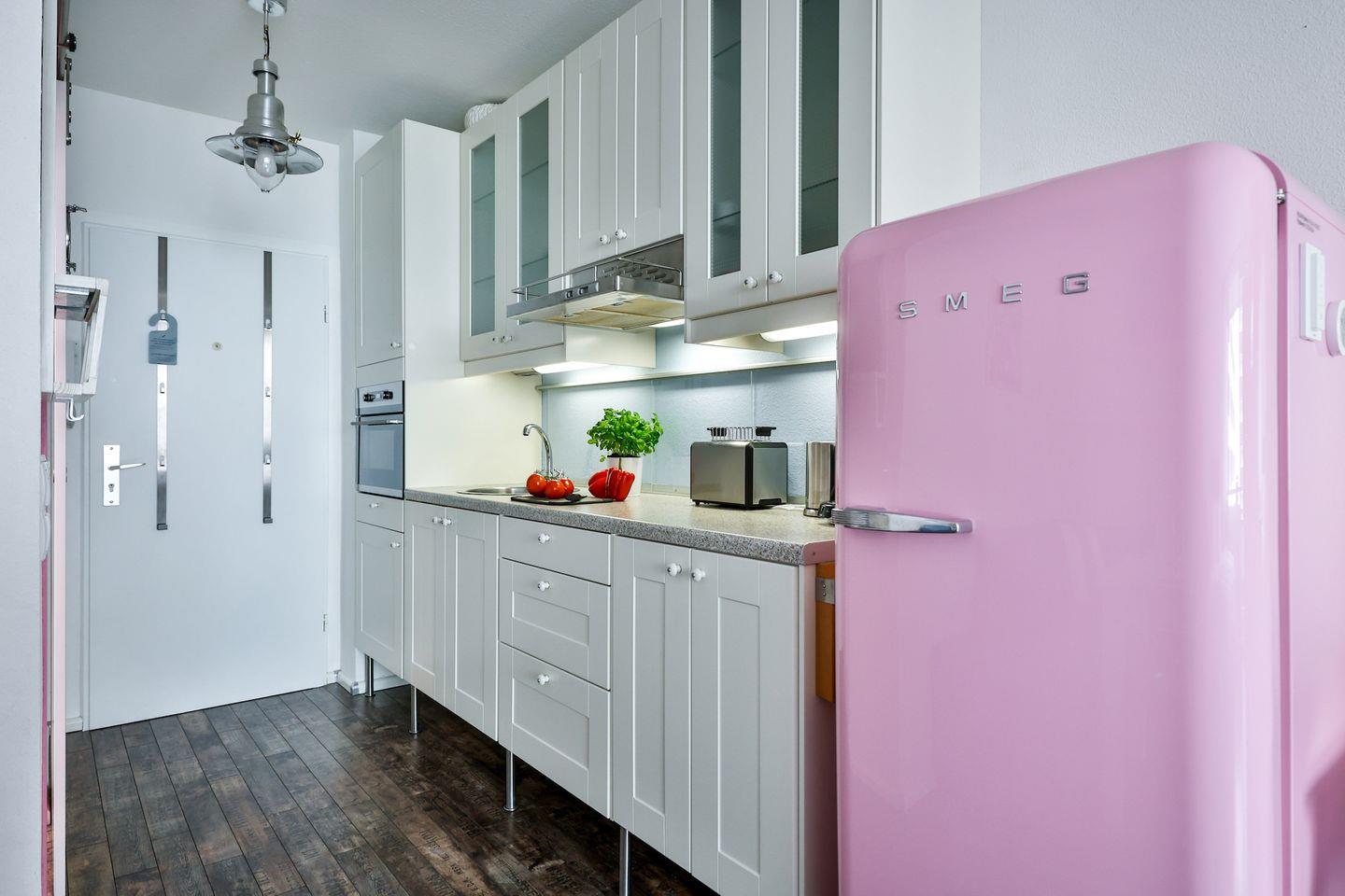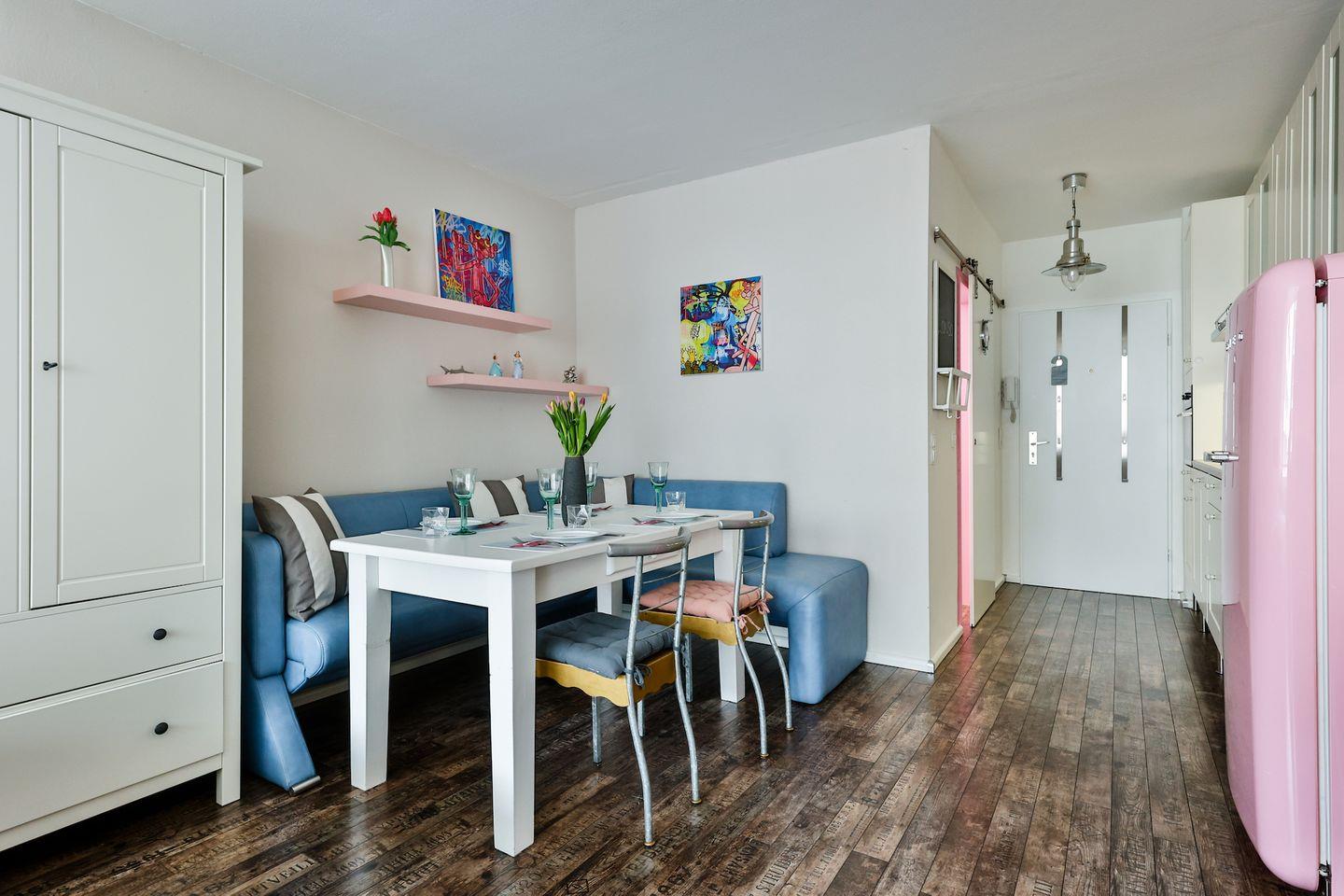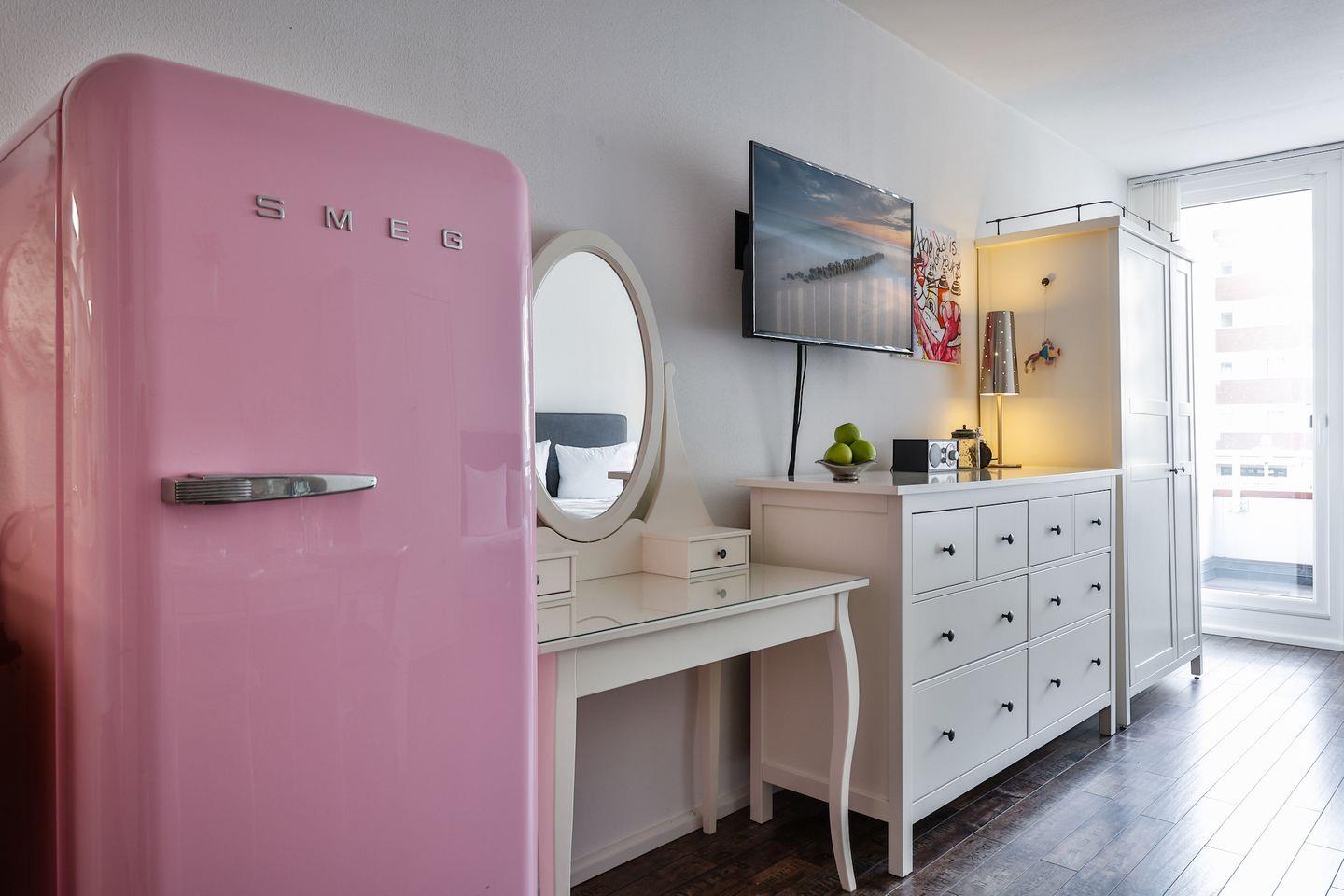 Die Wohnung hat einen gemütlichen Wohn-/Schlafraum mit Westausrichtung, eine Küchenzeile und ein modernes Bad mit Badewanne. Im Wohn-/Schlafraum erwartet Sie ein Boxspringbett (180x200 cm), Sitz und Essgruppe mit Sofa, ein Flatscreen-TV und genügend Stauraum in den Schränken. Die Küche ist mit allem für einen nächsten Kochabend ausgestattet.