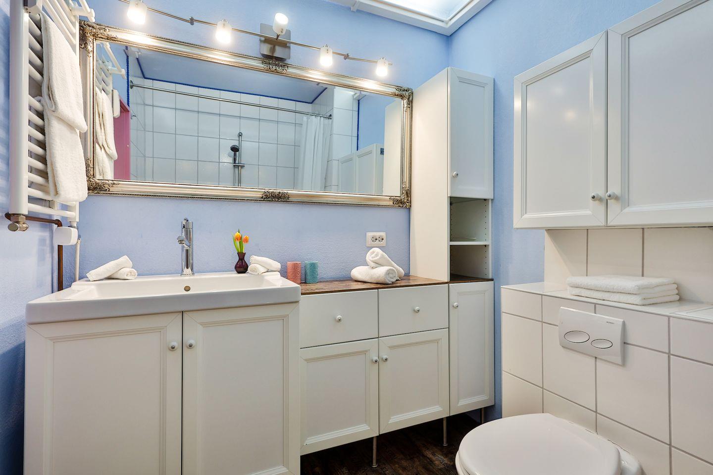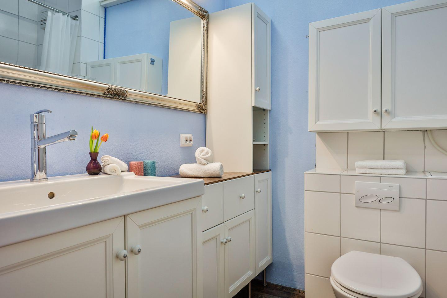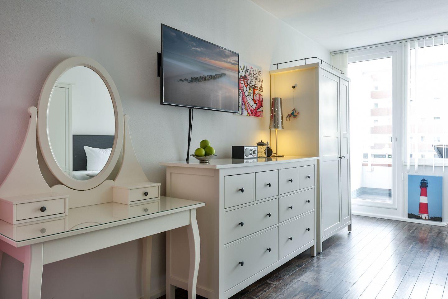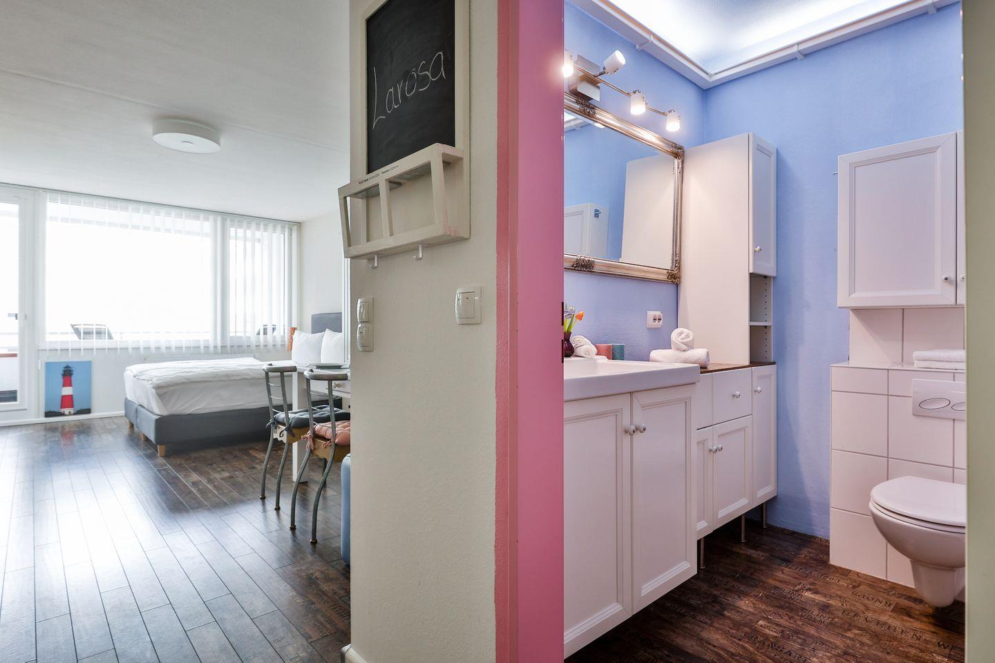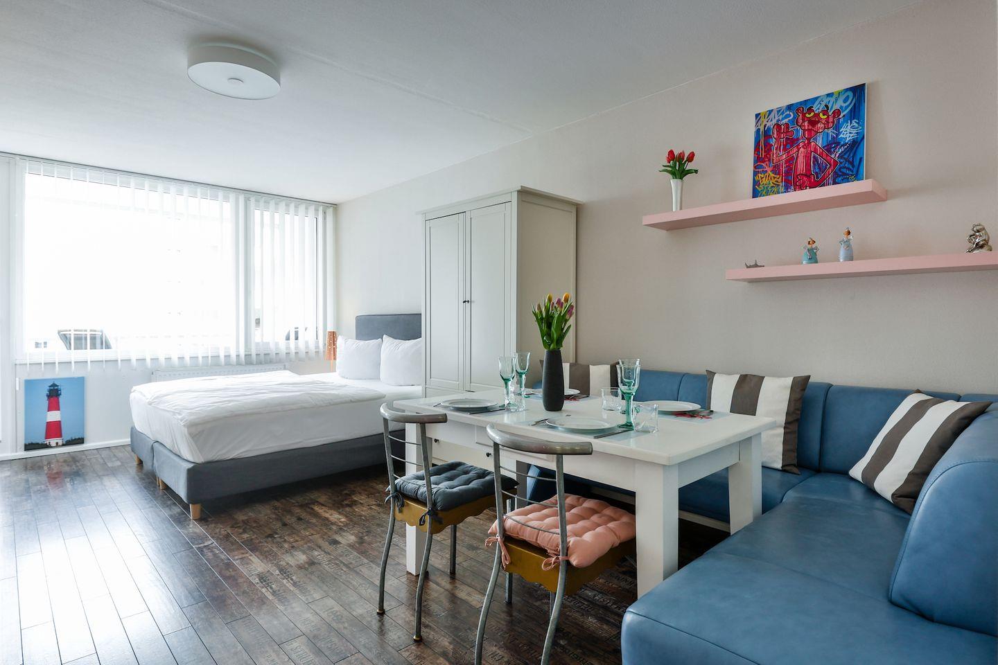 Gemütliche 1 Zimmer Wohnung auf 35 qm für 2 Personen in Westerland, mit gemütlichem Doppelboxspringbett (180x200 cm), vollausgestattete Küche, Bad mit Badewanne und Münzwaschmaschine-& trockner im Waschkeller. Die Wohnung befindet sich im Haus ,,Blanker Hans'' direkt in der Einkaufsstraße von Westerland und nur 200 m bis zum langen Sandstrand.