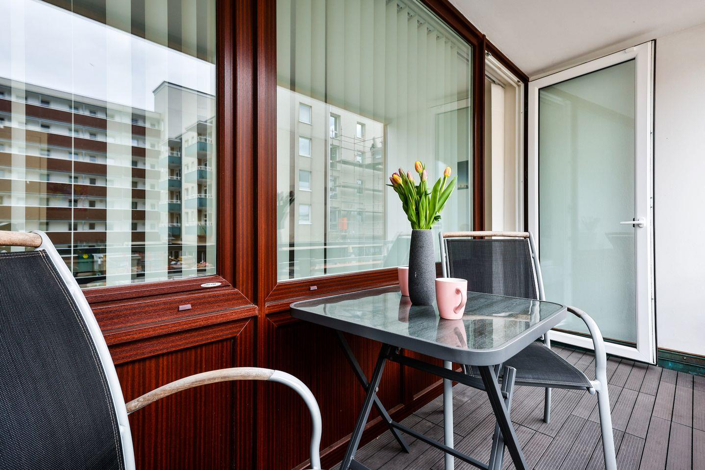 Der möblierte Balkon lädt zum Verweilen in der Sonne ein.