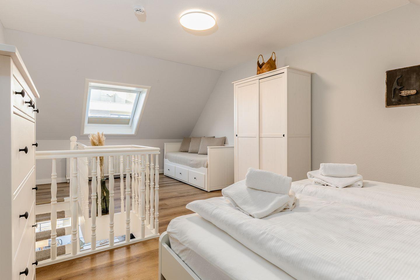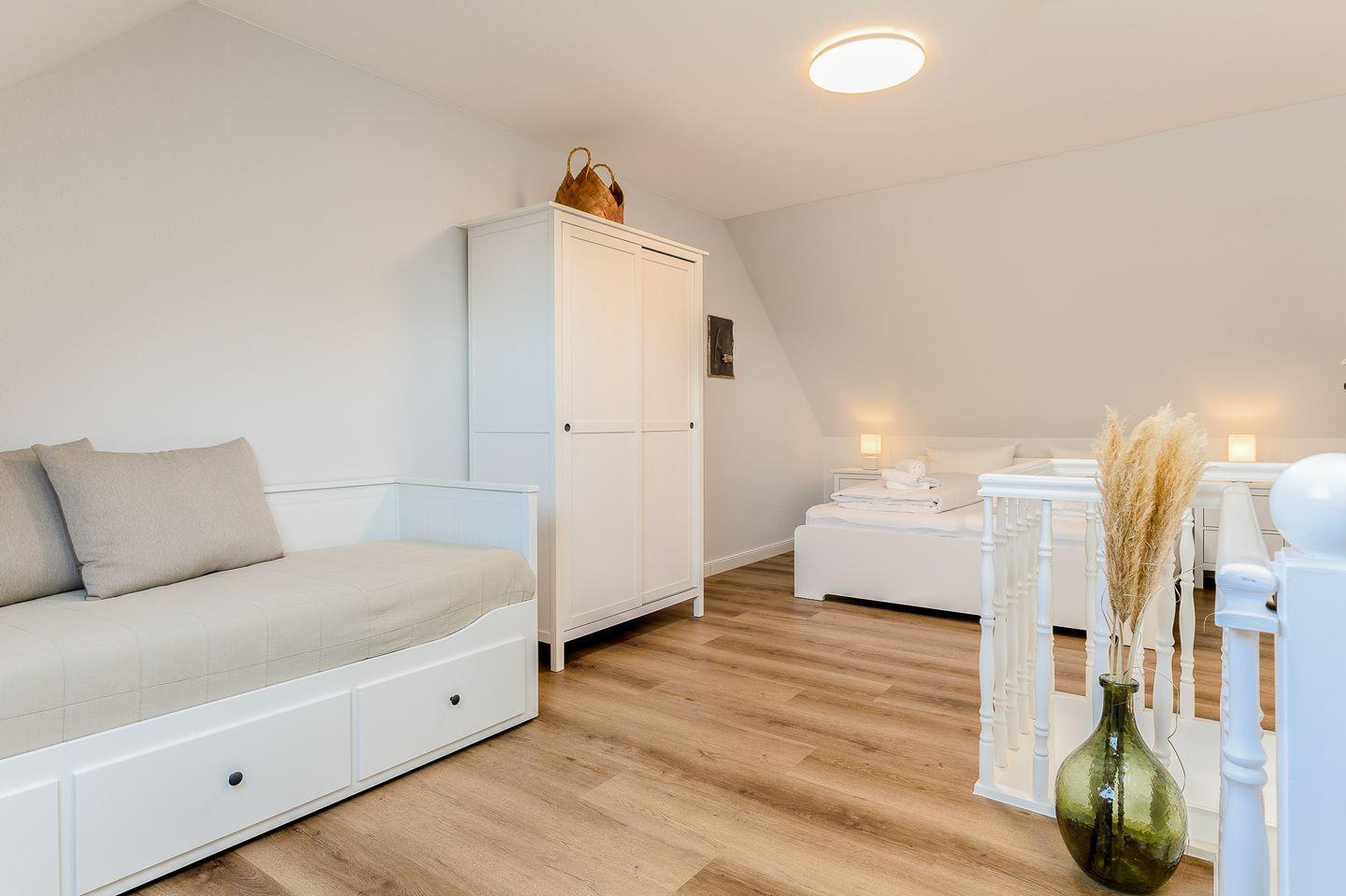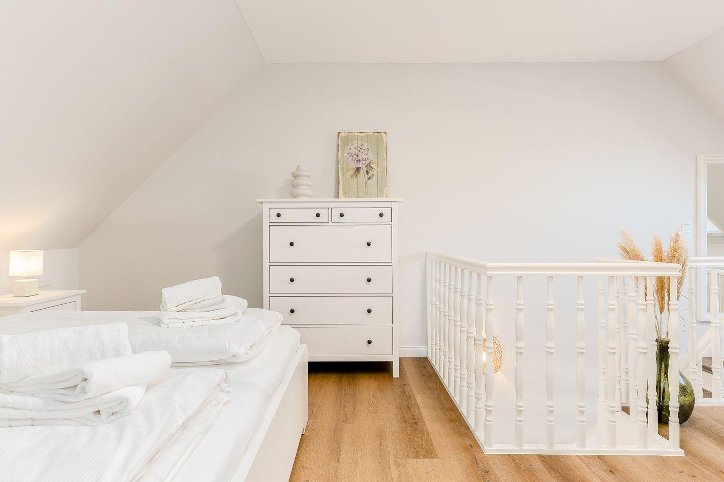 Im Wohnbereich ist allerdings noch viel Luft nach oben, denn über die Treppe geht es direkt ins ganz in Weiß gehaltene Schlafzimmer. Dort wartet ein gemütliches Doppelbett auf seine nächtlichen Besucher. Ein Einzelbett kann auf Anfrage für kleine Kinder hergerichtet werden.
