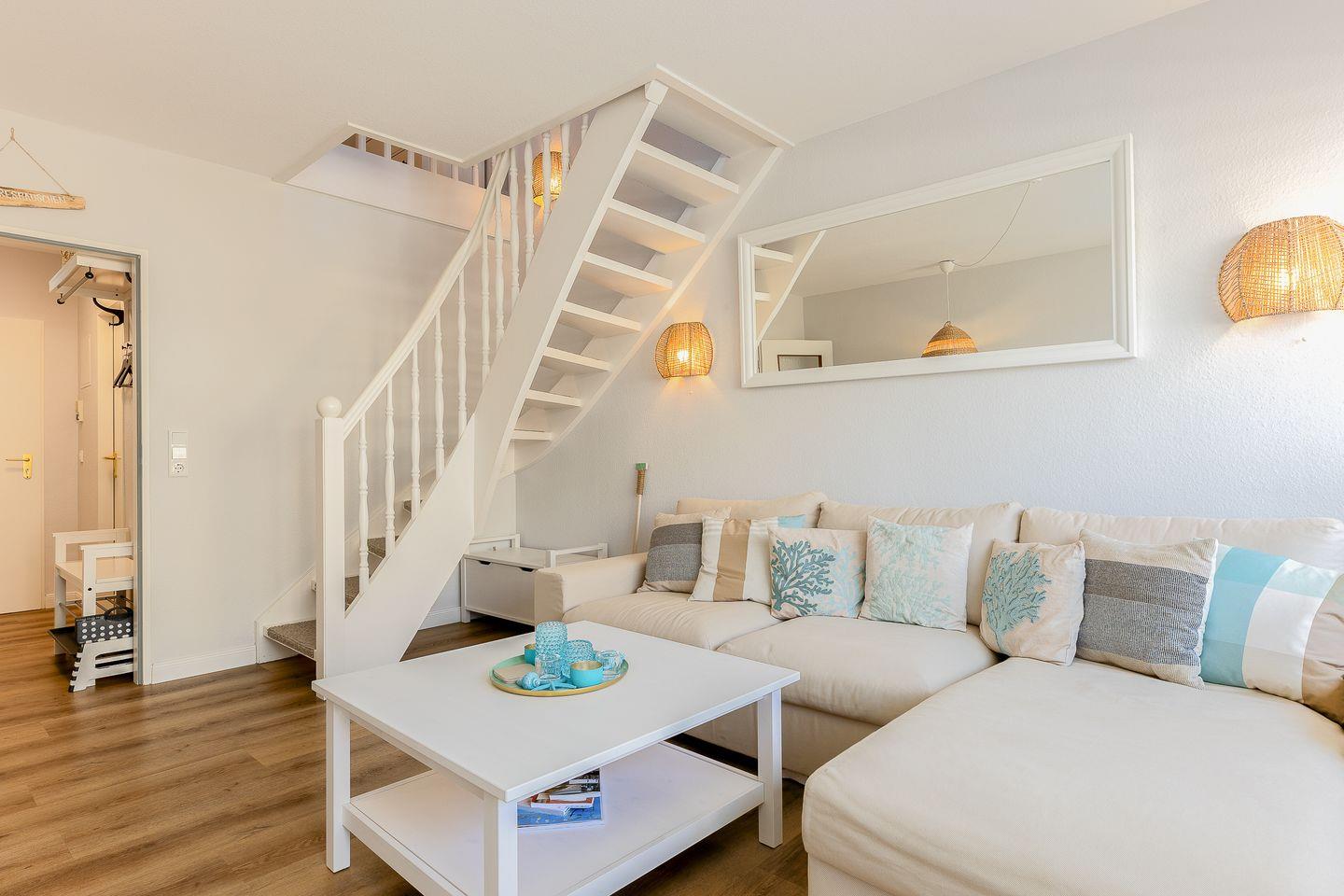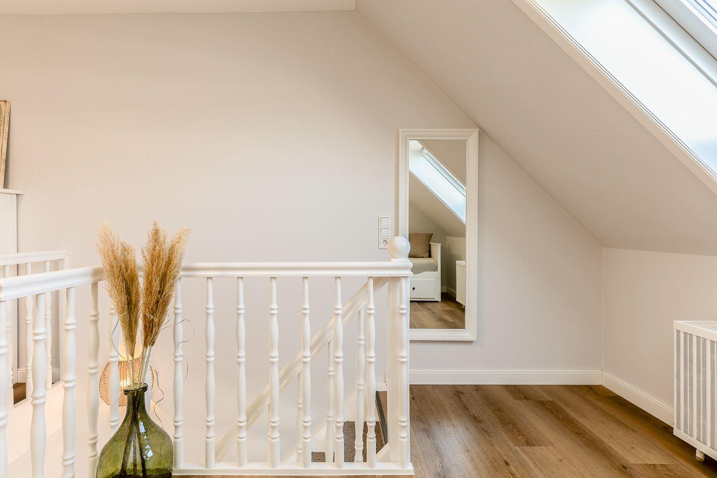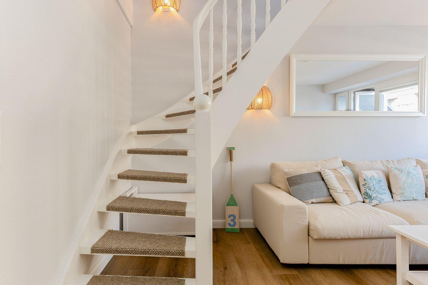 Im Wohnbereich ist allerdings noch viel Luft nach oben, denn über die Treppe geht es direkt ins ganz in Weiß gehaltene Schlafzimmer. Dort wartet ein gemütliches Doppelbett auf seine nächtlichen Besucher. Ein Einzelbett kann auf Anfrage für kleine Kinder hergerichtet werden.